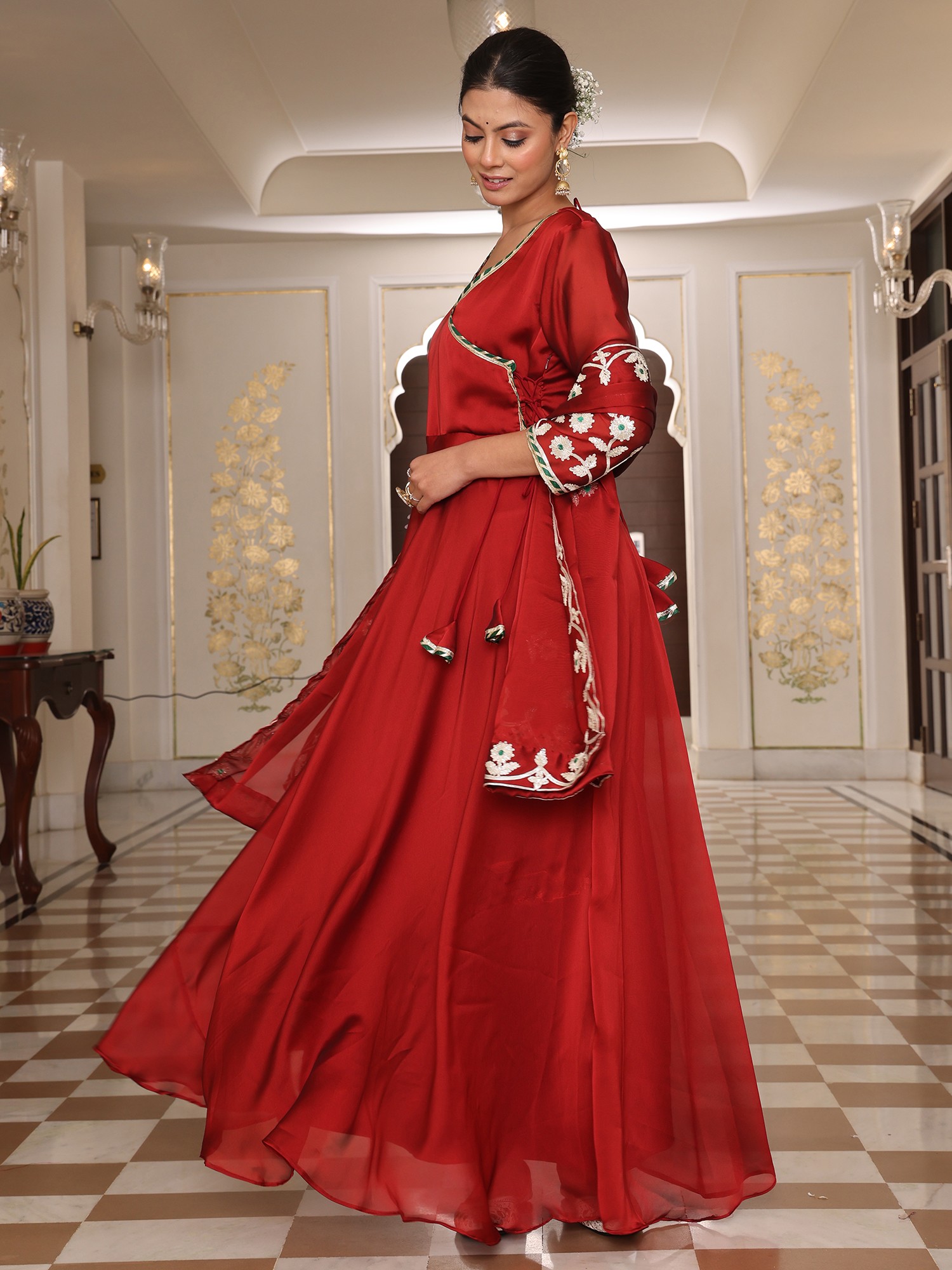 Rangoli Silk Anarkali Suit With Dupatta And Crepe Bottom Highlighted By Graceful Ribbon Work Embroidery