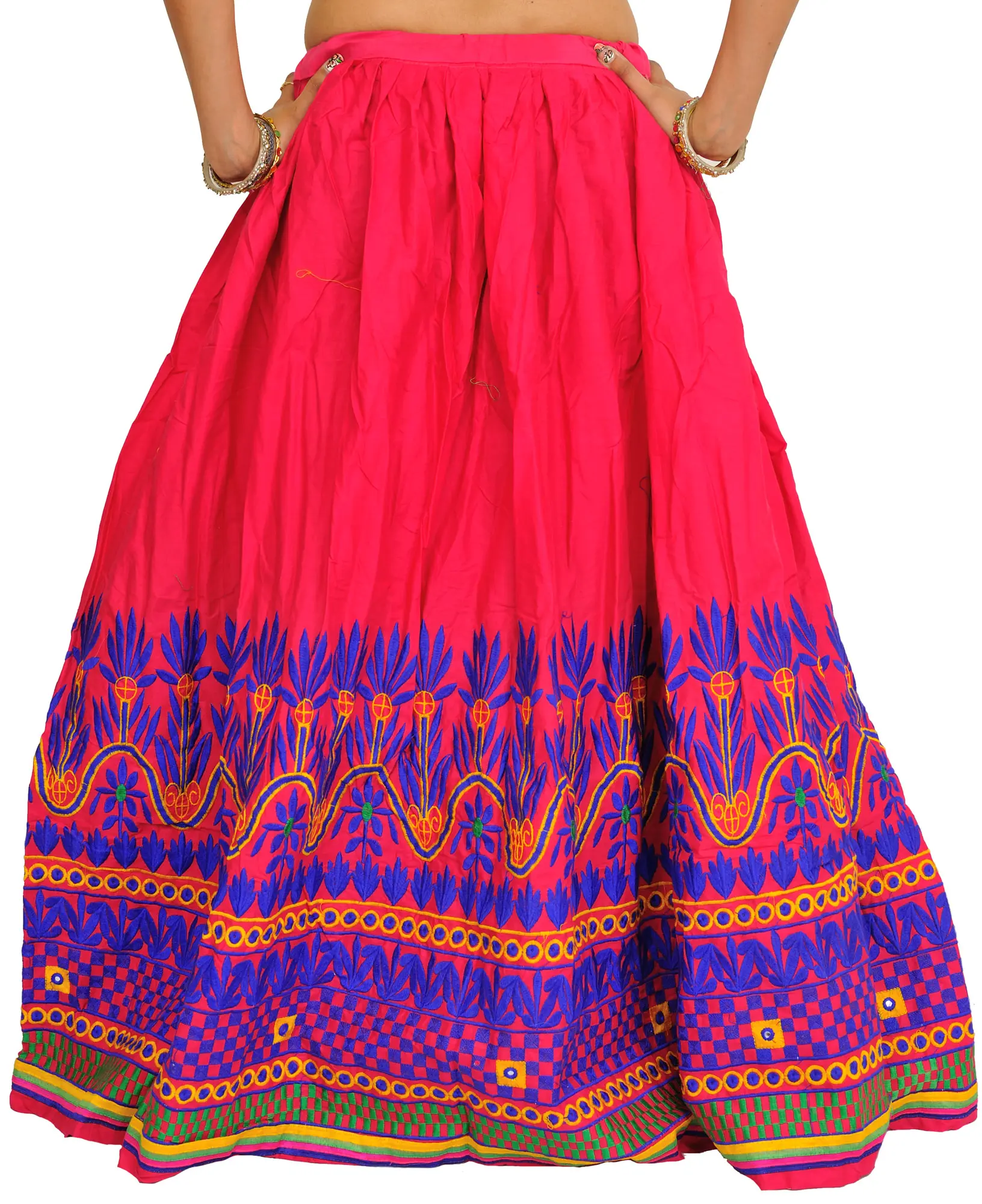Raspberry-Sorbet Ghagra Skirt from Gujarat with Embroidery on Border