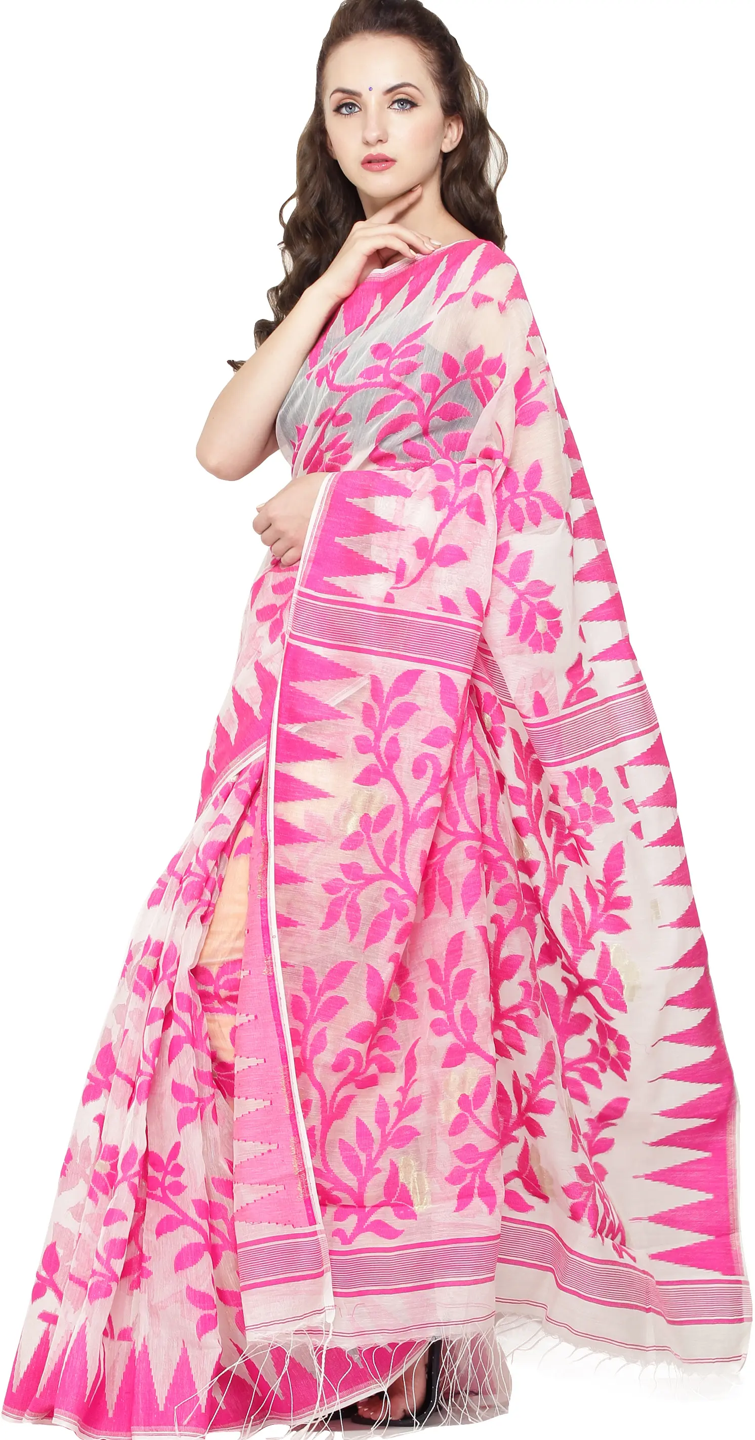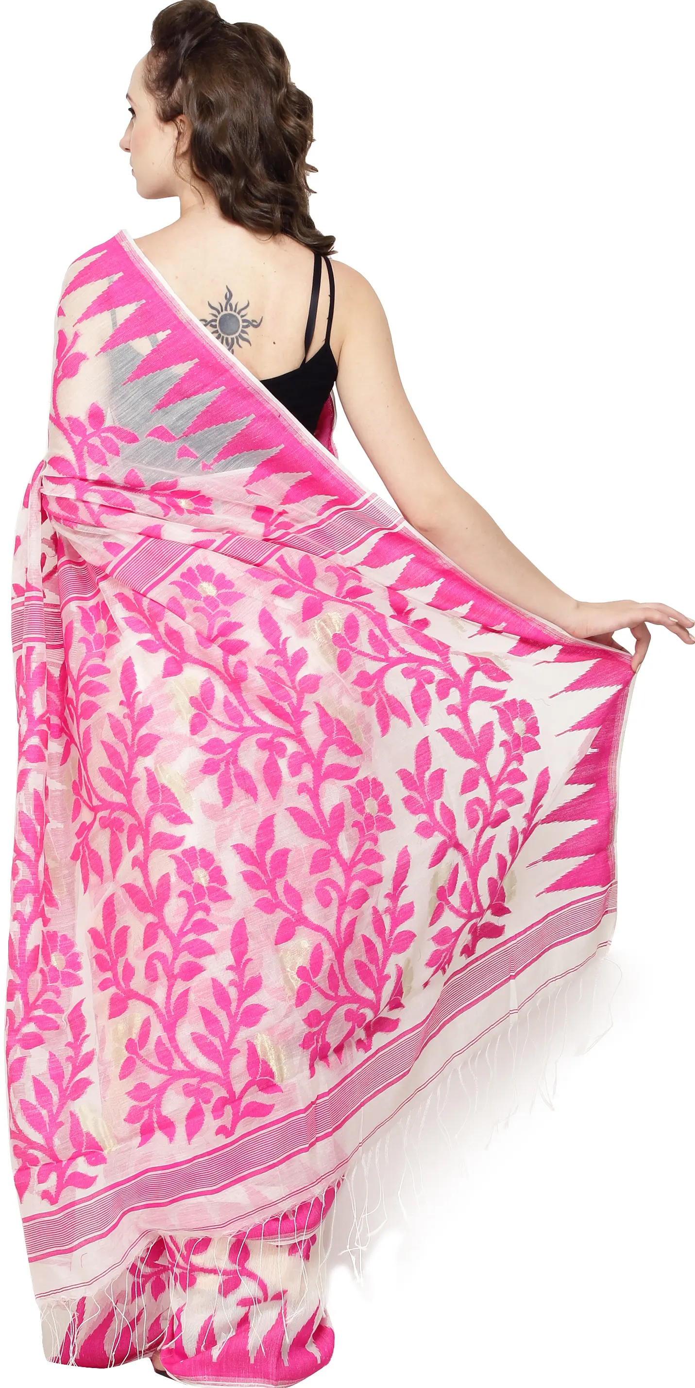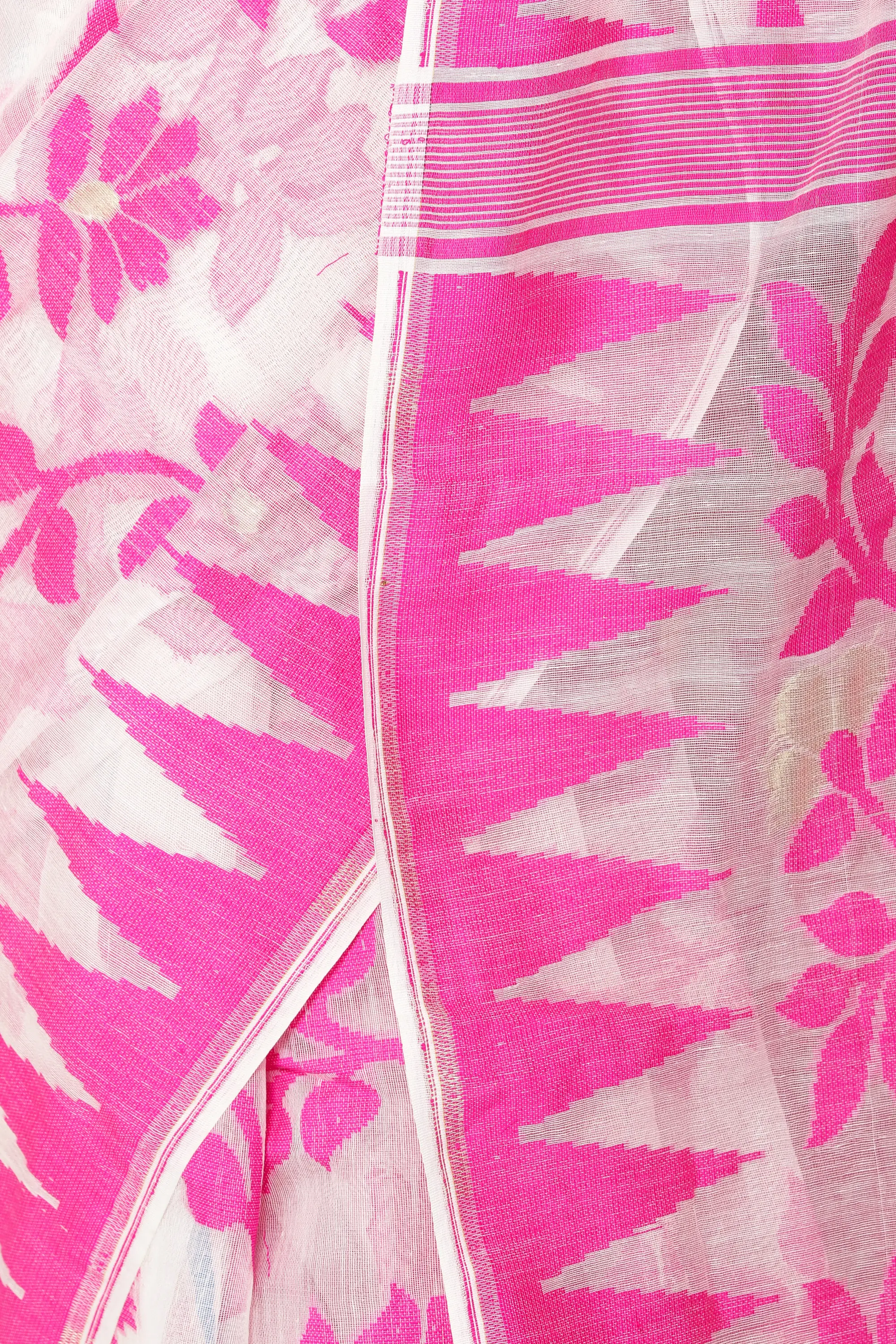 The Raspberry-Sorbet Jamdani Saree from Bangladesh is a masterpiece that captures the essence of contemporary fashion with a timeless twist. Its enchanting raspberry-sorbet hue is a testament to the beauty of color choice in Jamdani. Adorned with intricate temple borders and bold floral motifs that sprawl gracefully across the entire drape, this saree is a celebration of artistry. The floral weave, a symbol of elegance and tradition, suits even the most subtle fashion tastes. With its harmonious blend of classic and modern, this Jamdani saree is a testament to the enduring allure of this exquisite textile, making it perfect for any occasion.