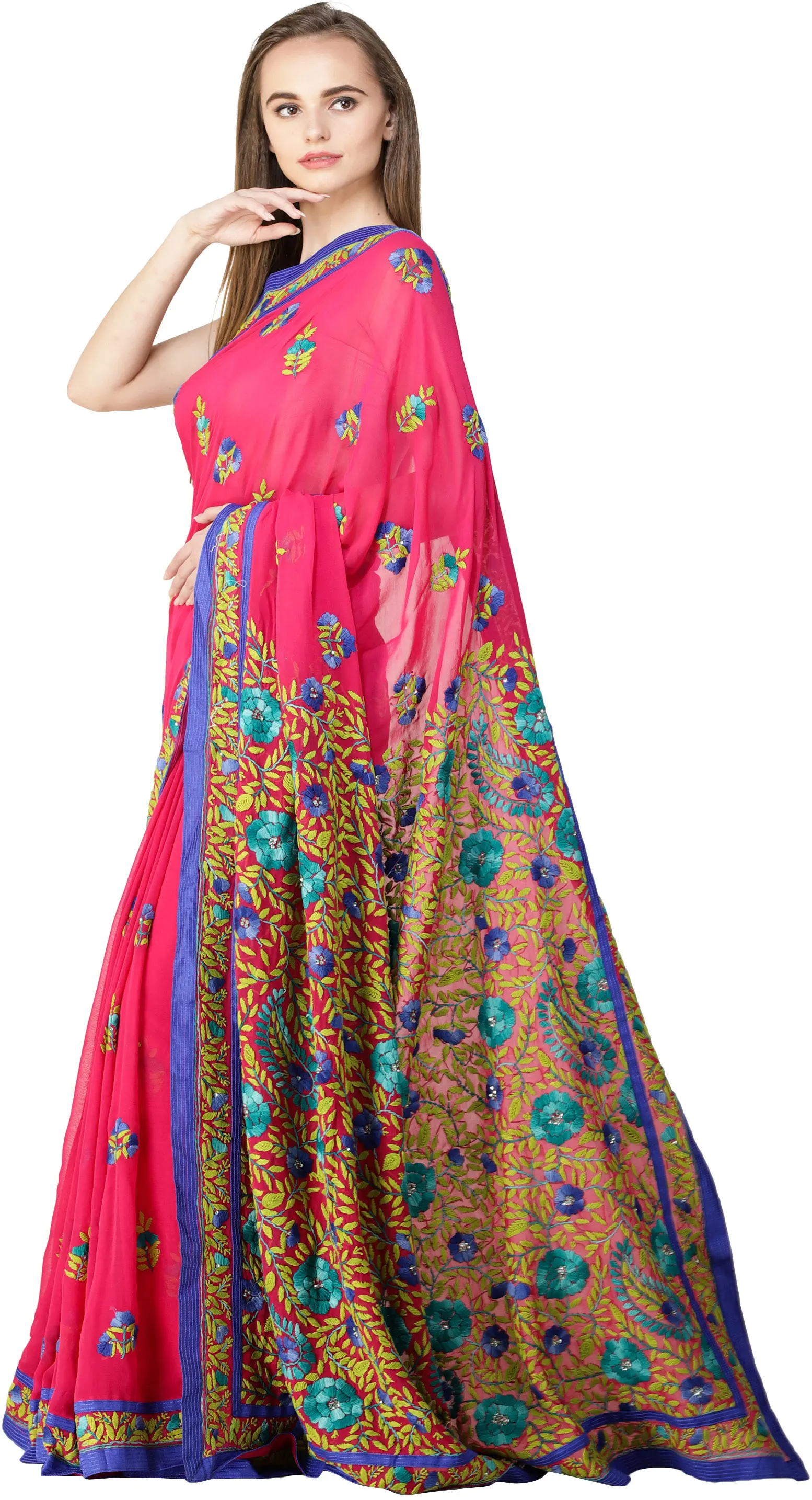 Crafted from premium georgette fabric, this saree offers an unparalleled drape and a luxuriously soft feel against the skin. Georgette is celebrated for its lightweight nature, subtle sheen, and fluid movement, making it an ideal choice for traditional Indian attire. The semi-sheer quality of the fabric adds an element of delicate sophistication, allowing the vibrant embroidery to truly stand out. Whether you're attending a wedding, a festive celebration, or a special occasion, this georgette saree will ensure you make a memorable entrance, combining comfort with breathtaking style. Its effortless elegance makes it a versatile addition to any discerning wardrobe, promising to be a cherished piece for years to come.