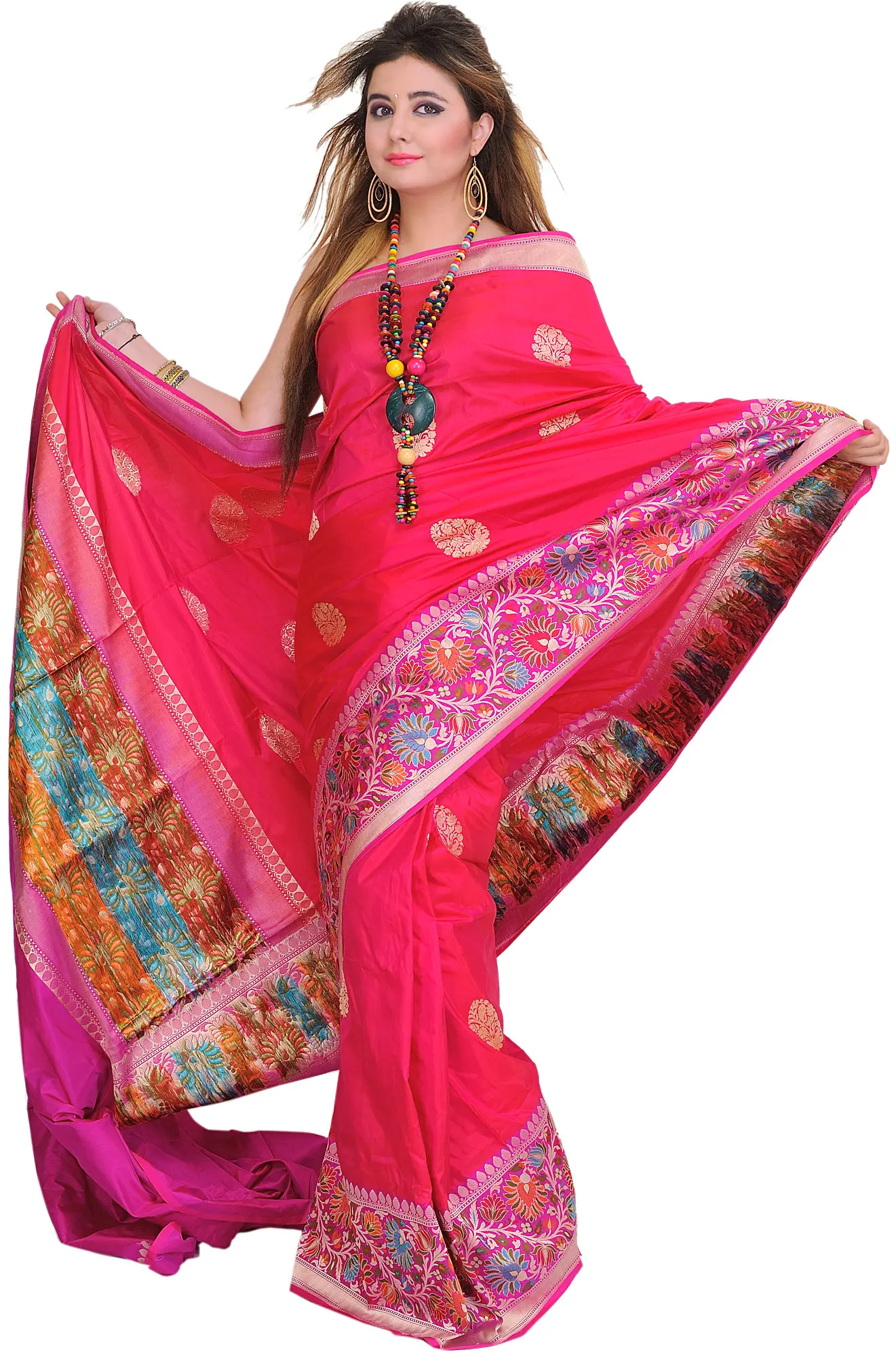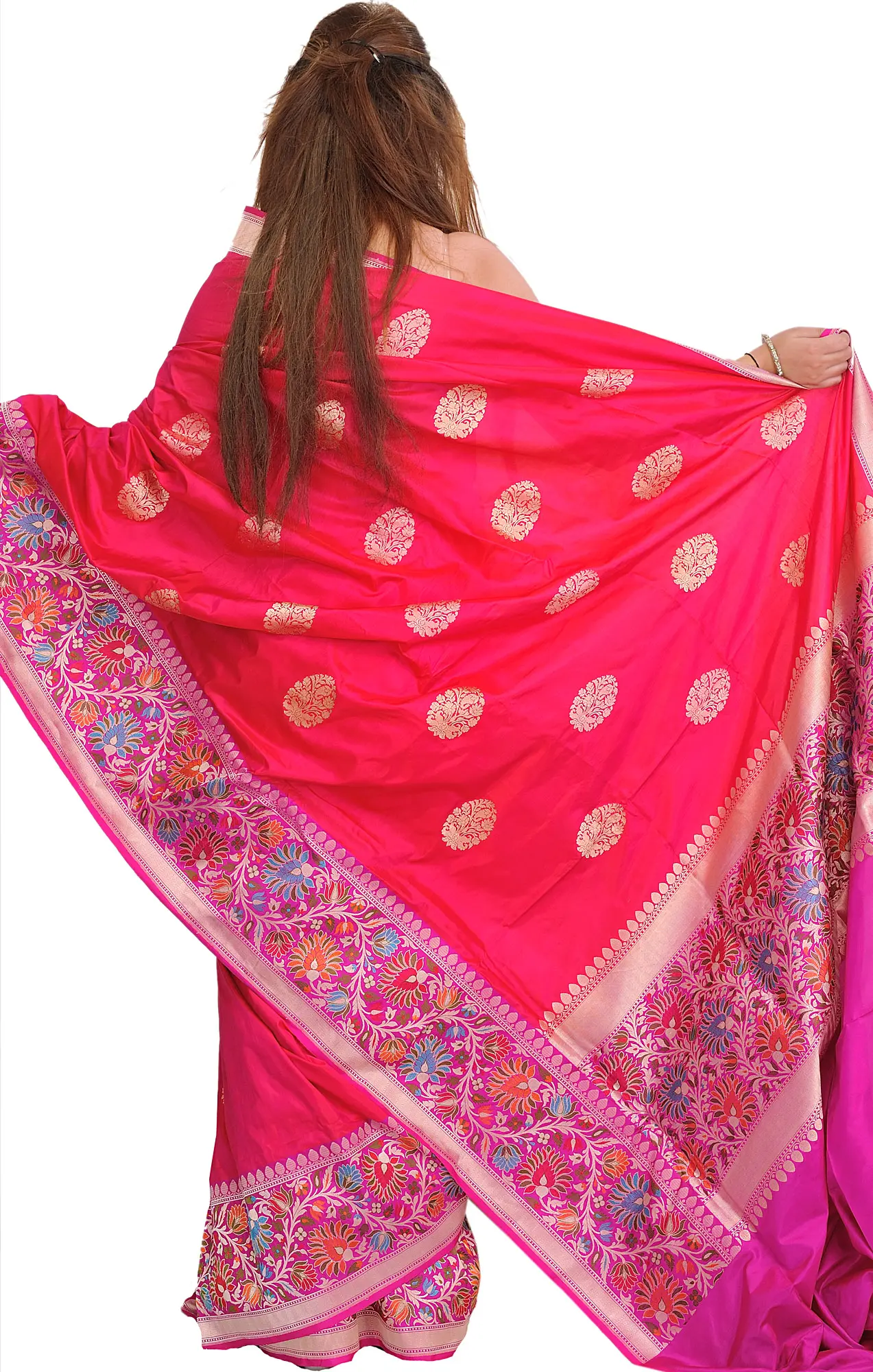 A queenly pink rule the silk of this Raspberry-Sorbet saree from Banaras, which is a masterpiece from the house of Banarasi weavers. The field is covered in brocaded floral Butas, accompanied by a Kadhwa border. A Kadhwa or Kadua border is an intricate pattern woven into the silk fabric, tediously, using several threads to create an ornate pattern, which gives the Banarasi sarees their quintessential glimmer and luxurious feel. A rich Phool bel or floral vine flows on the border, continuing on the pallu to craft an enchanting gem of an attire.