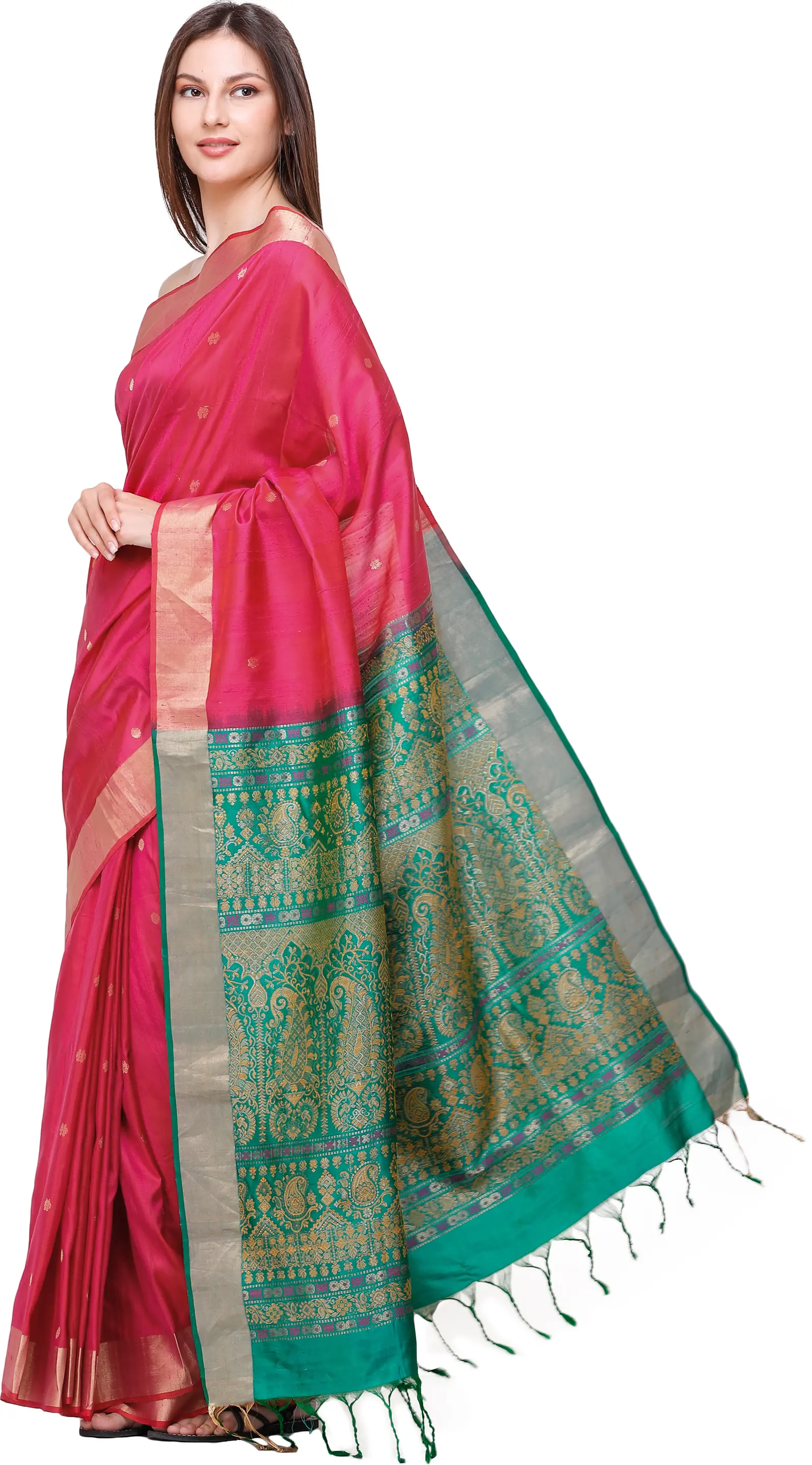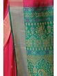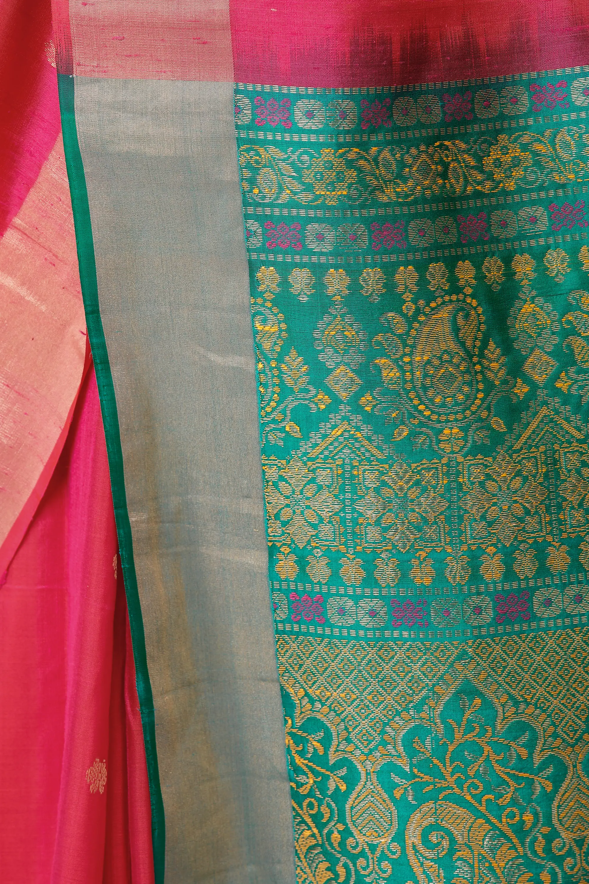 What truly elevates this Uppada saree to a realm of opulence is its magnificent border. This striking contrast to the gentle raspberry hue is a tapestry of intricate zari work on a deep emerald green background. The zari, a shimmering thread typically made of gold or silver, is woven with incredible precision to create elaborate patterns. Traditional motifs, including the iconic paisley (mango) design, are rendered in stunning detail, interspersed with geometric patterns and floral elements. This rich border creates a dramatic frame, highlighting the softness of the silk body and drawing the eye to the masterful weaving. The play of light on the zari threads adds a dazzling sparkle, making this saree perfect for evening events and festive gatherings. The emerald green provides a deep, grounding counterpoint to the bright raspberry, creating a harmonious and visually arresting color combination. The tassels on the pallu, also in a matching green, add a final flourish of traditional elegance.