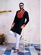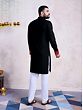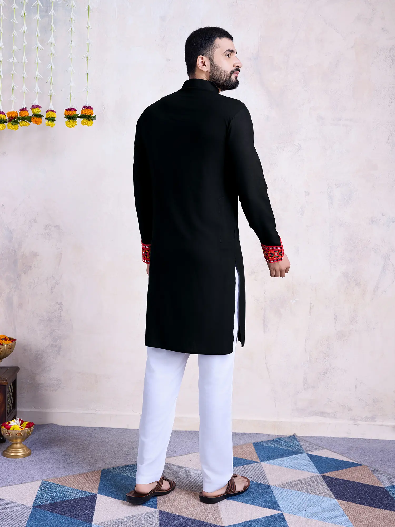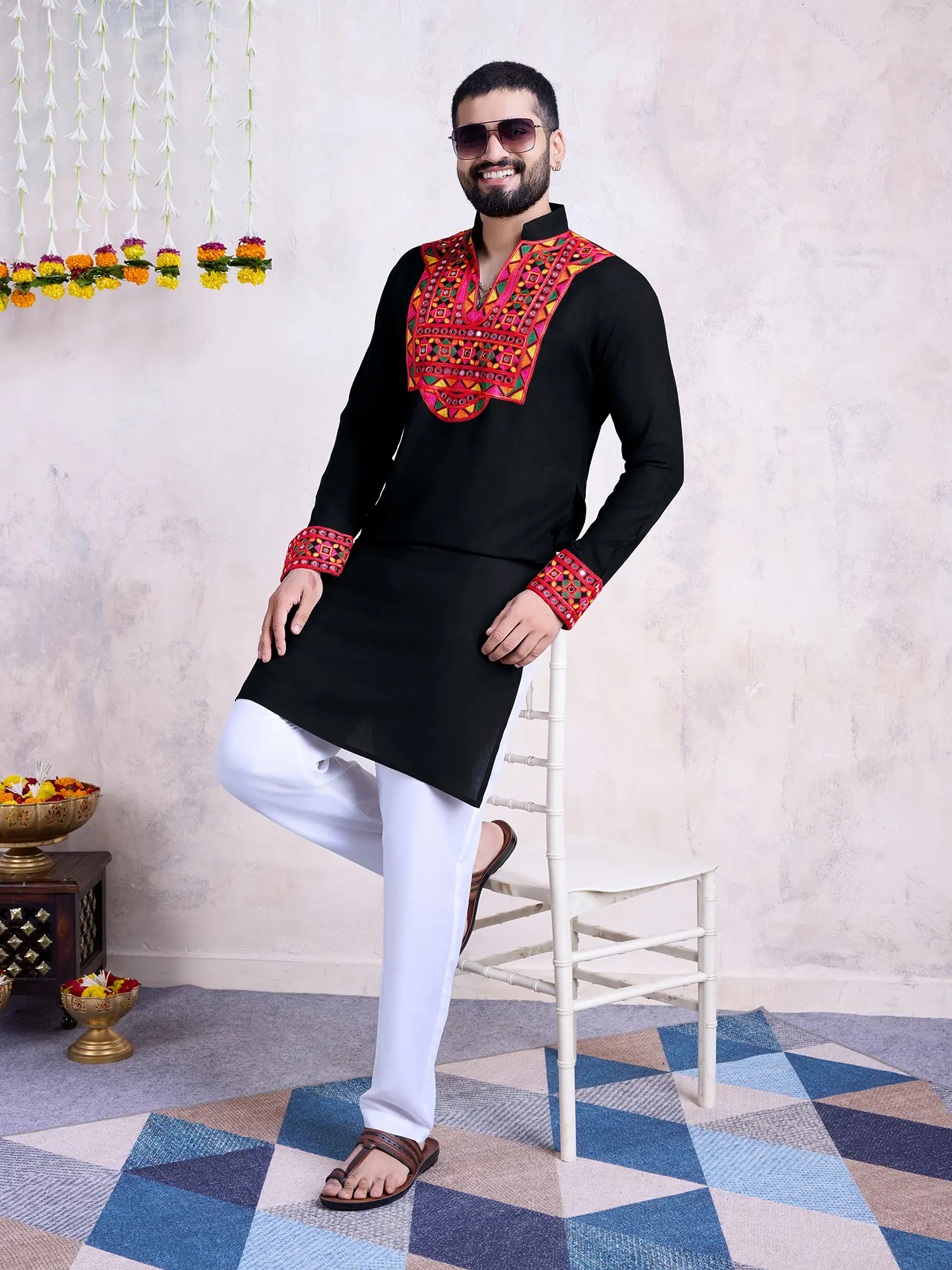 The classic black kurta provides a versatile foundation for your festive attire. The vibrant embroidery adds a pop of color without being overwhelming, making it suitable for a range of occasions and personal styles. This kurta effortlessly blends tradition with modern style, allowing you to express your individuality while remaining impeccably dressed. It's the perfect garment to showcase your refined taste and appreciation for exquisite craftsmanship.