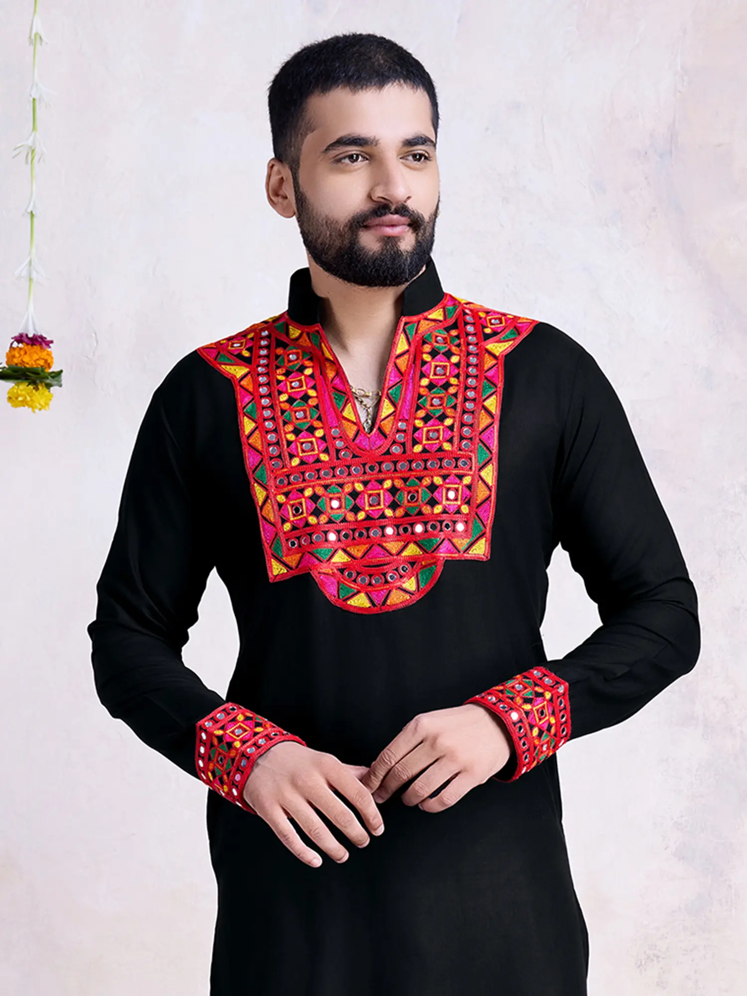 This isn't just a kurta; it's a statement piece. Crafted from luxurious rayon, this designer kurta exudes sophistication and style, perfect for any festive occasion. The rich black fabric provides a striking backdrop for the vibrant, hand-embroidered detail, featuring intricate mirror work that catches the light with every movement. This kurta is the perfect blend of traditional craftsmanship and modern aesthetics. The comfortable rayon fabric ensures you'll feel as good as you look, making it ideal for hours of celebration and enjoyment. Elevate your festive look with this unique and stylish garment.
