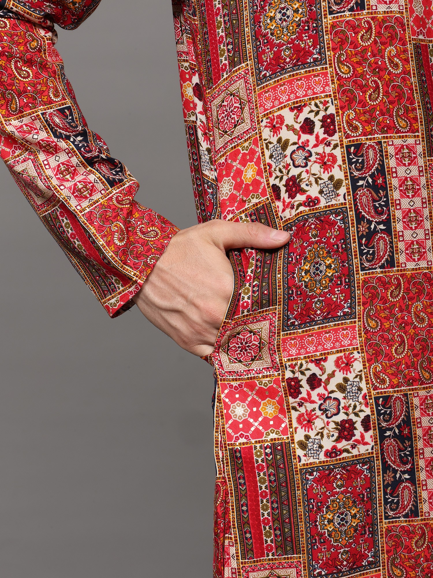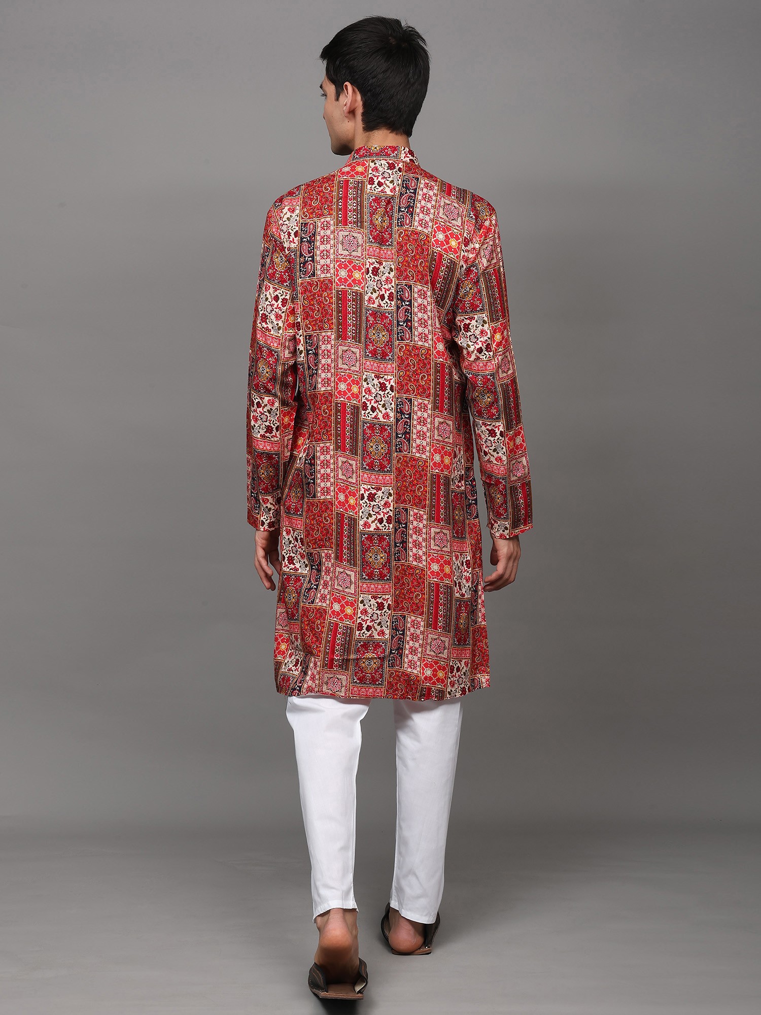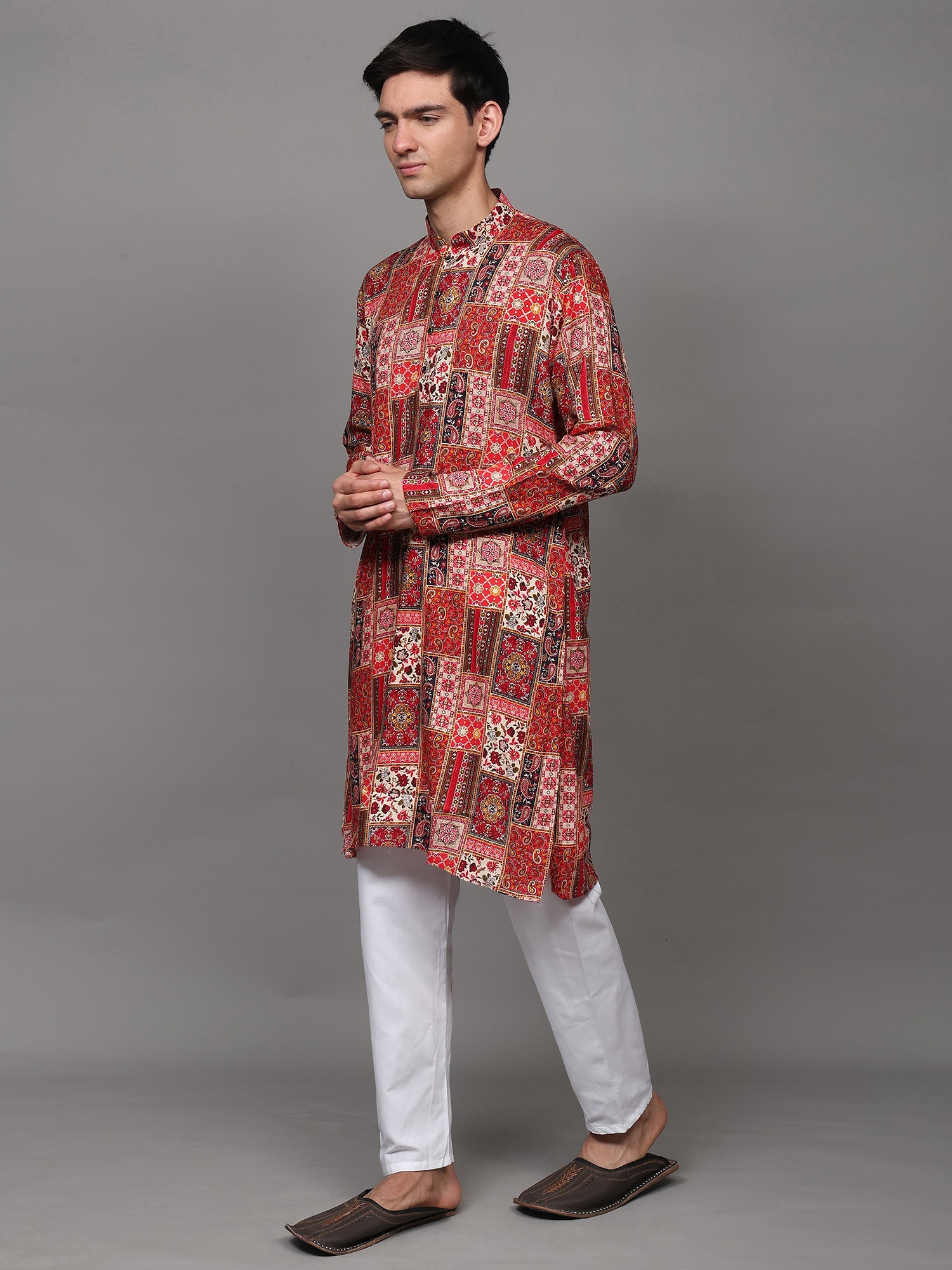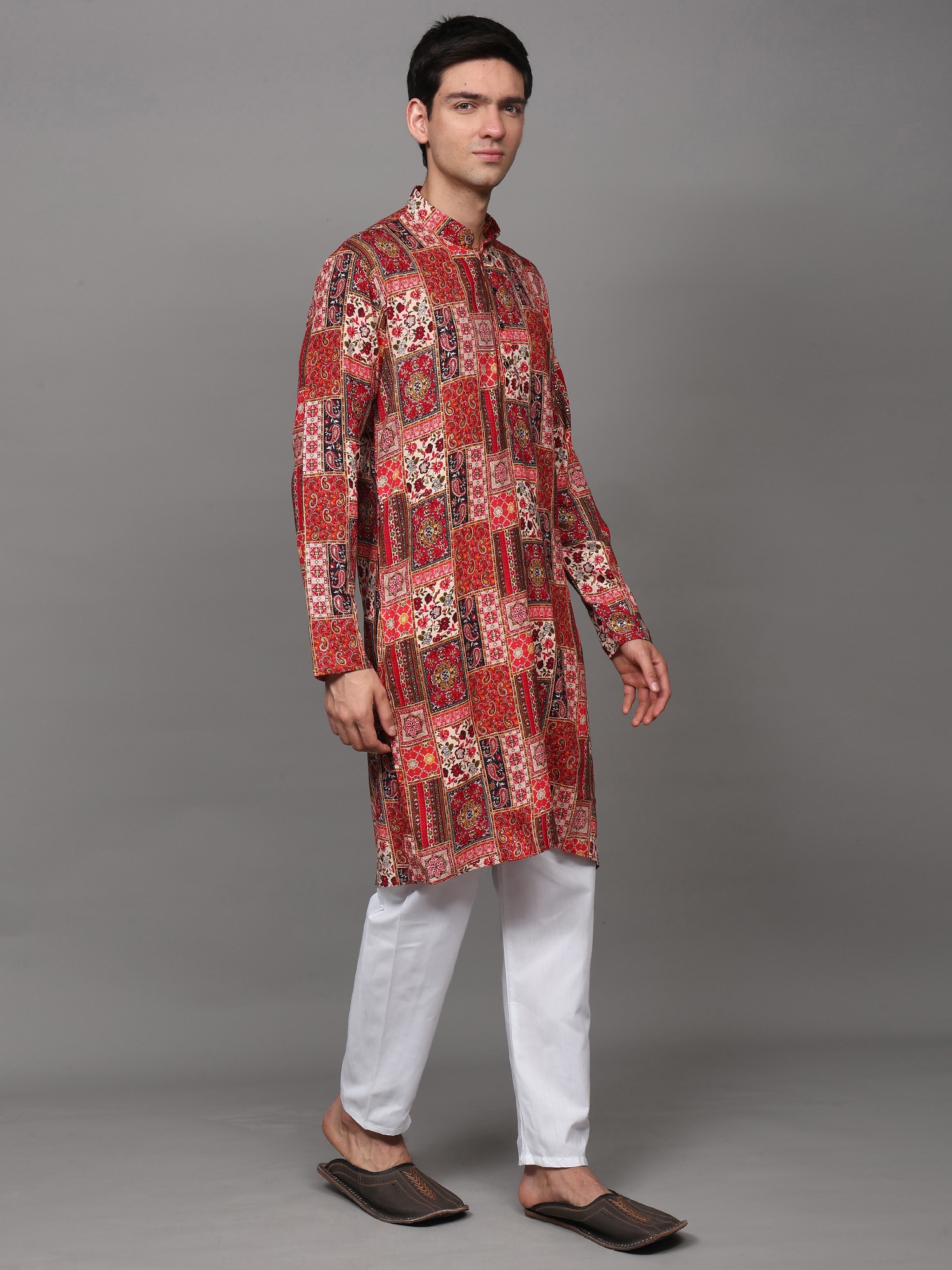 Printed Multi-Colored Kurta Pajama Set with Embroidery in Self-Colored Thread