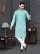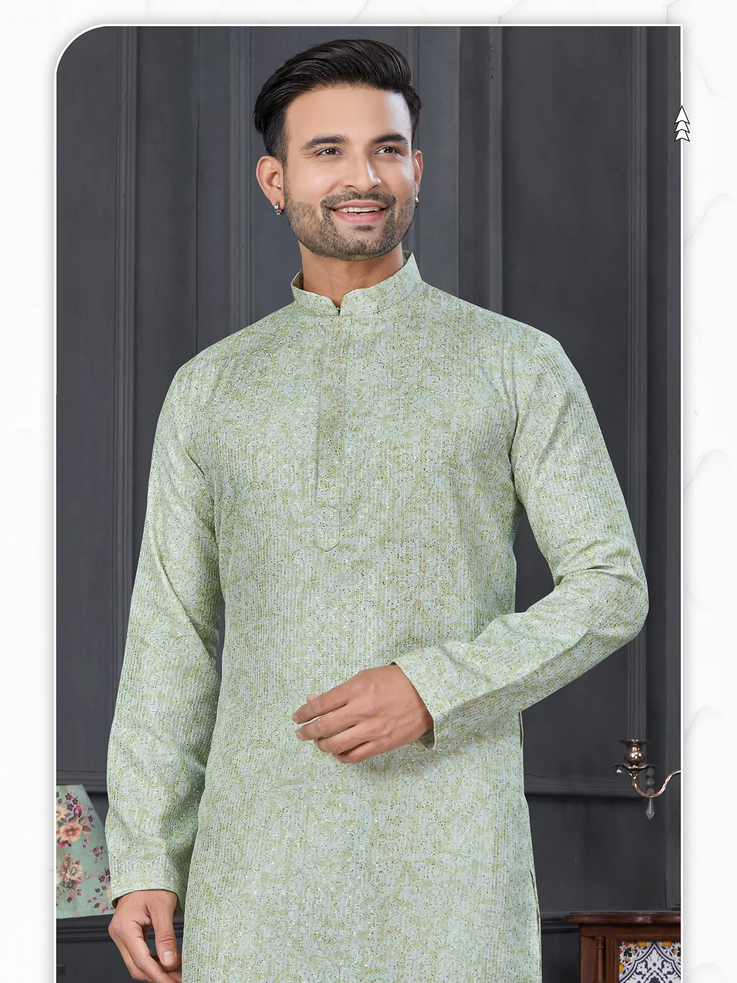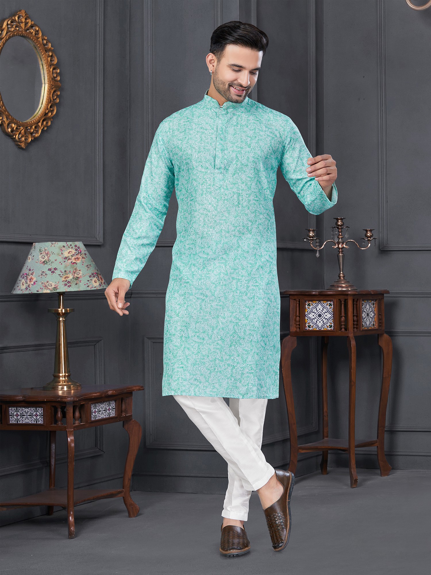 Step into the spotlight with this elegant kurta pajama set, perfect for festive celebrations or adding a touch of sophistication to your everyday style. The kurta features a classic straight cut that flatters all body types, ensuring a comfortable and confident fit. The soothing color palette brings a sense of calm and tranquility, while the intricate print adds a subtle yet captivating visual appeal. The design is contemporary yet steeped in tradition, making it a versatile addition to your wardrobe. Crafted with meticulous attention to detail, this set exudes quality and refinement. The mandarin collar adds a touch of regal charm, while the full sleeves provide ample coverage and a polished look. The matching pajama complements the kurta perfectly, creating a cohesive and harmonious ensemble. This set is designed to make you feel both comfortable and stylish, allowing you to move with ease and confidence.