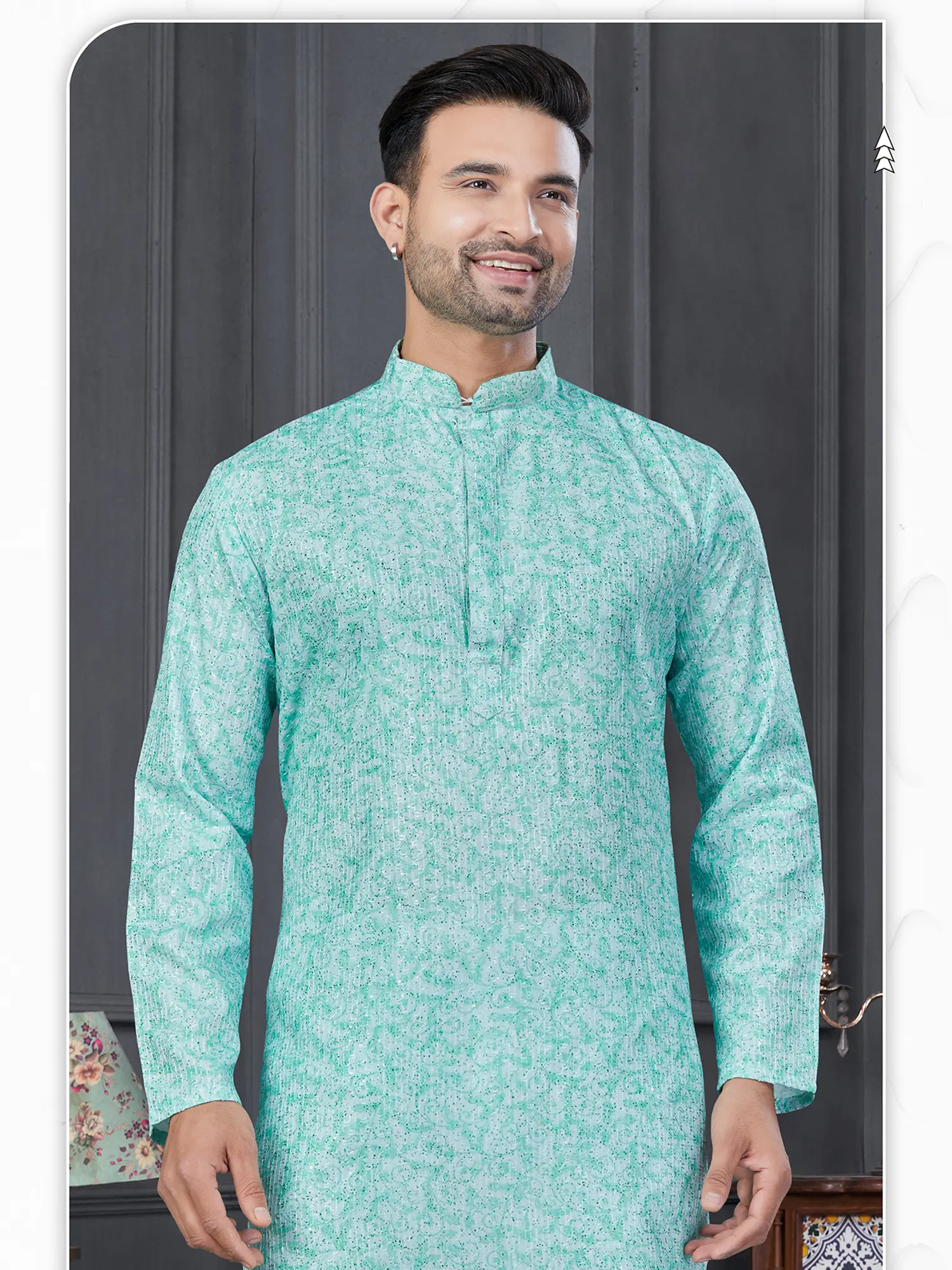 Step into the spotlight with this elegant kurta pajama set, perfect for festive celebrations or adding a touch of sophistication to your everyday style. The kurta features a classic straight cut that flatters all body types, ensuring a comfortable and confident fit. The soothing color palette brings a sense of calm and tranquility, while the intricate print adds a subtle yet captivating visual appeal. The design is contemporary yet steeped in tradition, making it a versatile addition to your wardrobe. Crafted with meticulous attention to detail, this set exudes quality and refinement. The mandarin collar adds a touch of regal charm, while the full sleeves provide ample coverage and a polished look. The matching pajama complements the kurta perfectly, creating a cohesive and harmonious ensemble. This set is designed to make you feel both comfortable and stylish, allowing you to move with ease and confidence.