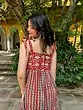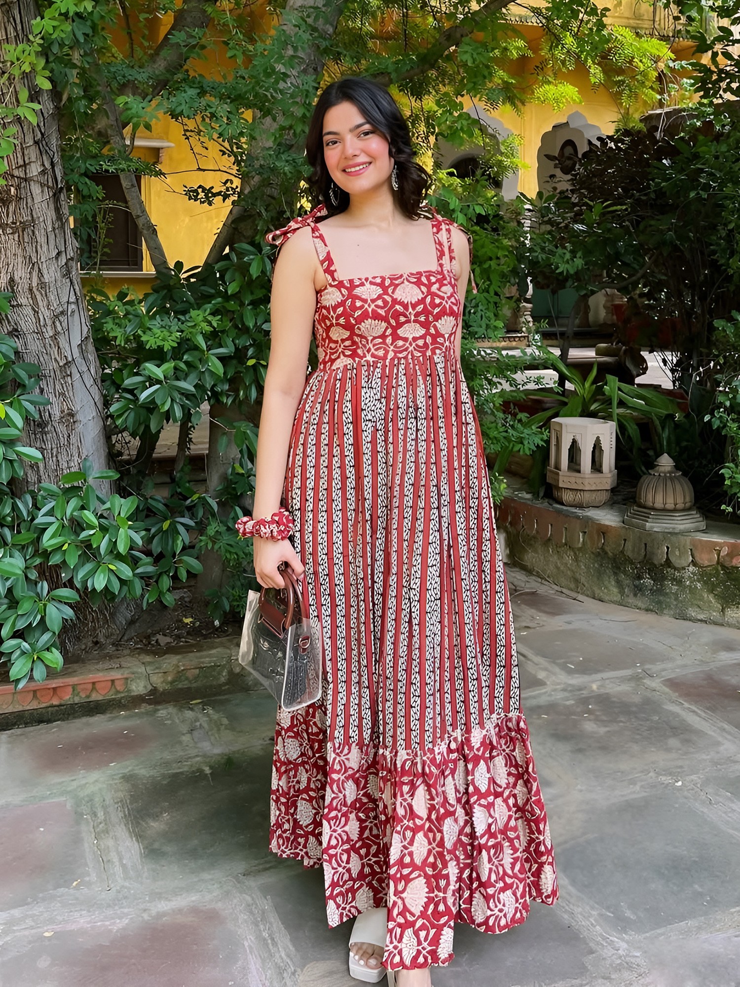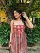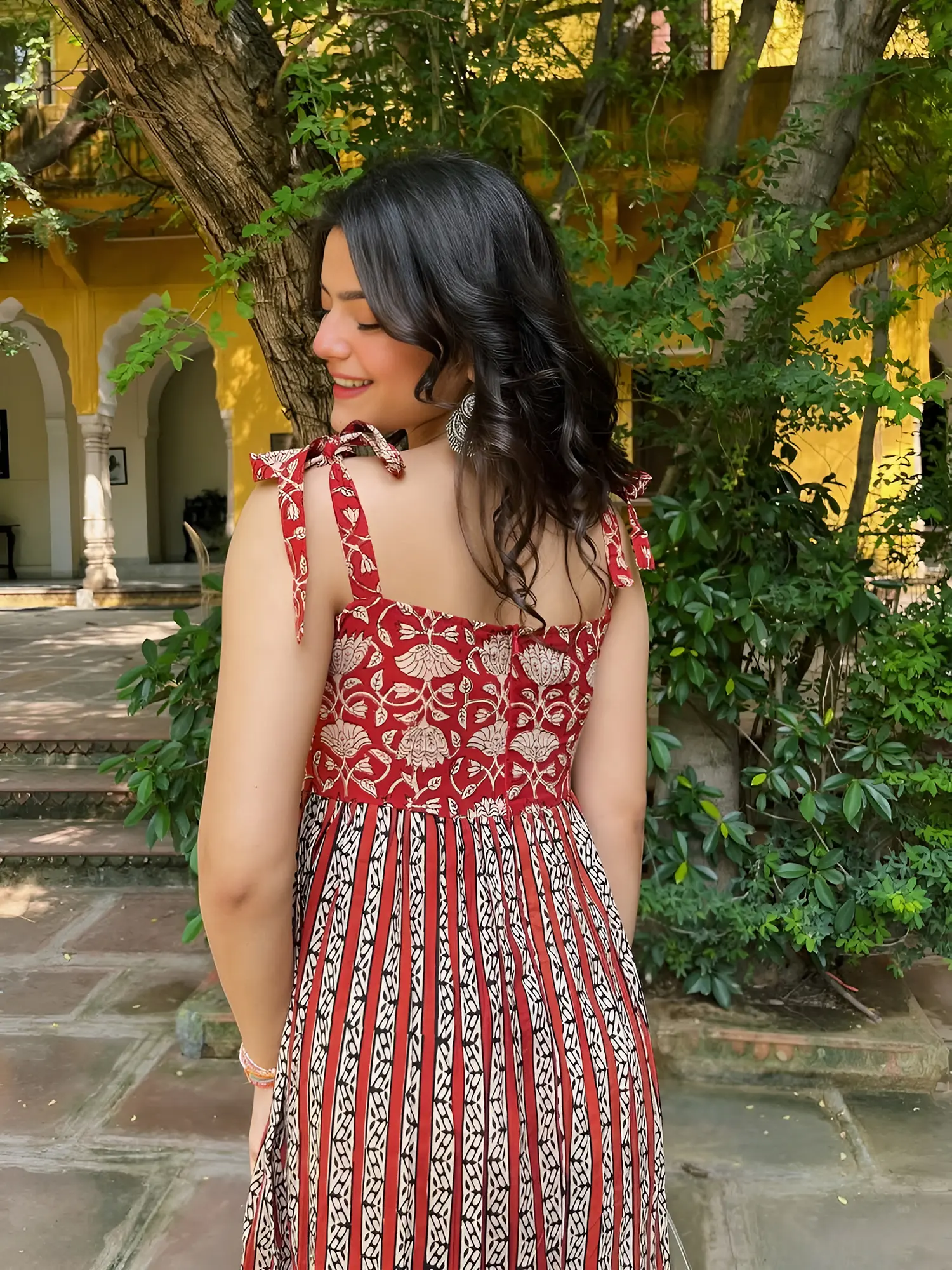 The rich rayon fabric ensures a soft, breathable feel against your skin, making it an ideal choice for all-day wear. The captivating print, a harmonious fusion of vertical stripes and delicate floral motifs, exudes a bohemian yet refined aesthetic. The square neckline is elegantly framed by tie-up straps, allowing for adjustable comfort and a personalized fit. The gentle gathering at the bodice transitions seamlessly into the voluminous flare, creating a dynamic and eye-catching design. The tiered hemline, adorned with a contrasting floral print, adds an extra layer of visual interest and movement, making this dress a true masterpiece.