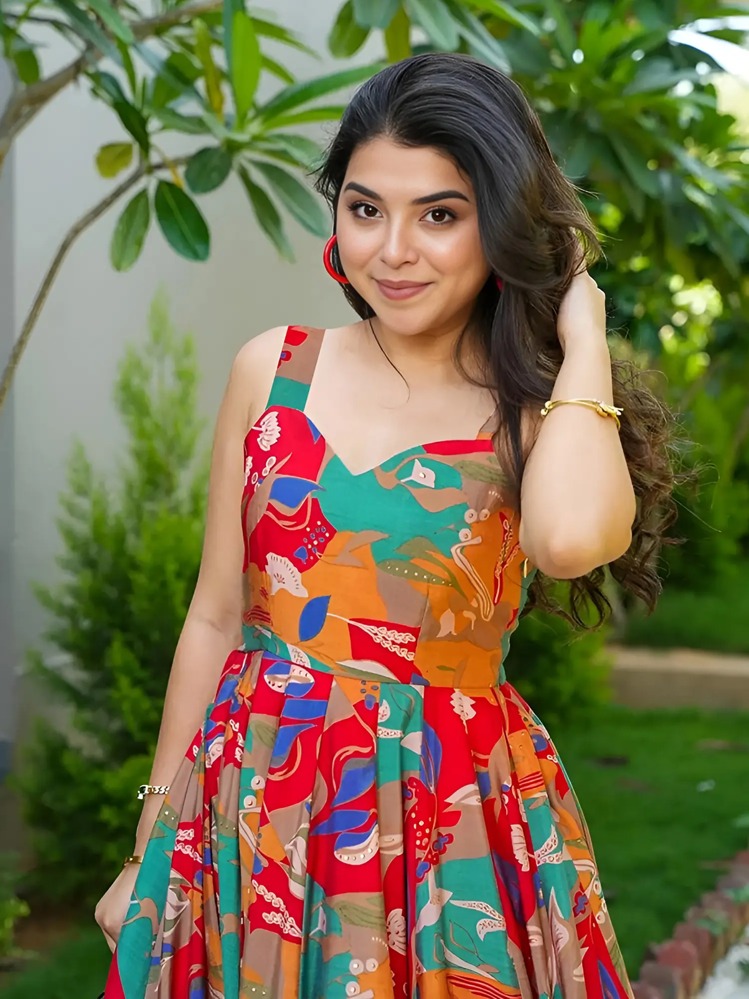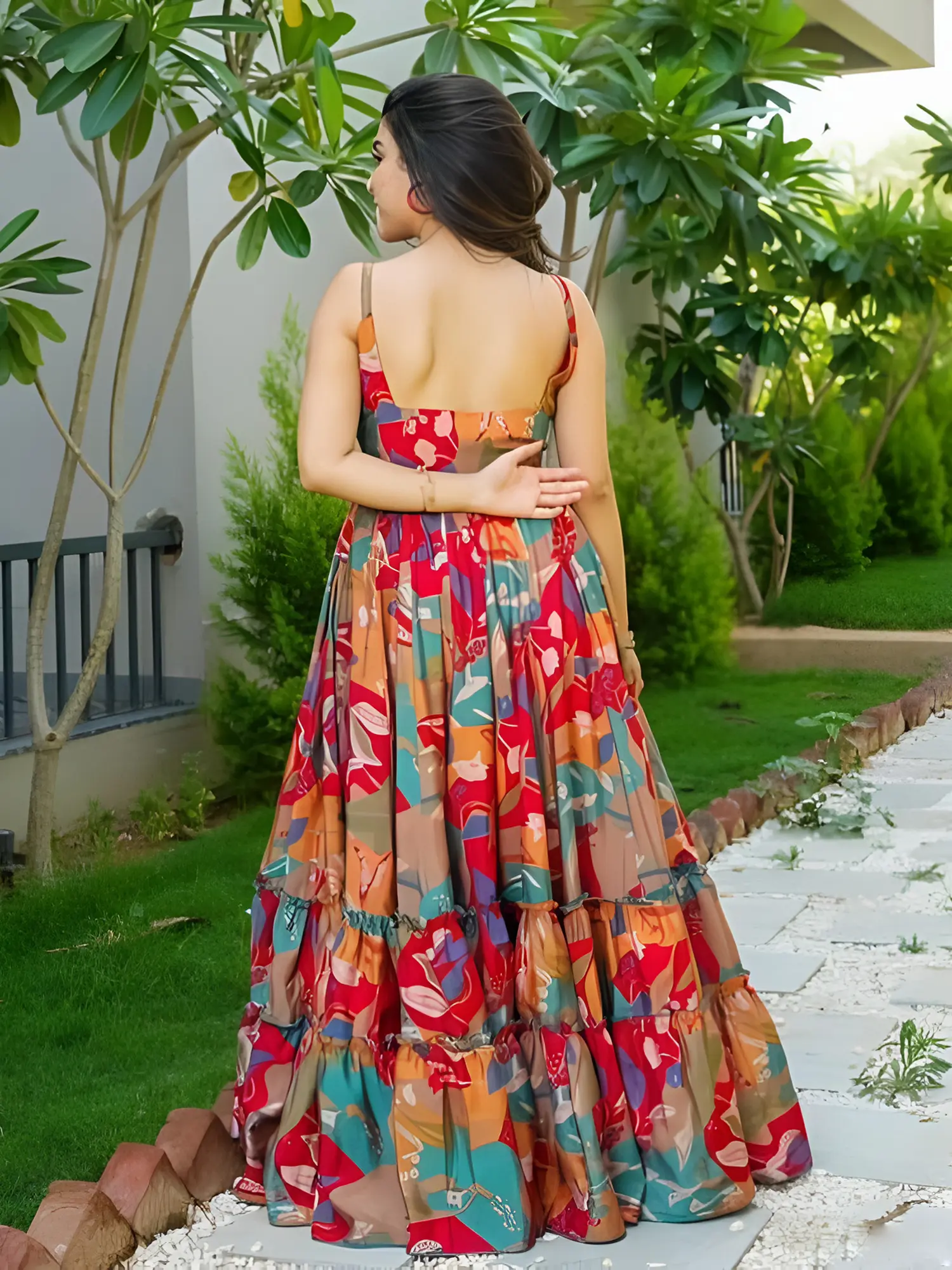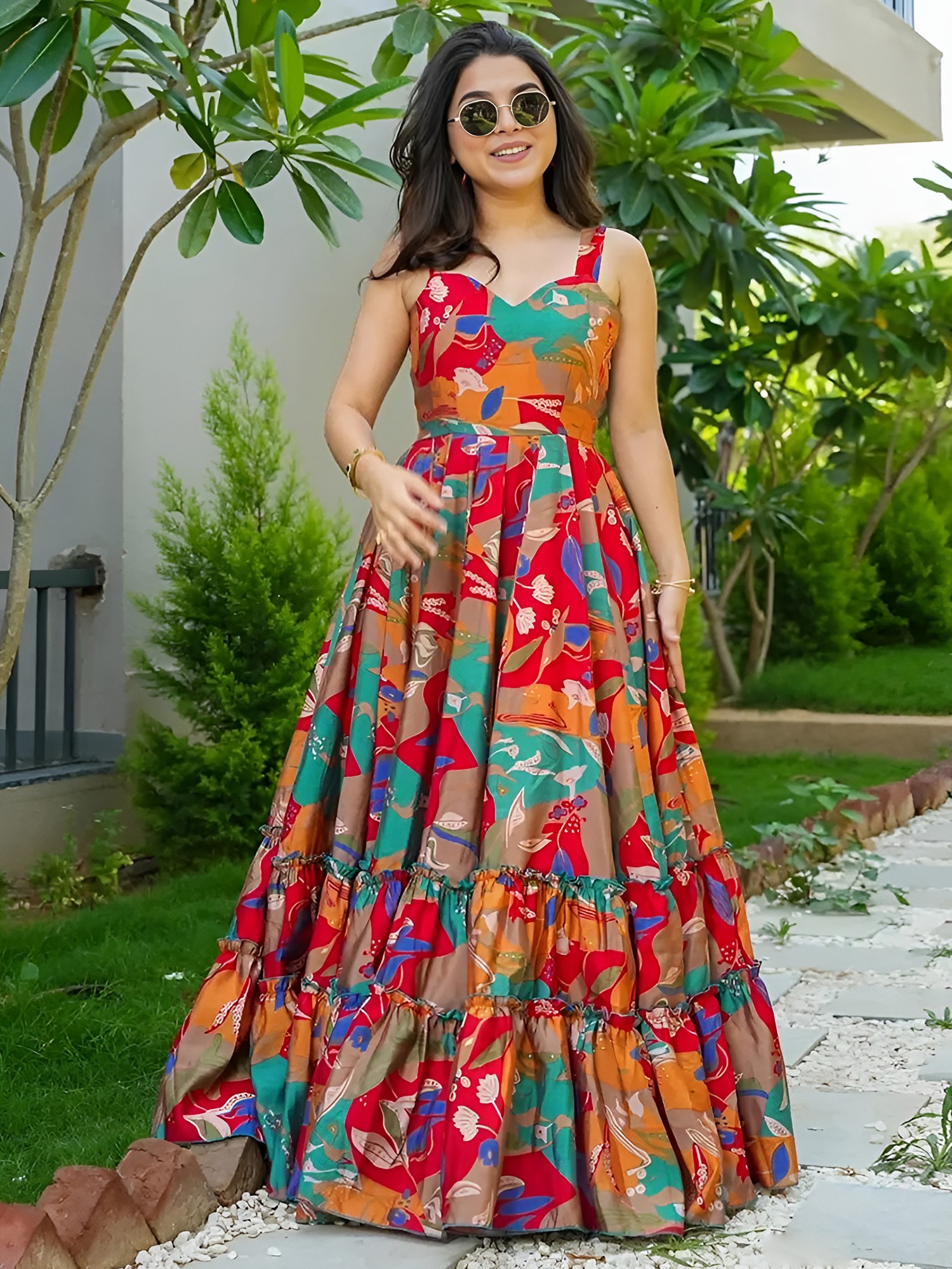Discover a dress that blends playful charm with everyday elegance, perfect for the modern woman. Crafted from soft, breathable rayon, this maxi dress promises a comfortable and flattering fit for any occasion. The eye-catching print bursts with a kaleidoscope of colors – rich reds, warm oranges, vibrant teals, and earthy browns – creating a lively and artistic aesthetic that is sure to turn heads. Each section of the fabric tells a story with its unique abstract floral and leaf motifs, making this a truly one-of-a-kind piece.
