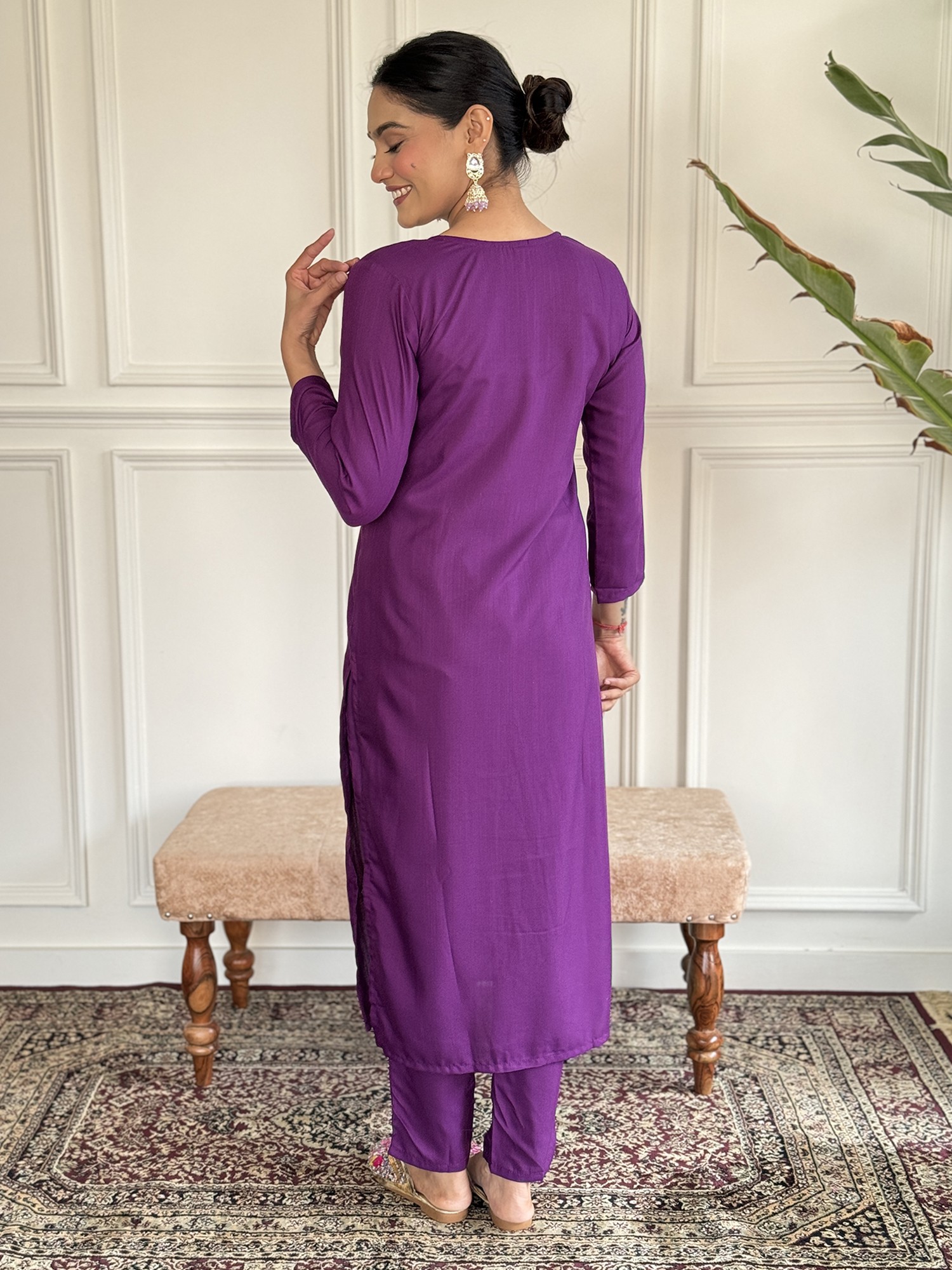 Discover the beauty of traditional design with a contemporary twist in this stunning kurta set. The rich, vibrant hue of the fabric immediately draws the eye, offering a sophisticated and regal look. Crafted from rayon slub, the fabric drapes beautifully, offering both comfort and a subtle texture that elevates the overall design. The straight cut of the kurta creates a flattering silhouette, perfect for a variety of body types. This ensemble promises to become a cherished addition to your ethnic wardrobe.