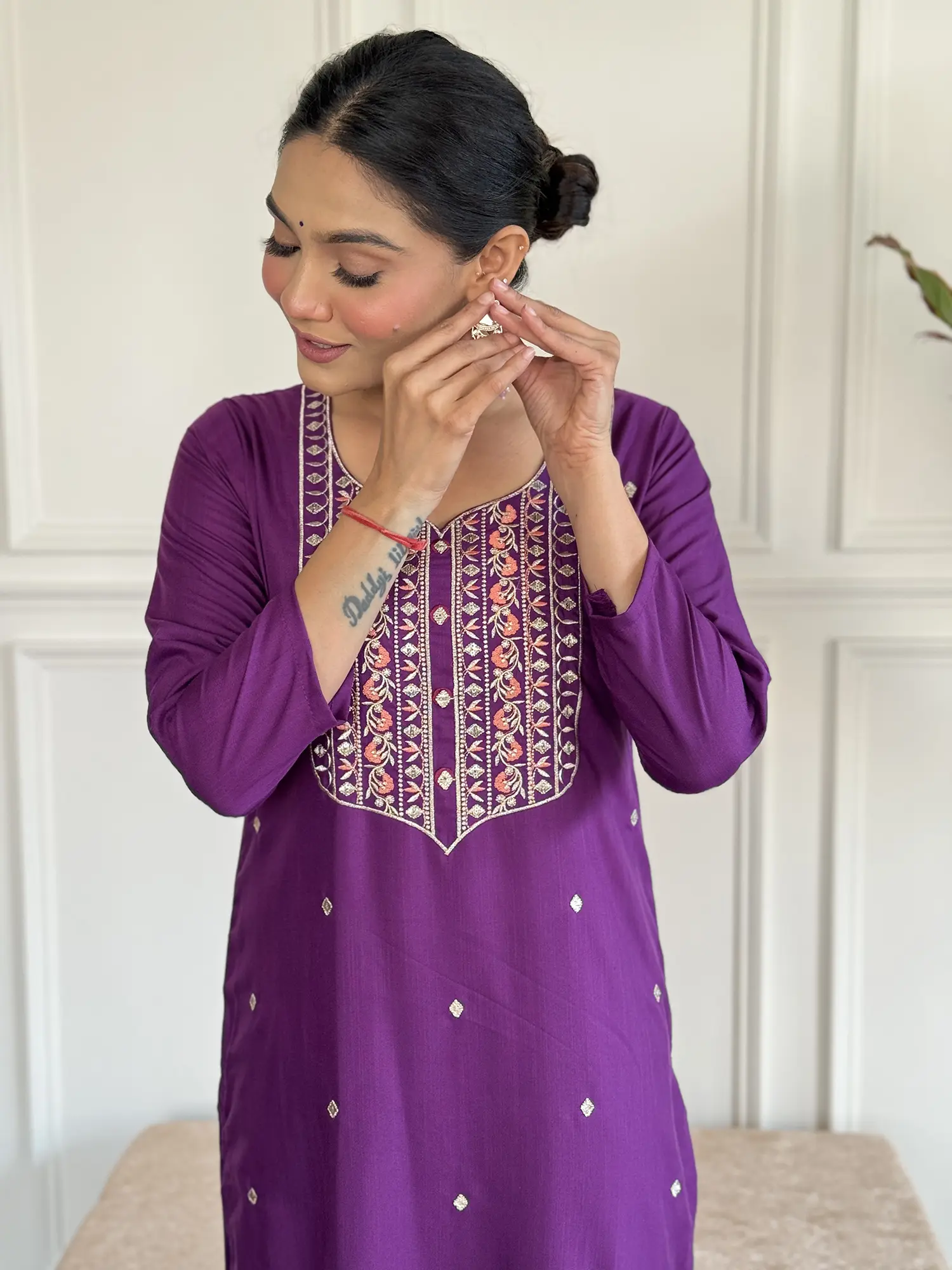 Wine-Red Viscose Rayon Floral Embroidered Round Neck Casual Kurta For Festival Occasion