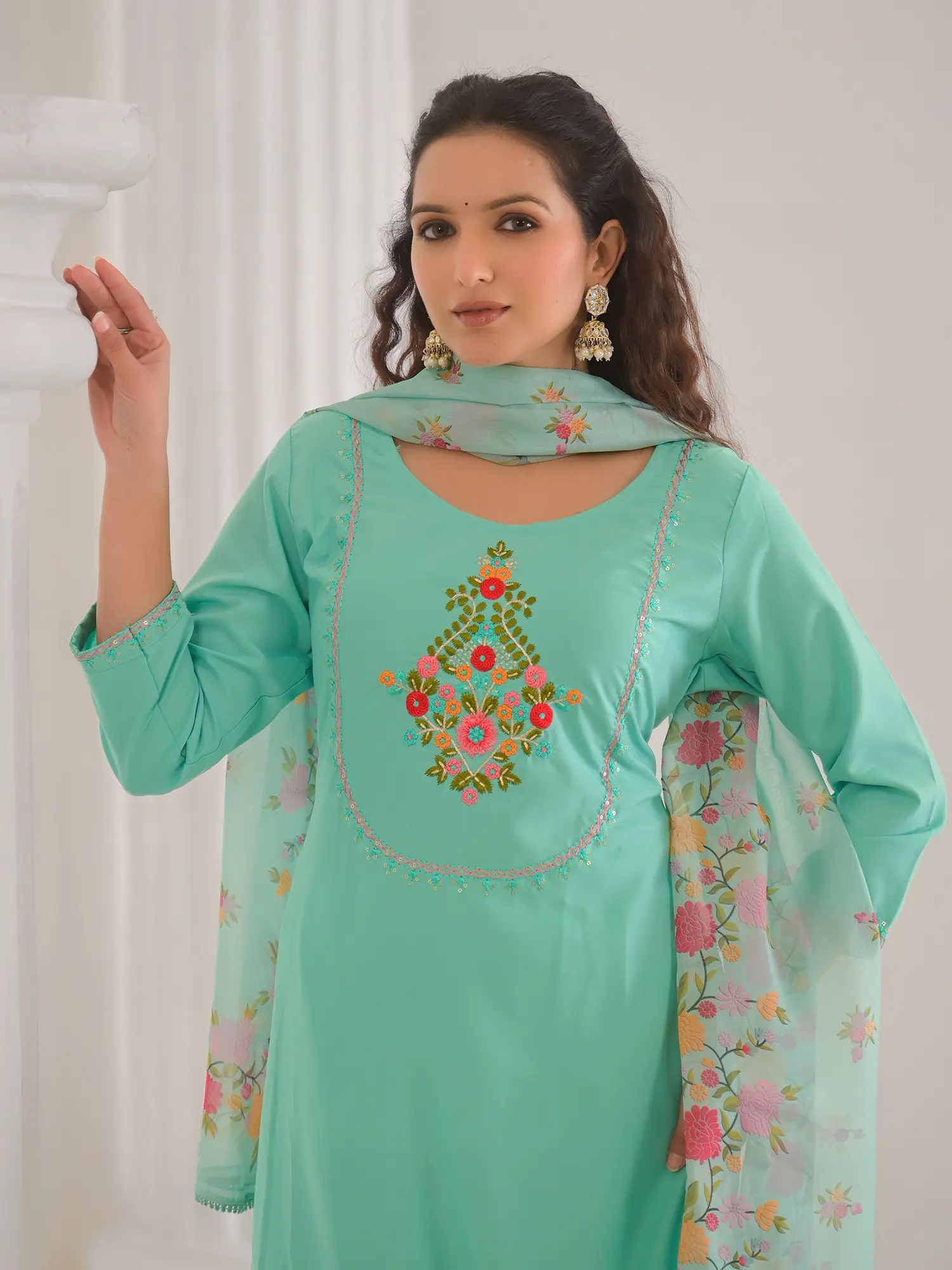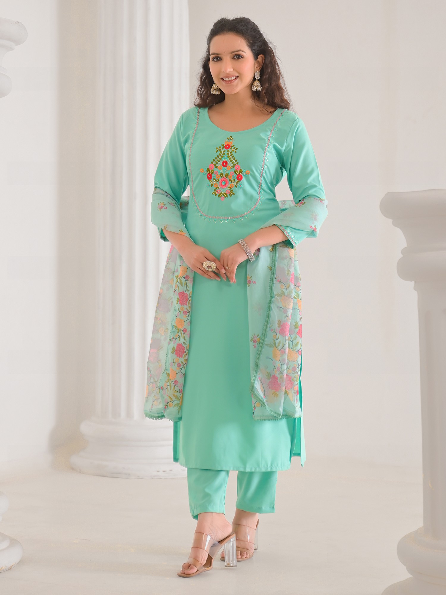 Rayon Slub Floral Embroidery Work A-Line Festive Wear Kurta Set With Silk Dupatta