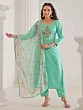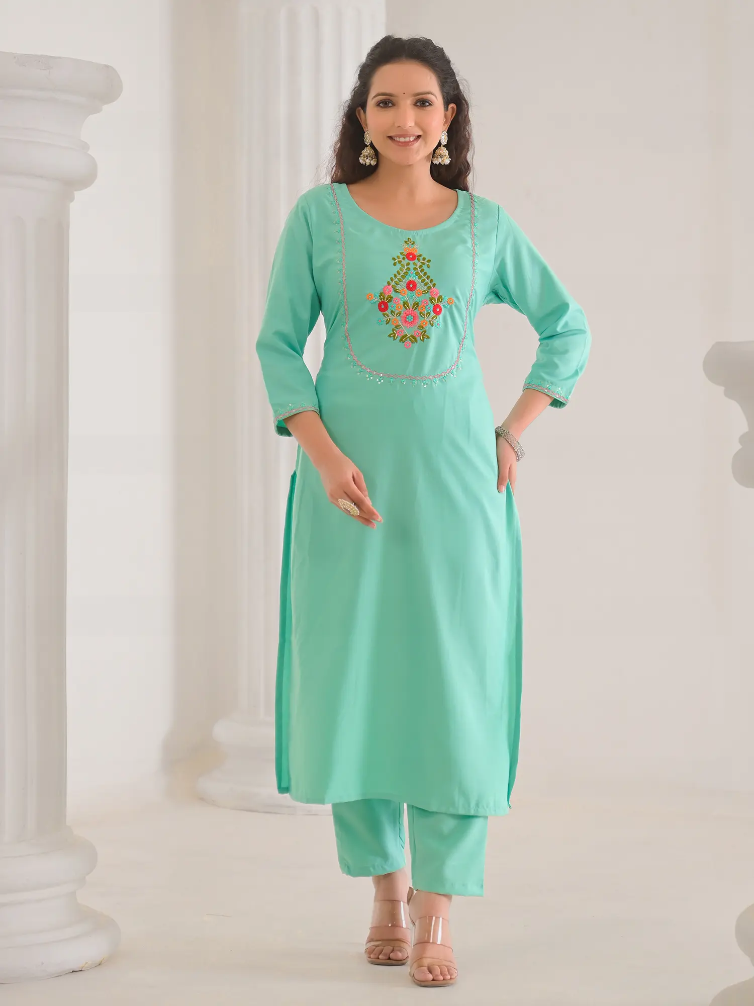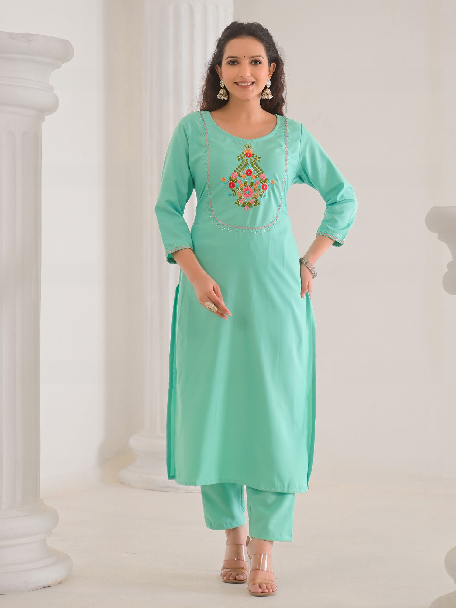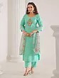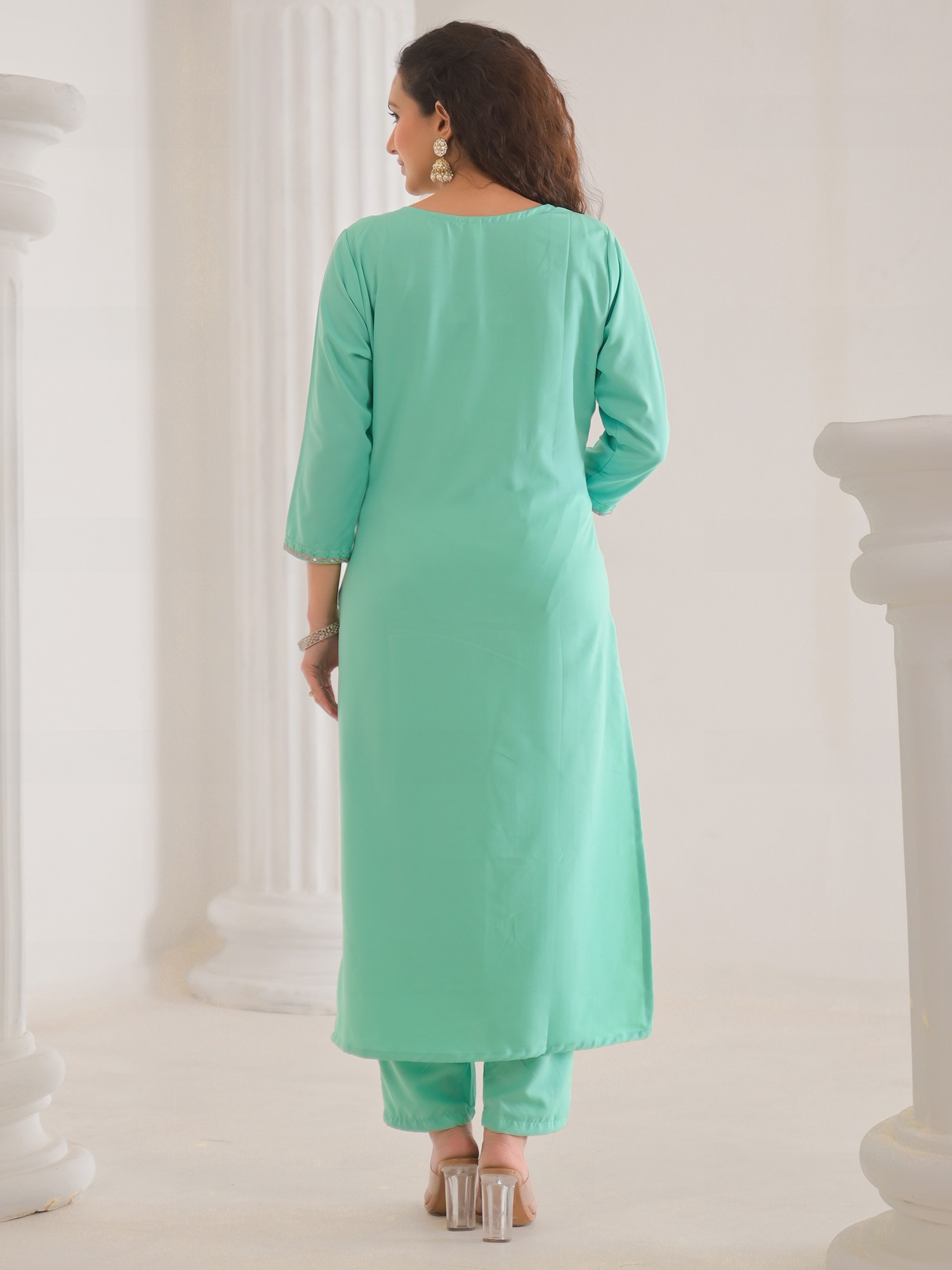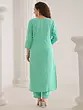 Step into a world of subtle elegance with this stunning kurta set, perfect for adding a touch of sophistication to your festive wardrobe. The soothing, light green shade of the kurta provides a refreshing base, while the A-line cut flatters a variety of body types. The classic round neckline is enhanced by delicate piping detail, lending a refined touch to the overall design. This kurta set is a celebration of traditional craftsmanship meeting contemporary style.