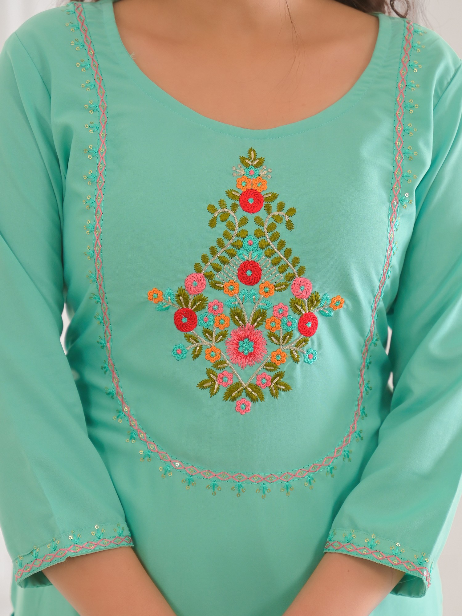 The focal point of this ensemble is the meticulously crafted floral embroidery adorning the chest. A vibrant array of colors adds depth and dimension to the design, creating a captivating visual appeal. Crafted from rayon slub fabric, the kurta offers a comfortable and breathable feel, ideal for extended wear during festive occasions. The subtle texture of the slub adds an element of understated luxury.