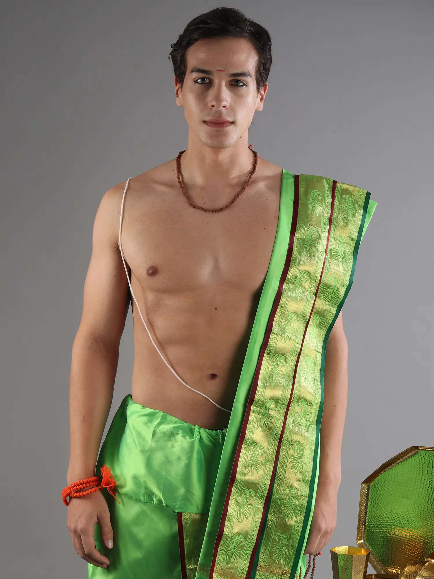 Step into a realm of timeless tradition and exquisite craftsmanship with this ready-to-wear dhoti and angavastram set. Designed for comfort and cultural significance, this ensemble is perfect for religious ceremonies, auspicious occasions, cultural festivals, or any event where you wish to exude a sense of grace and heritage. The vibrant, eye-catching green hue is both refreshing and sophisticated, making you stand out with a subtle yet powerful presence.