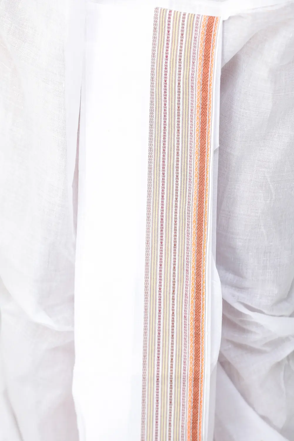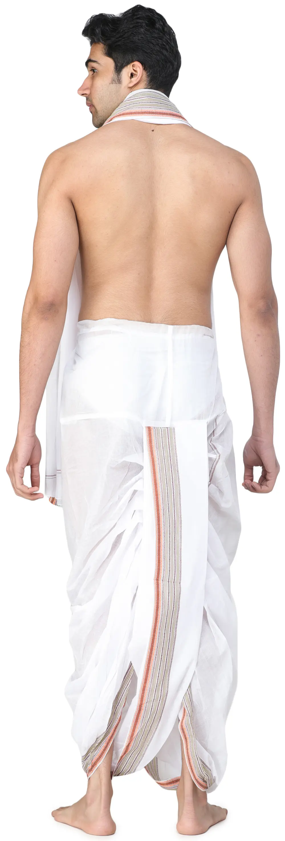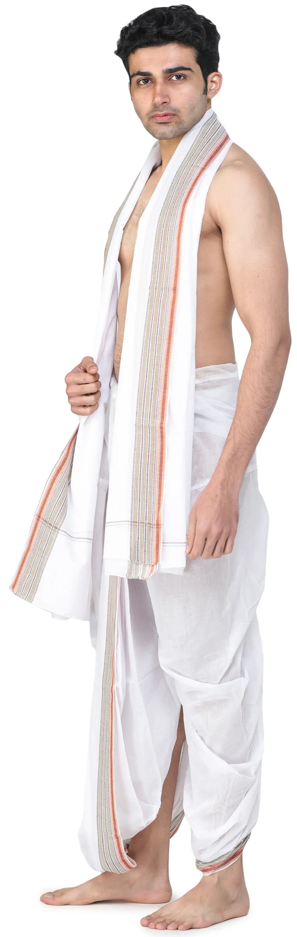Ritual processes sometimes require participants to dress in traditional attire. It might be a Dhoti-Kurta or a Dhoti-Angavastram for males. Due to the complications inherent with its draping, the Dhoti-Kurta as a traditional dress was still not universally acknowledged. To address this issue, ready-to-wear Dhotis were discovered. This ready-to-wear Dhoti and Angavastram set with a temple border is made of pure cotton and shines in a vibrant apricot color that is commonly referred to as orange. The orange color is associated with fire and has cleansing properties, making it popular as a traditional wear during festivals and ceremonies. This outfit, with all of its auspicious elements, is an excellent choice for men's festive clothing.