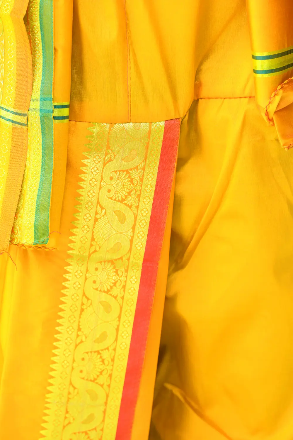 Neelam or Sapphire is a precious stone and its color is symbolic of prosperity and preferred by royals in their attire. This ready-to-wear Dhoti and Angavastram set exudes the regality of the Sapphire blue color along with the comfort of art silk fabric. This set features a woven golden leaves border, exuding opulence and charm. Paired perfectly with the matching angavastram, this ensemble promises a seamless blend of comfort and style to be exhibited during sacred occasions.