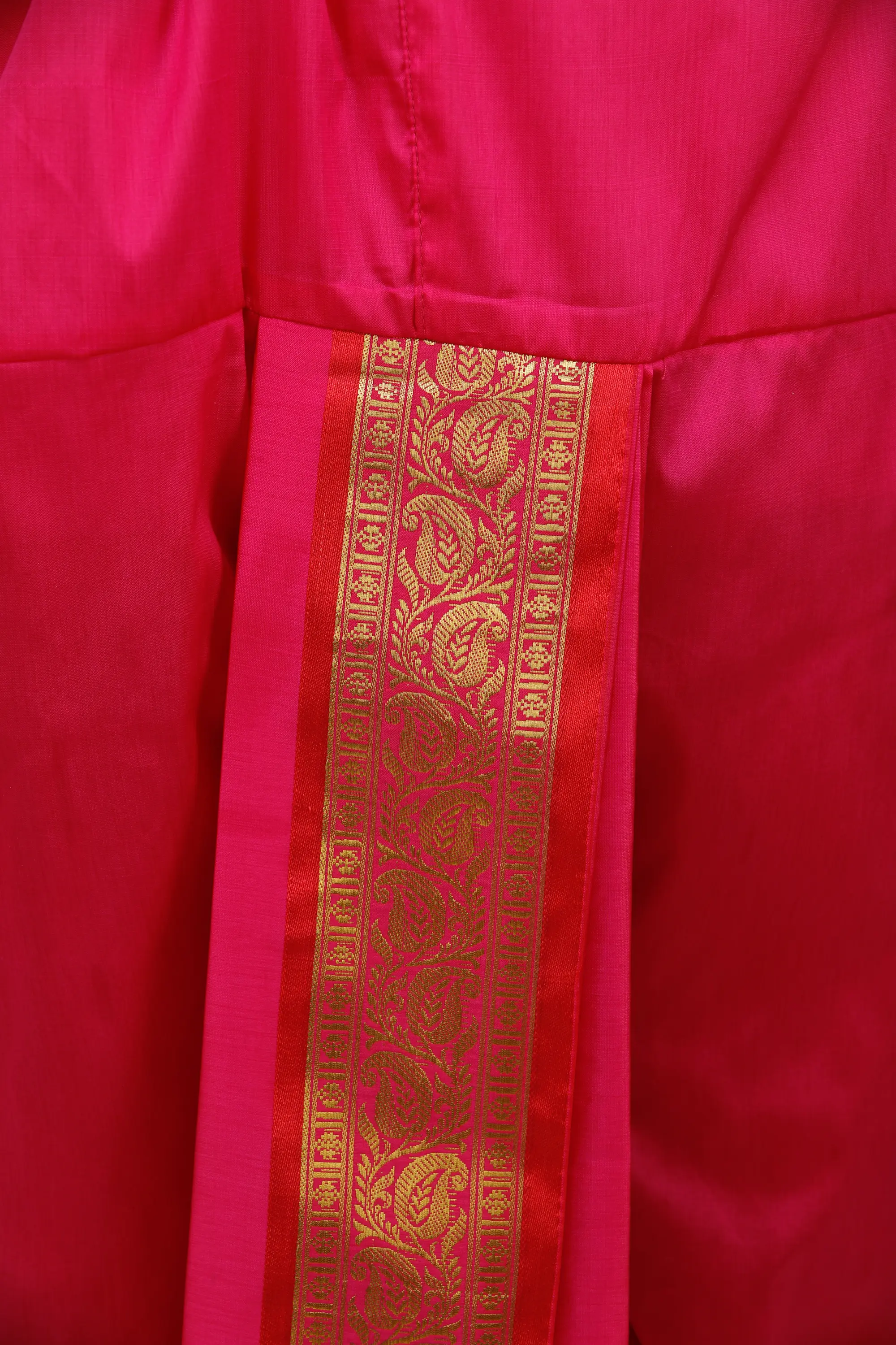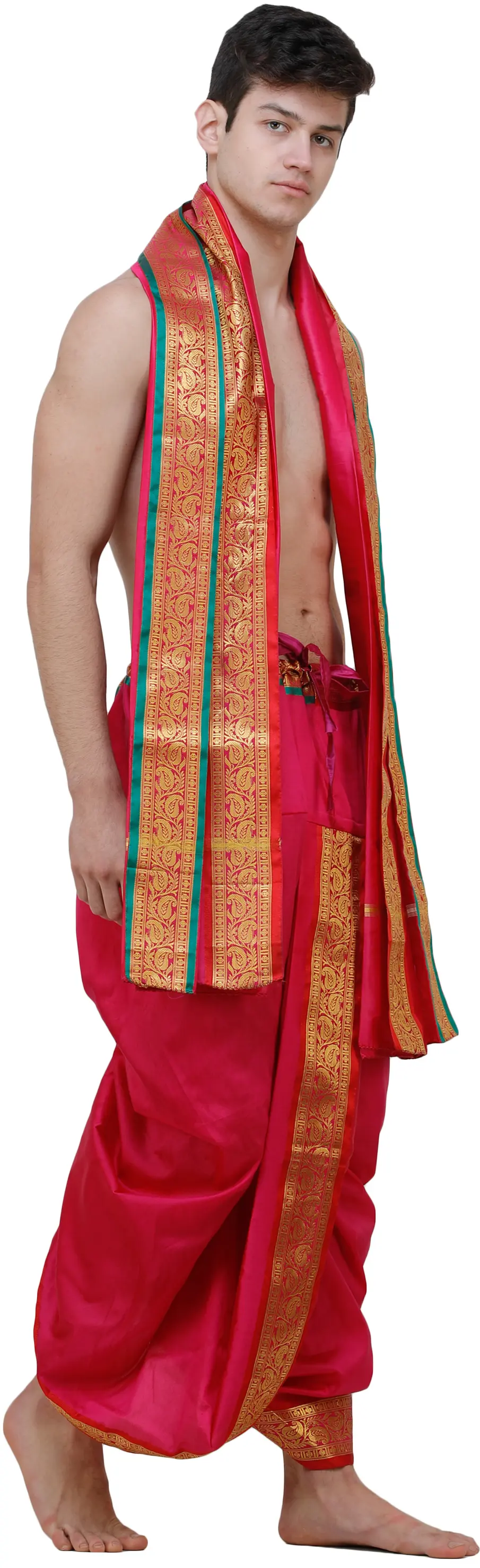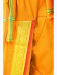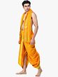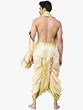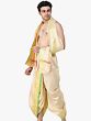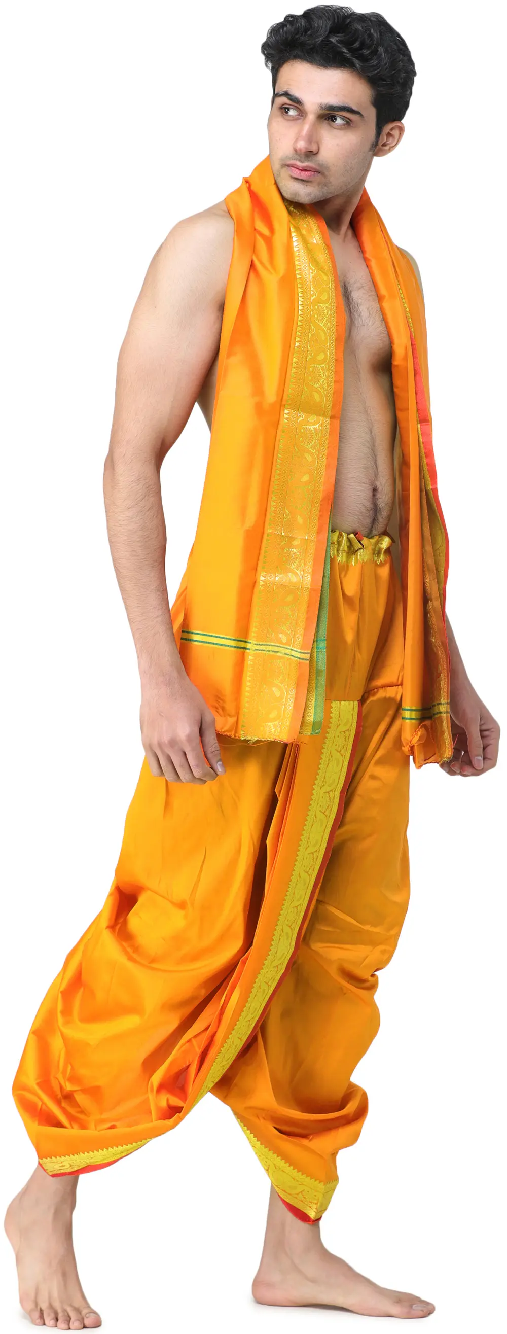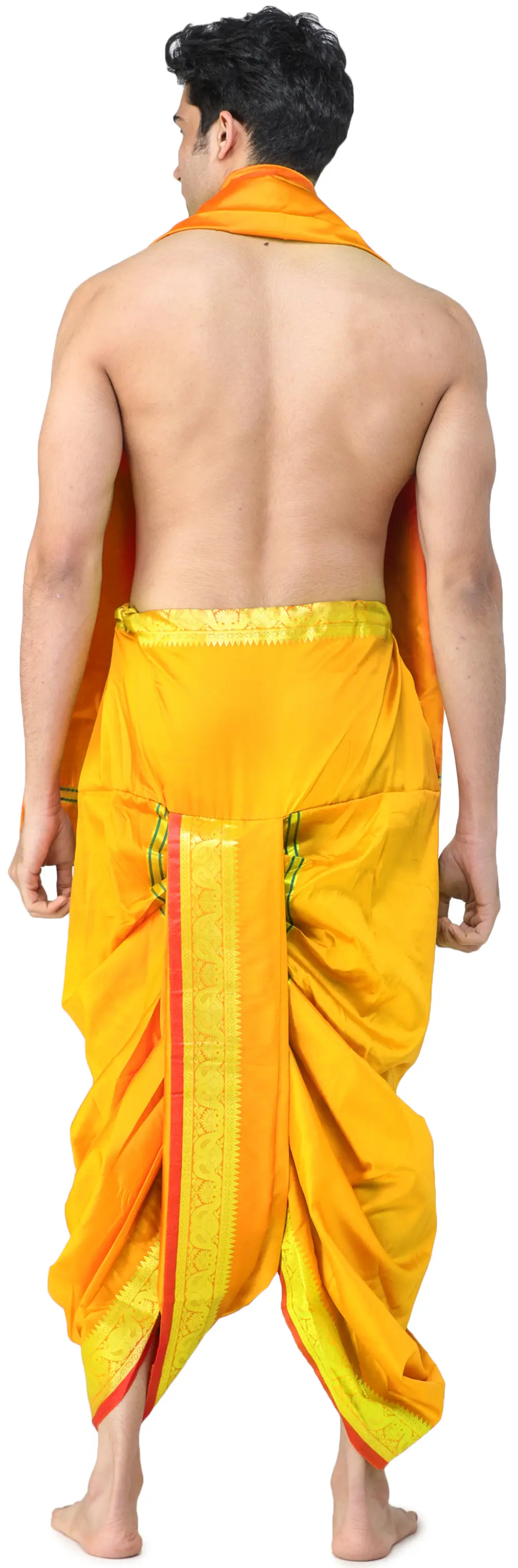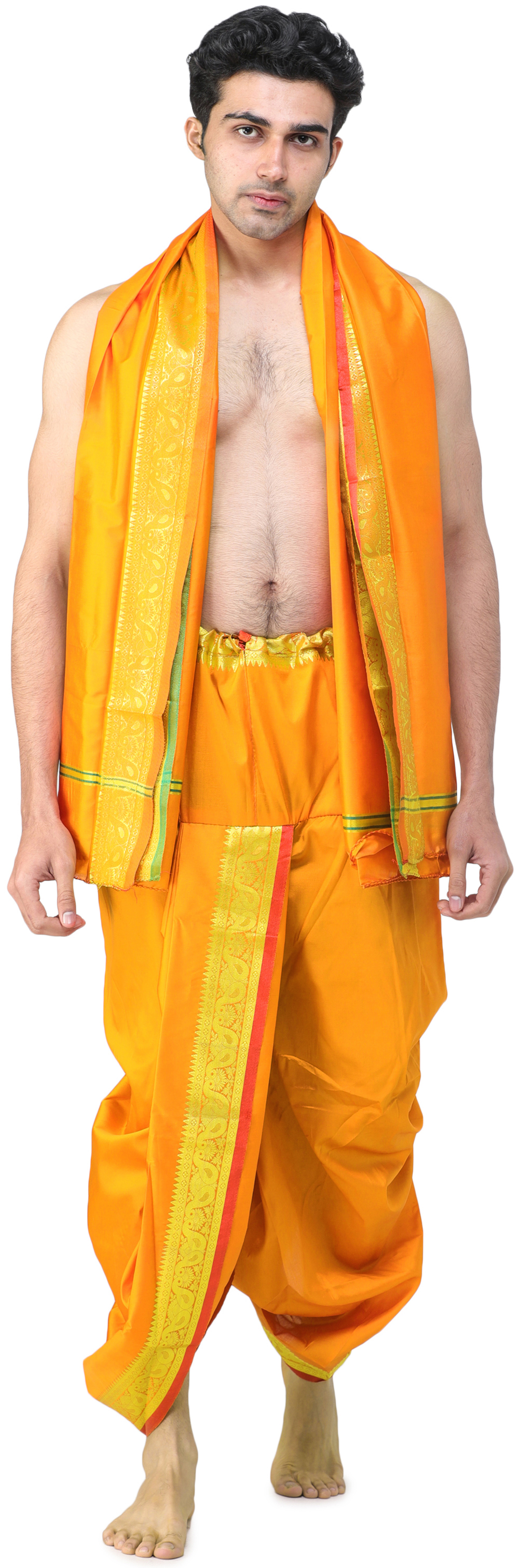 Neelam or Sapphire is a precious stone and its color is symbolic of prosperity and preferred by royals in their attire. This ready-to-wear Dhoti and Angavastram set exudes the regality of the Sapphire blue color along with the comfort of art silk fabric. This set features a woven golden leaves border, exuding opulence and charm. Paired perfectly with the matching angavastram, this ensemble promises a seamless blend of comfort and style to be exhibited during sacred occasions.