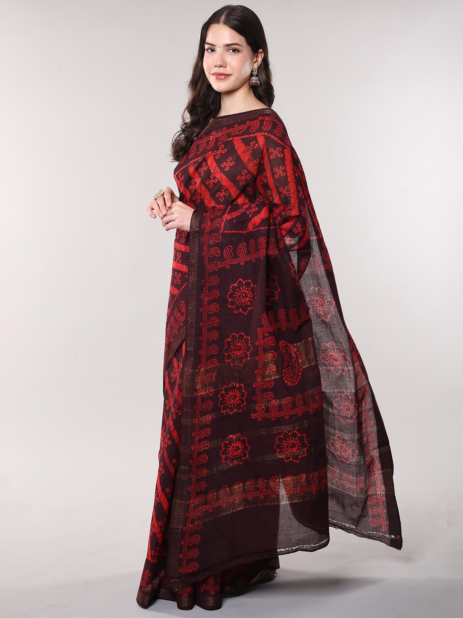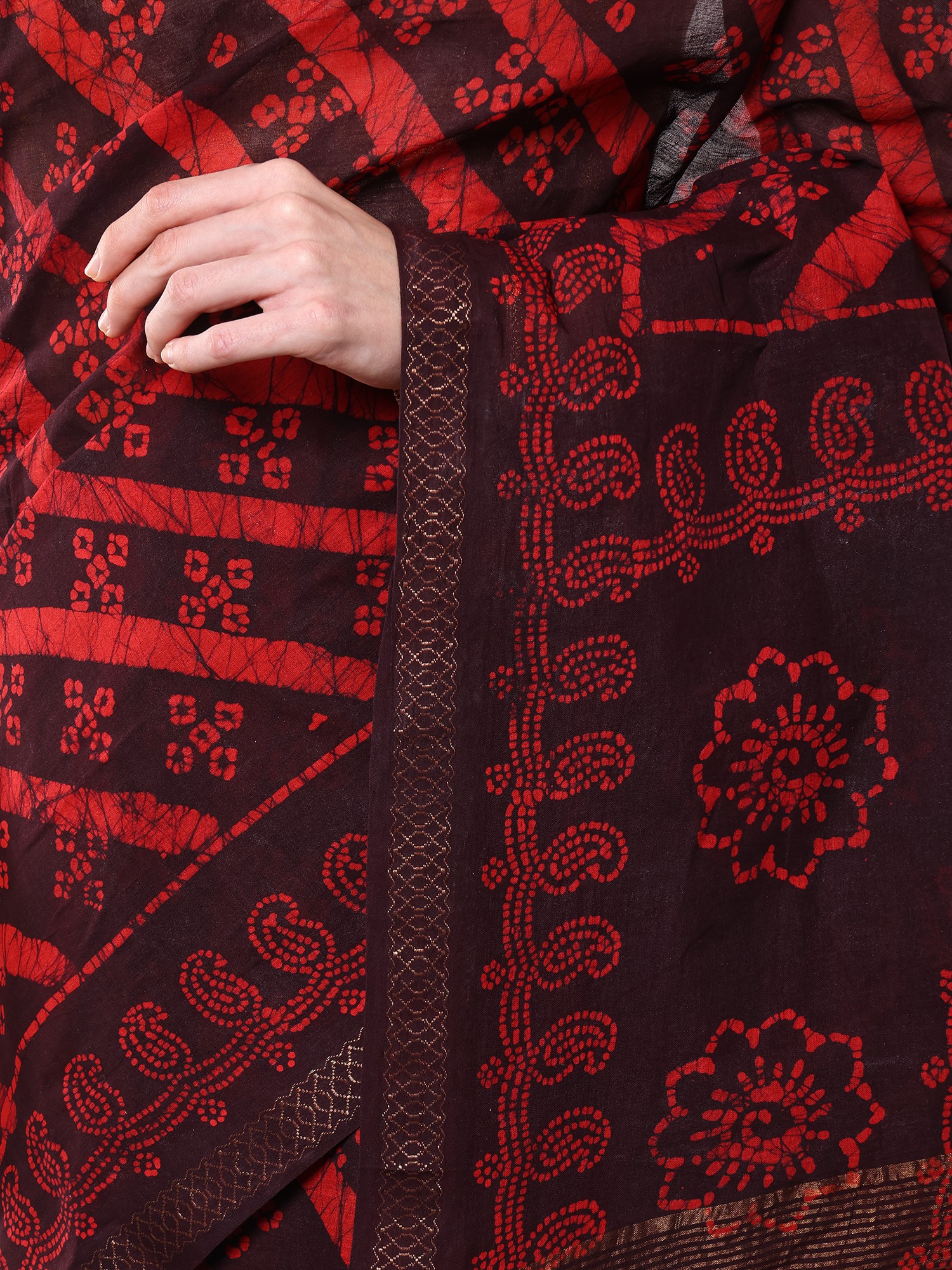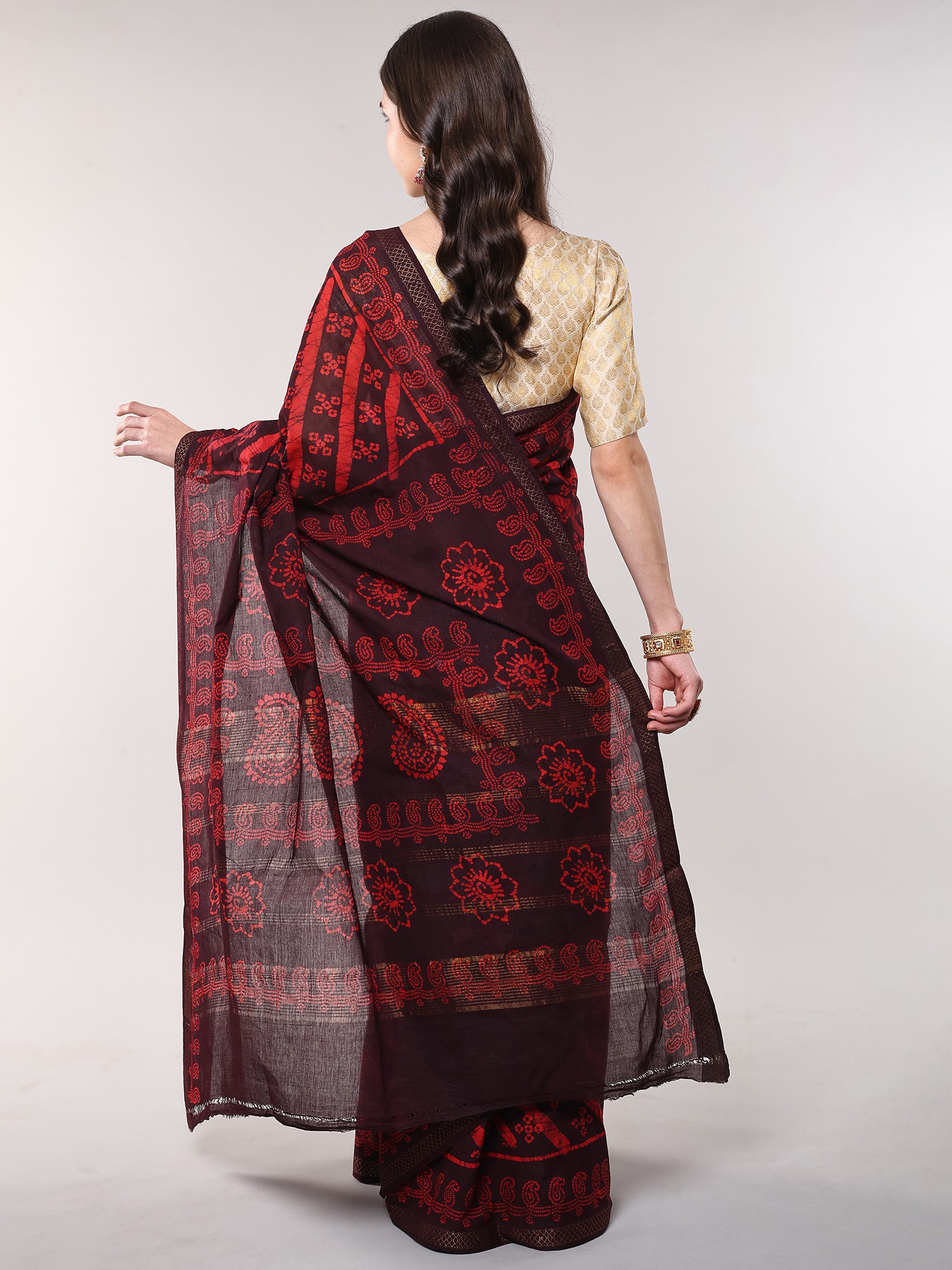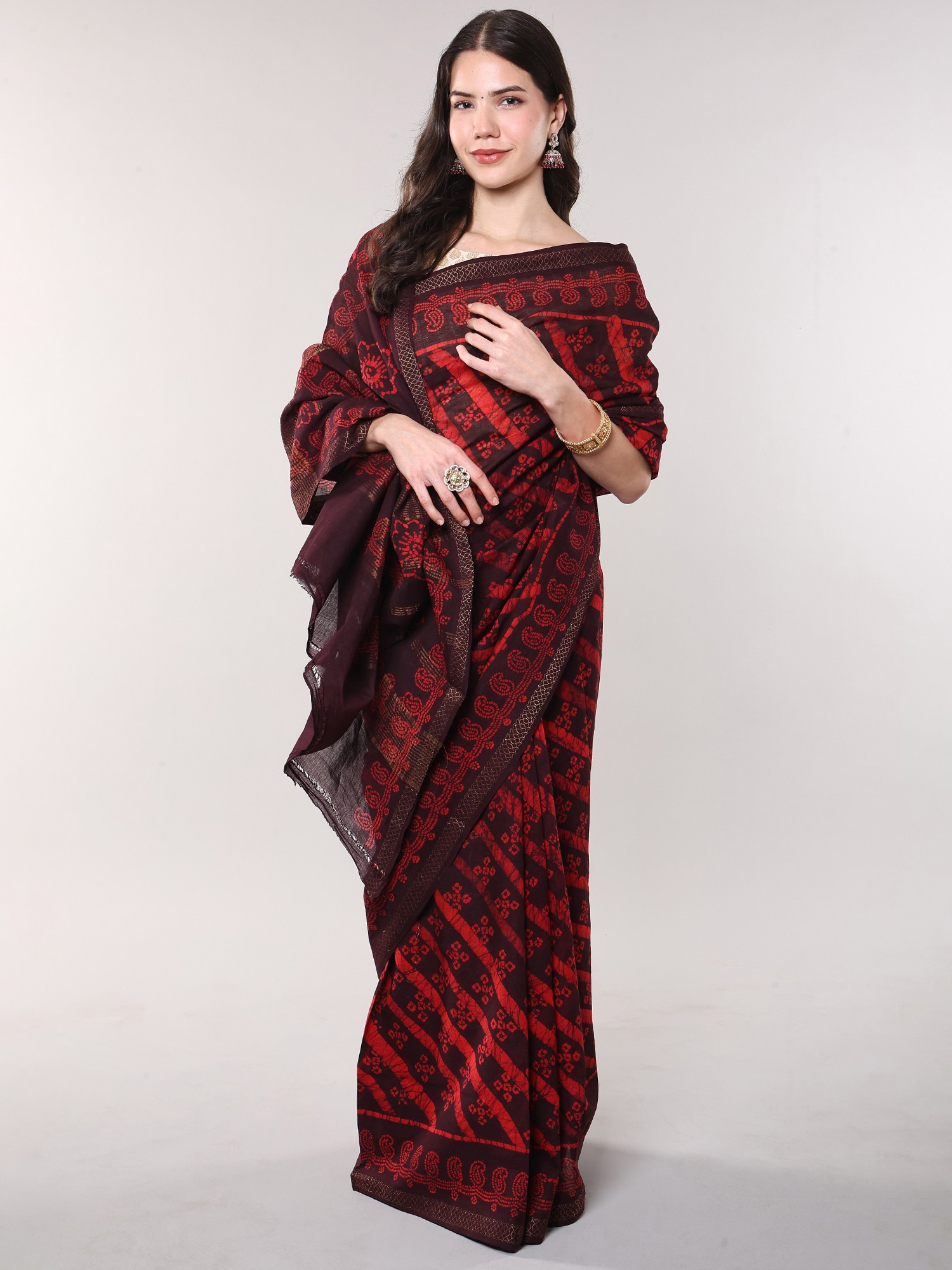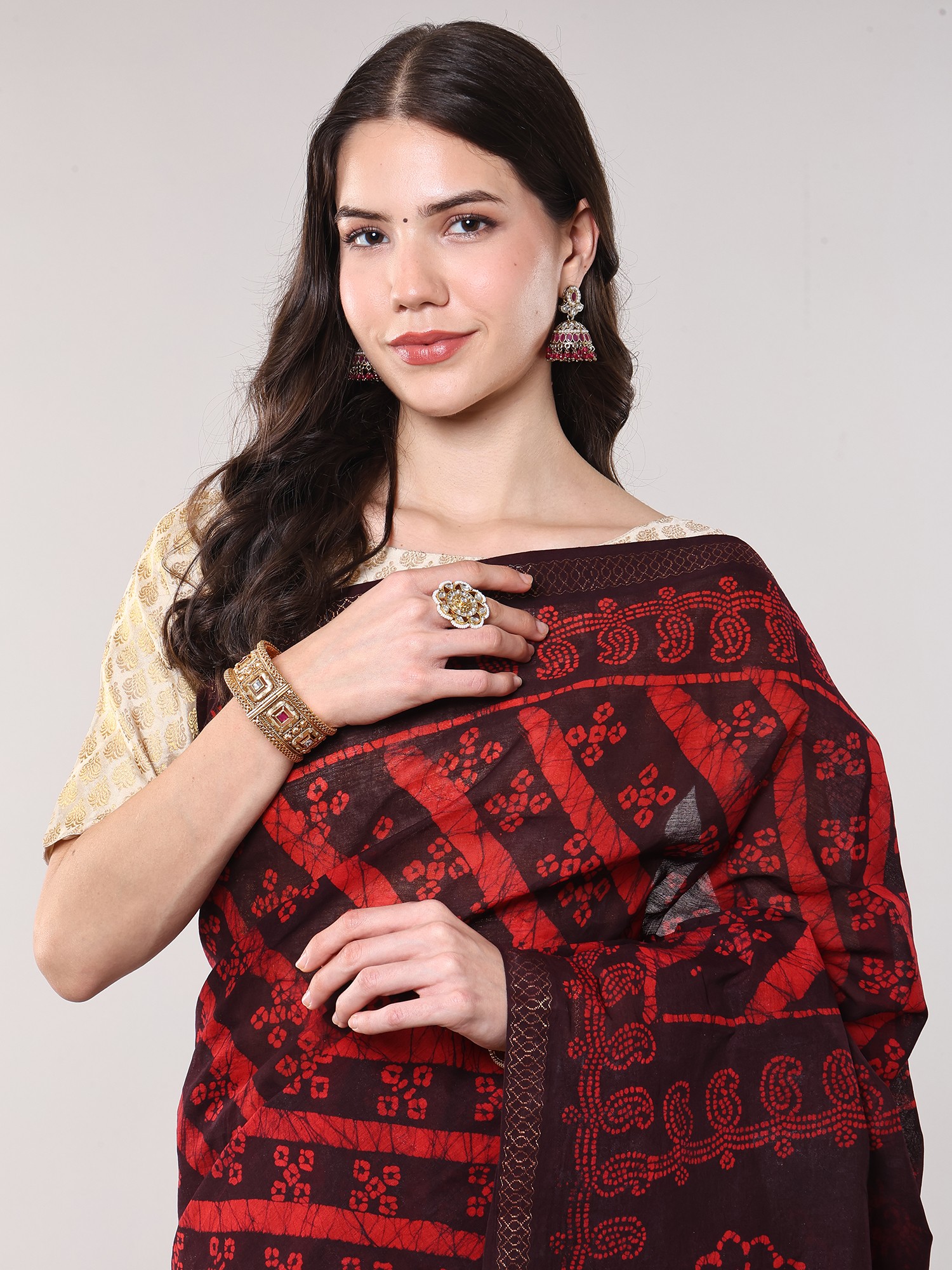 Red and Brown Sungudi Cotton Saree from Madurai with Batik Print and Zari Border