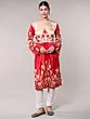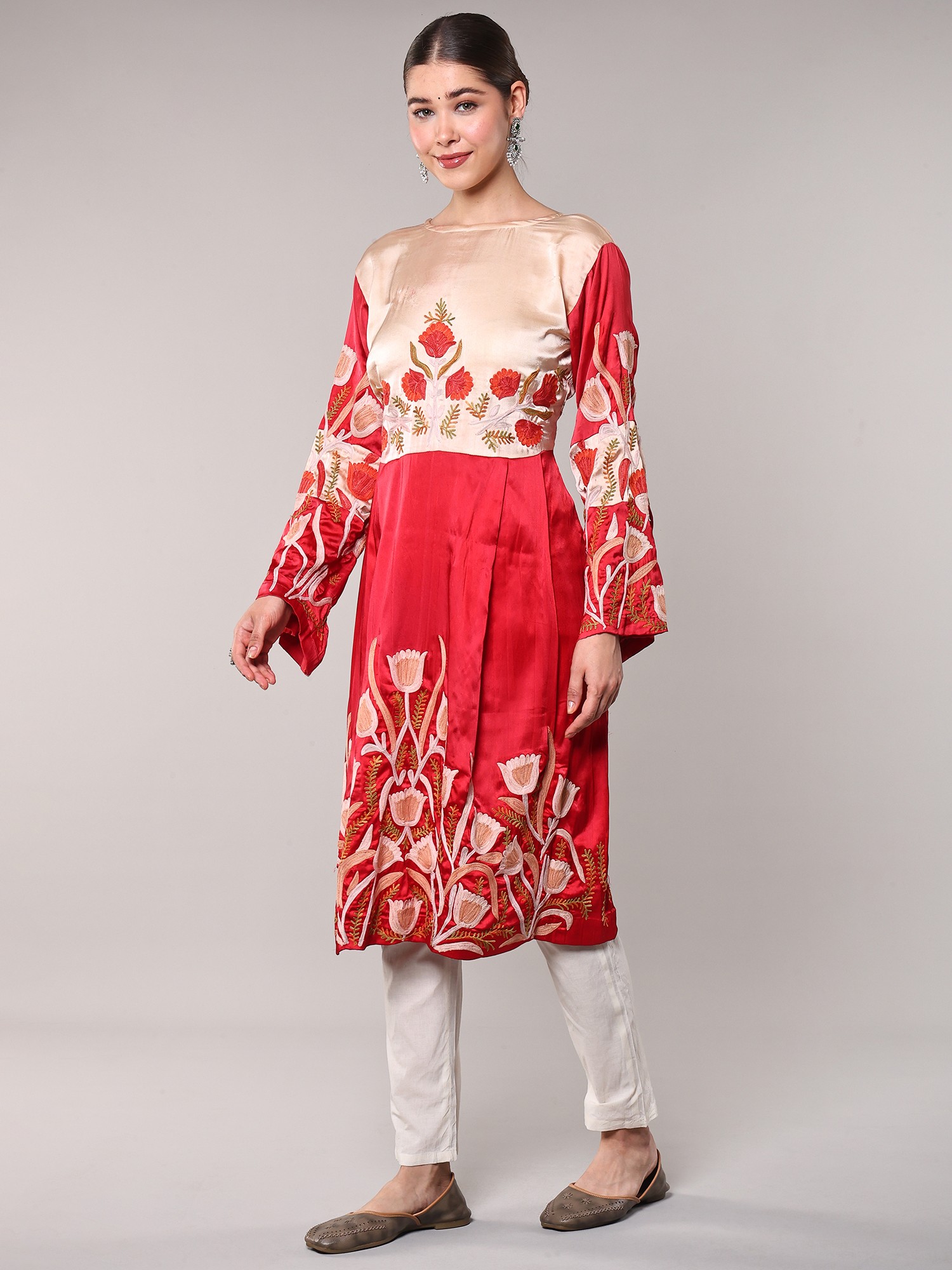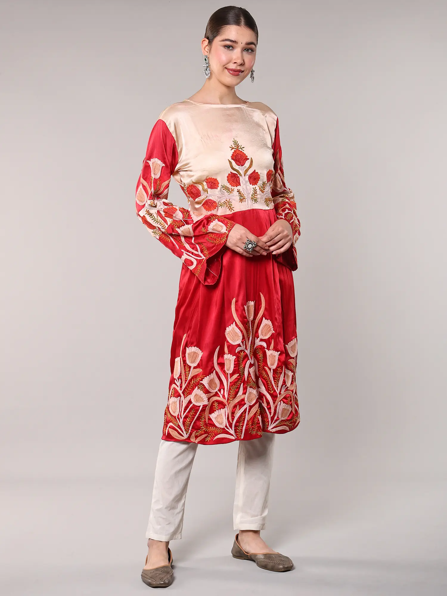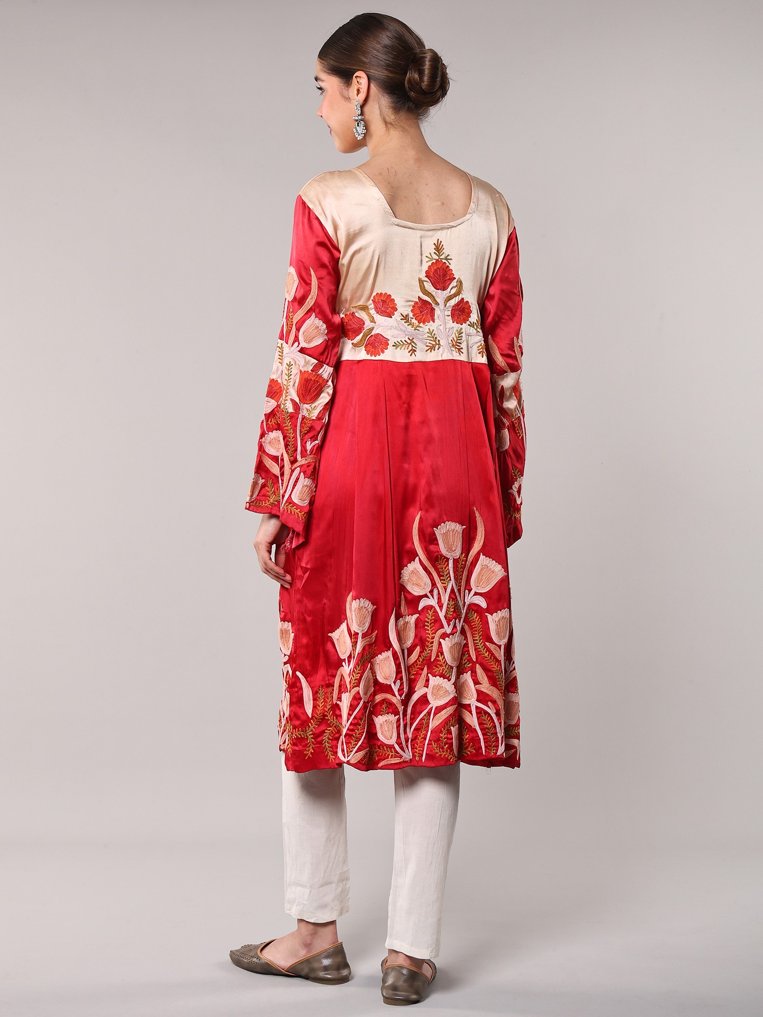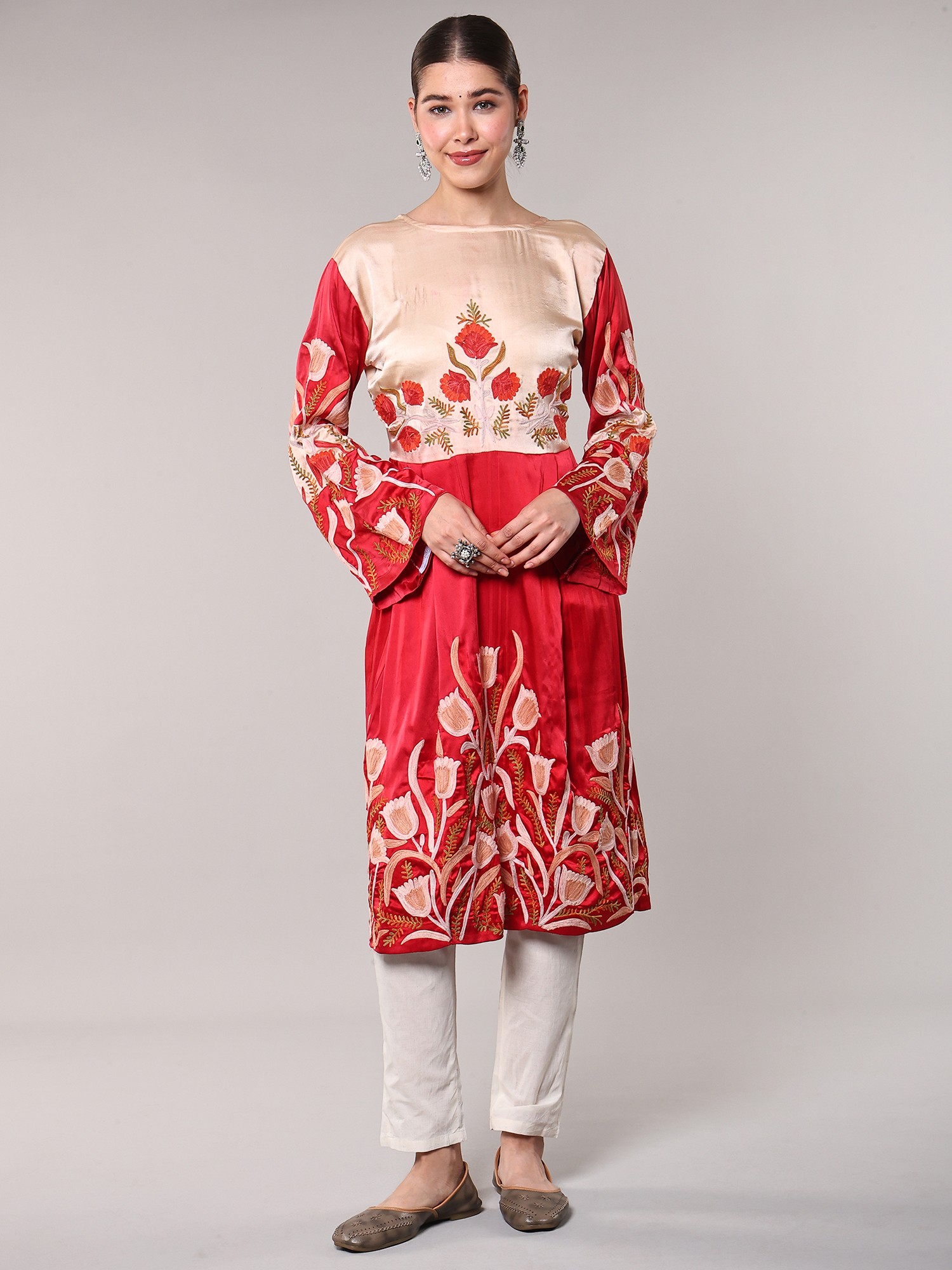 Tomato-Red Kashmiri Kurti with Hand-Embroidered Flowers