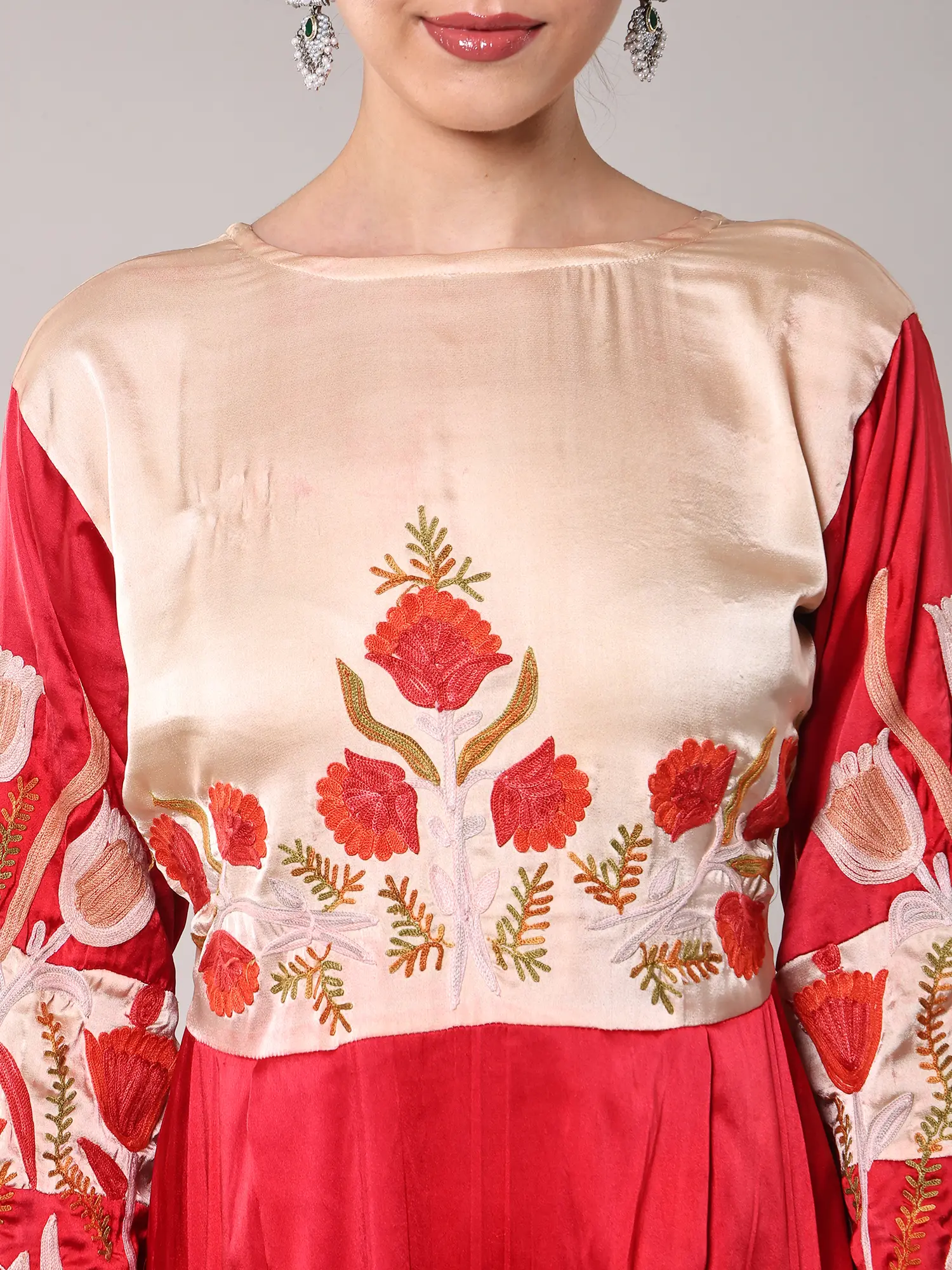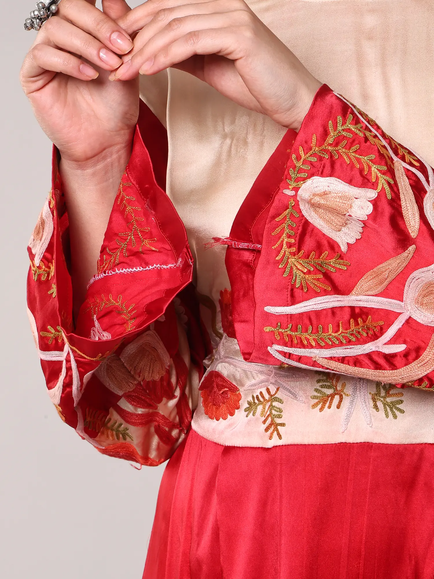 The striking contrast between the creamy, lustrous upper bodice and the vibrant red of the lower section creates a visually arresting effect. This play of color highlights the exquisite floral embroidery, which blooms in a delightful palette of reds, creams, and subtle earth tones. The elegant, full-length sleeves, measuring approximately 21 inches, add a touch of drama and grace, while the overall length of 43 inches ensures a graceful flow. The carefully considered bust measures around 37 inches, with a shoulder span of 18 inches, designed to flatter and enhance your natural silhouette.
