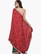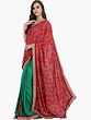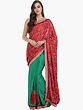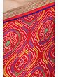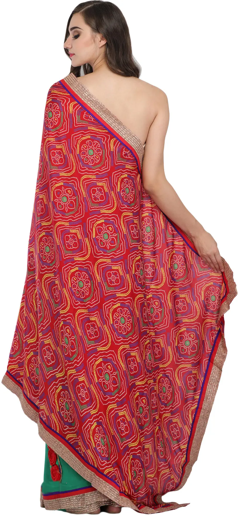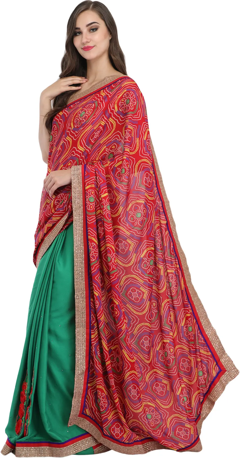 Introducing a truly captivating saree that embodies the essence of traditional Indian artistry with a modern flair. This exquisite piece is designed to make you the center of attention, blending vibrant hues with intricate detailing. The upper half of the saree is adorned with a striking red fabric featuring the classic Bandhani print. This time-honored tie-dye technique creates a mesmerizing pattern of geometric shapes and delicate dots, a testament to the skill of the artisans. The rich red base is beautifully contrasted with accents of purple, yellow, and green within the print, creating a dynamic and eye-catching design.