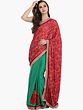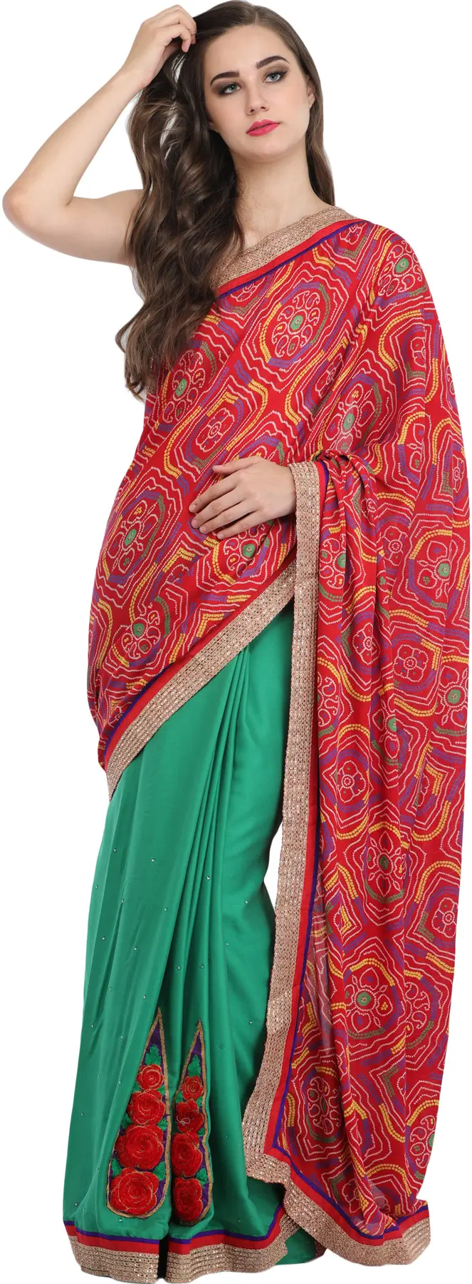 The lower half of the saree transitions to a lush, vibrant green, offering a refreshing and harmonious contrast to the bold red. This section is further enhanced by exquisite embroidered floral patches in a deep, rich red. These meticulously crafted roses, rendered with intricate stitching and rich texture, add a touch of opulent femininity and a hint of romantic charm. Tiny scattered embellishments on the green portion catch the light, adding a subtle sparkle that enhances the overall allure of the saree. The entire ensemble is framed by a magnificent gota border. This traditional embellishment, made from intricately woven gold threads, lends an air of regal splendor and a luxurious finish, ensuring you shimmer with every movement.