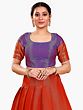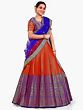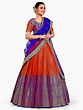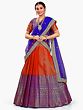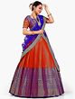 The royalty in red and blue makes this Banarasi saree style designer lehenga a classic festive wear for all seasons. The art silk fabric lends the skirt a gorgeous flow, which is decorated with rich brocade elements all over and exquisite ethnic motifs such as Buta and peacocks on the hemline. The lehenga is paired with a stunning blue dupatta, adding a rich element to its ethnic charm.