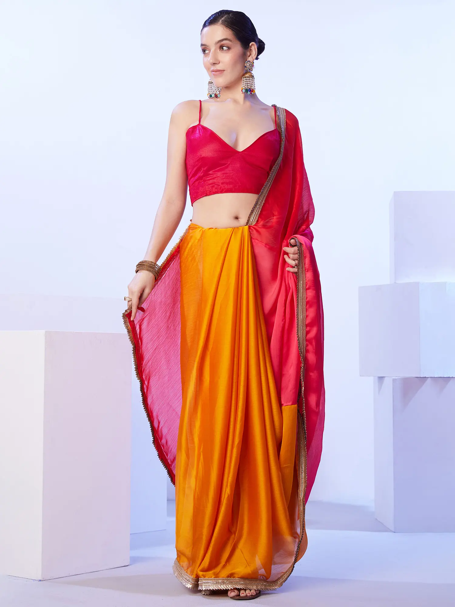Make a statement with this captivating red-pink chinon saree, perfect for your next casual occasion. The vibrant red and sunny yellow hues create a striking contrast, while the intricate lacework border adds a touch of elegance. This saree is crafted from luxurious satin material, ensuring a smooth and comfortable drape that moves gracefully with you. The rich color combination is both eye-catching and versatile, making it ideal for a variety of settings. Imagine yourself effortlessly chic in this beautiful piece, ready to make memories that will last a lifetime.