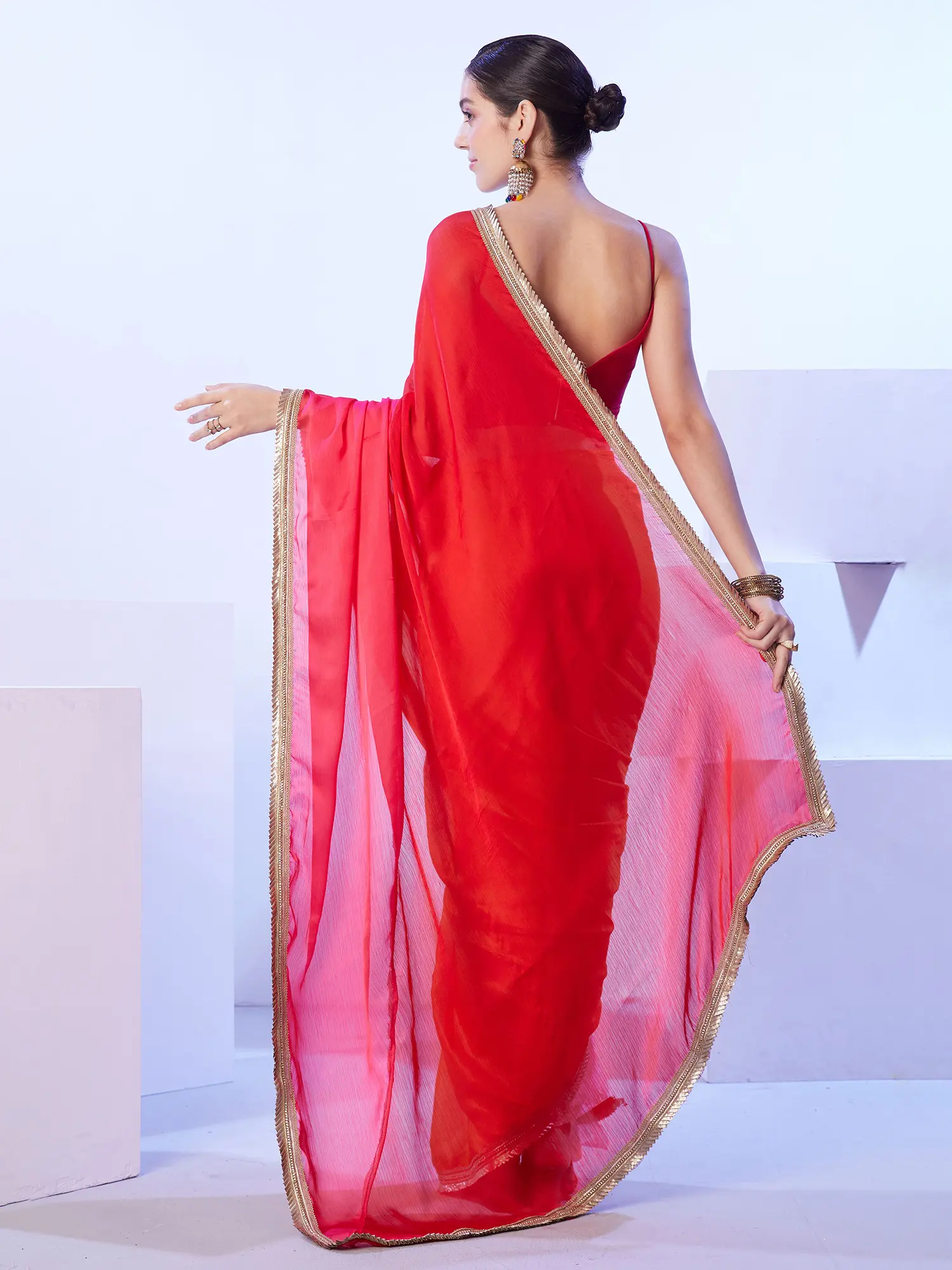 Red-Pink Attractive Solid Design Lace Work Border Chinon Saree For Casual Occasion
