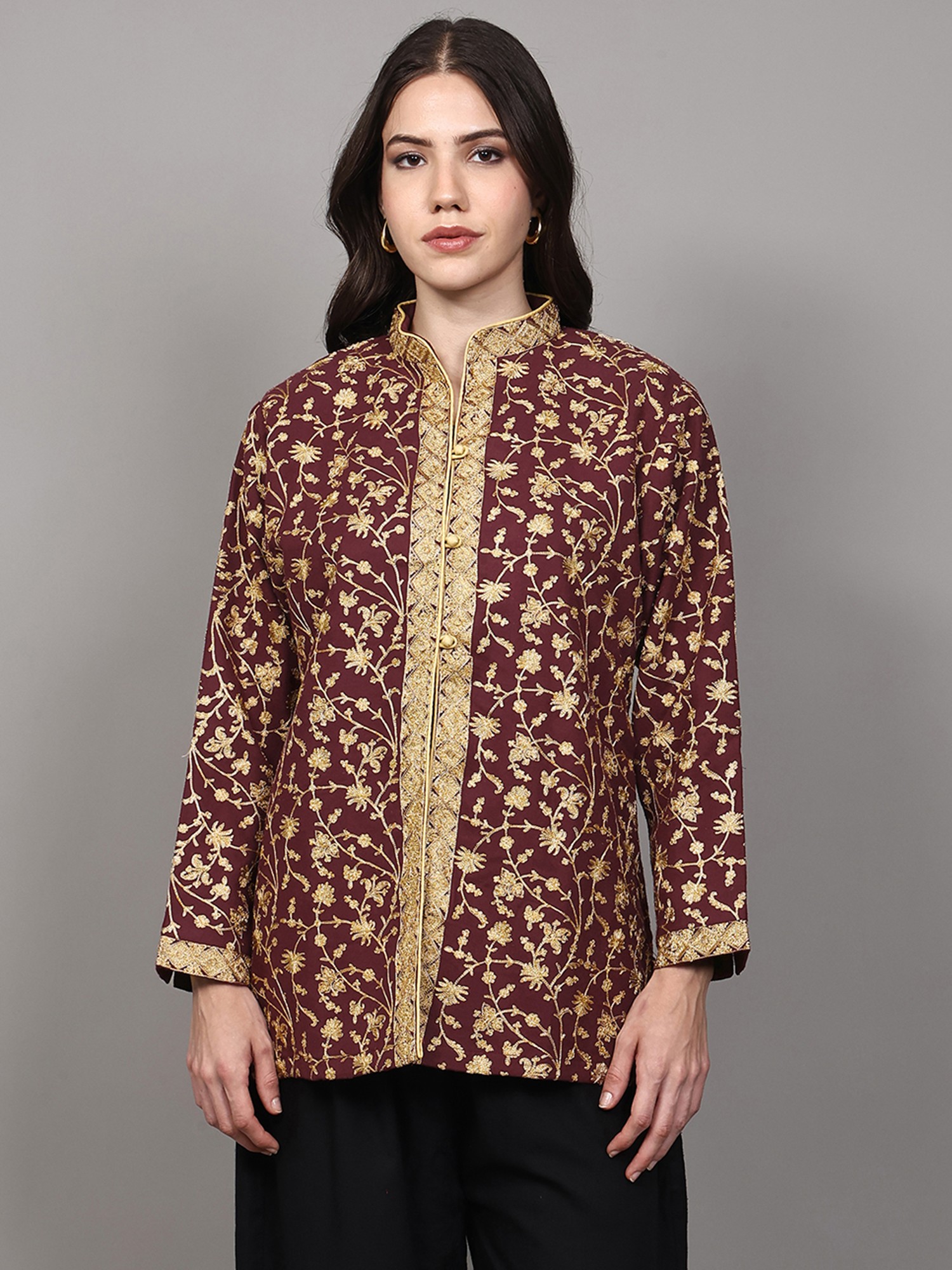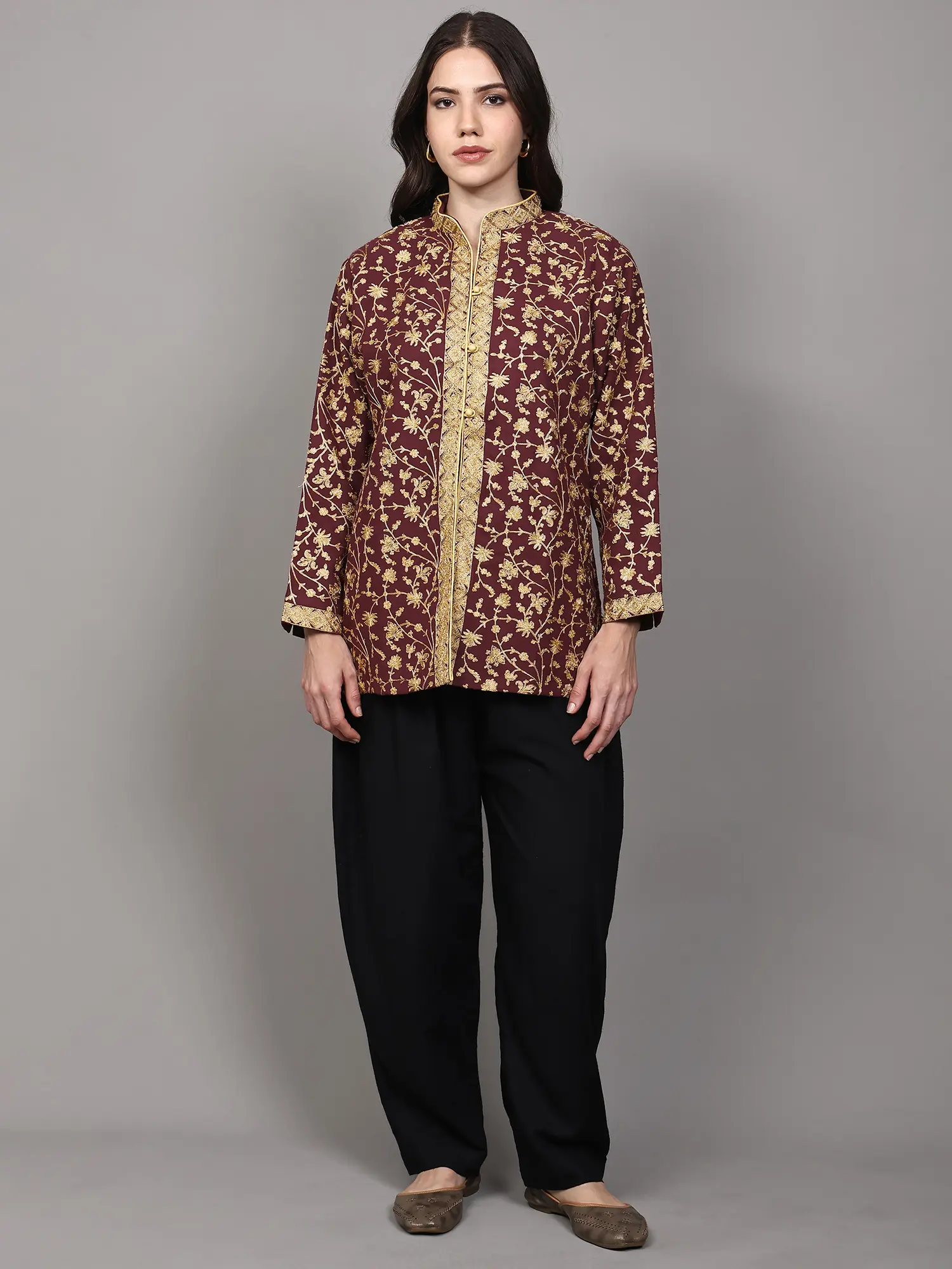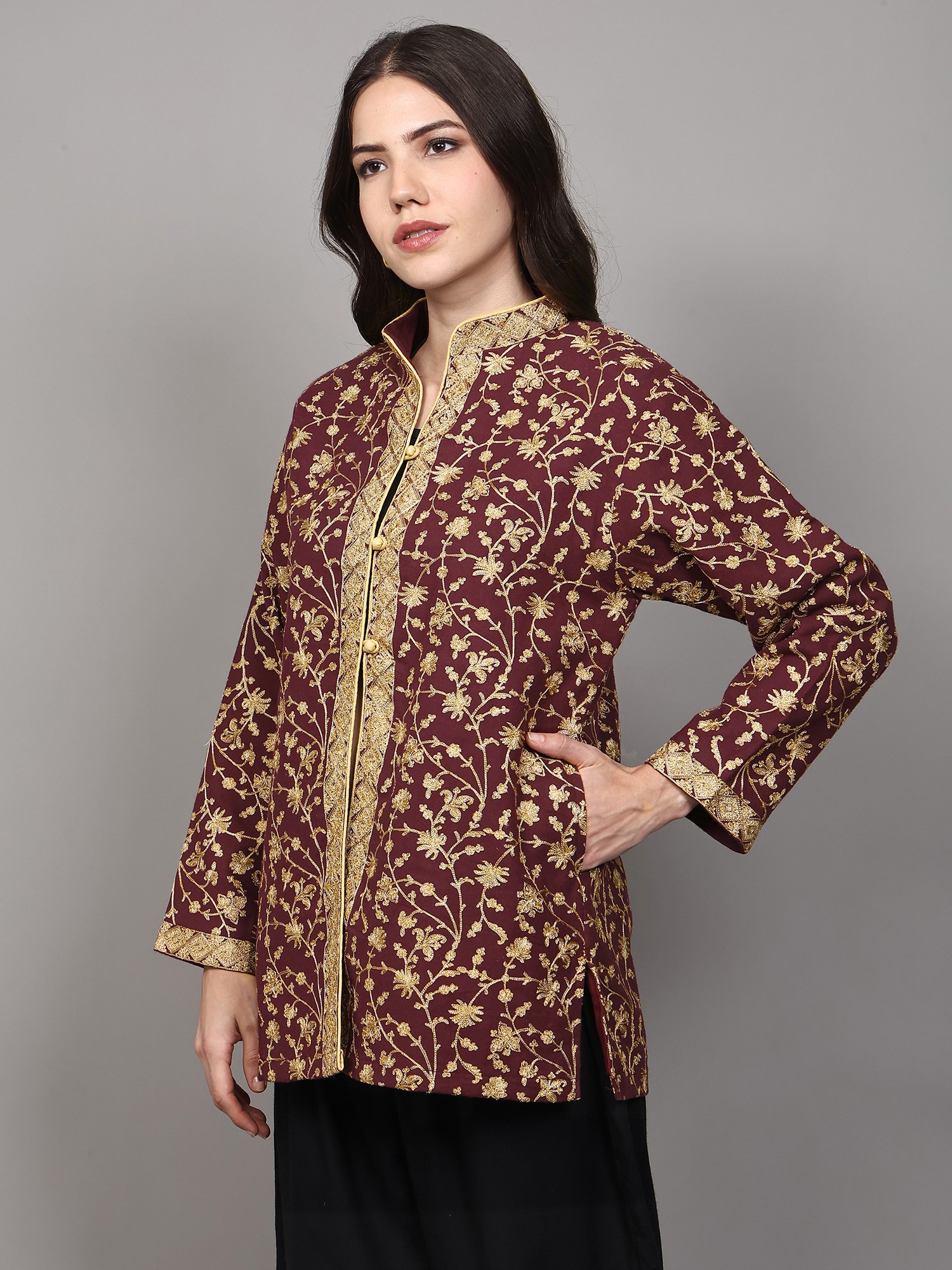 Brazilian-Sand Pure Silk Short Jacket from Kashmir with Floral Vine Aari Embroidery by Hand