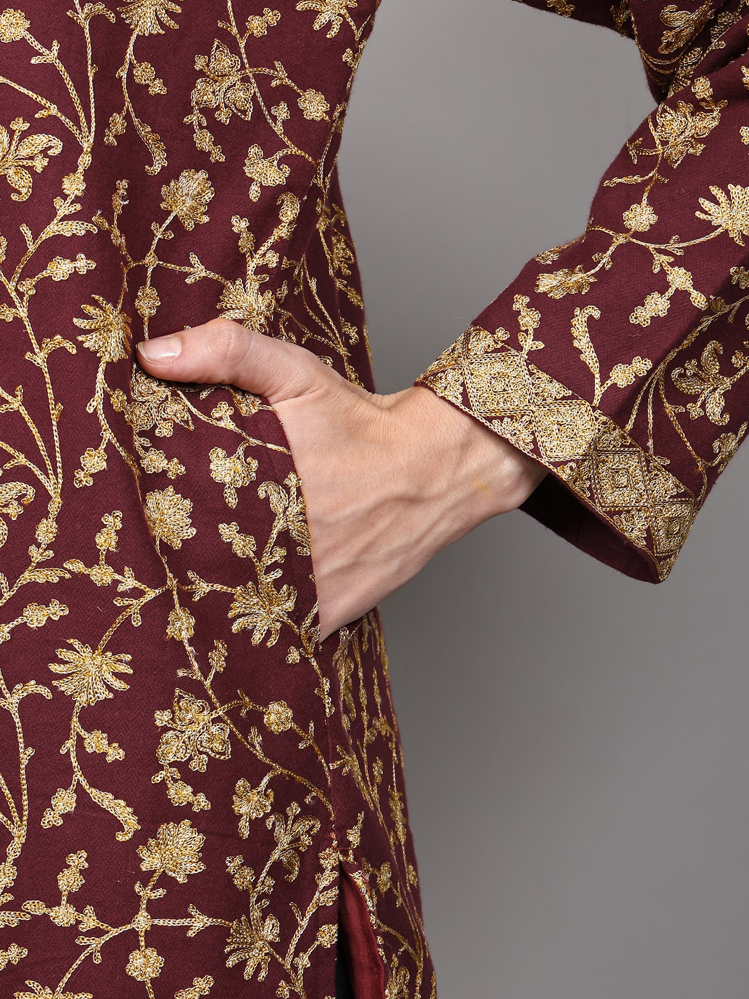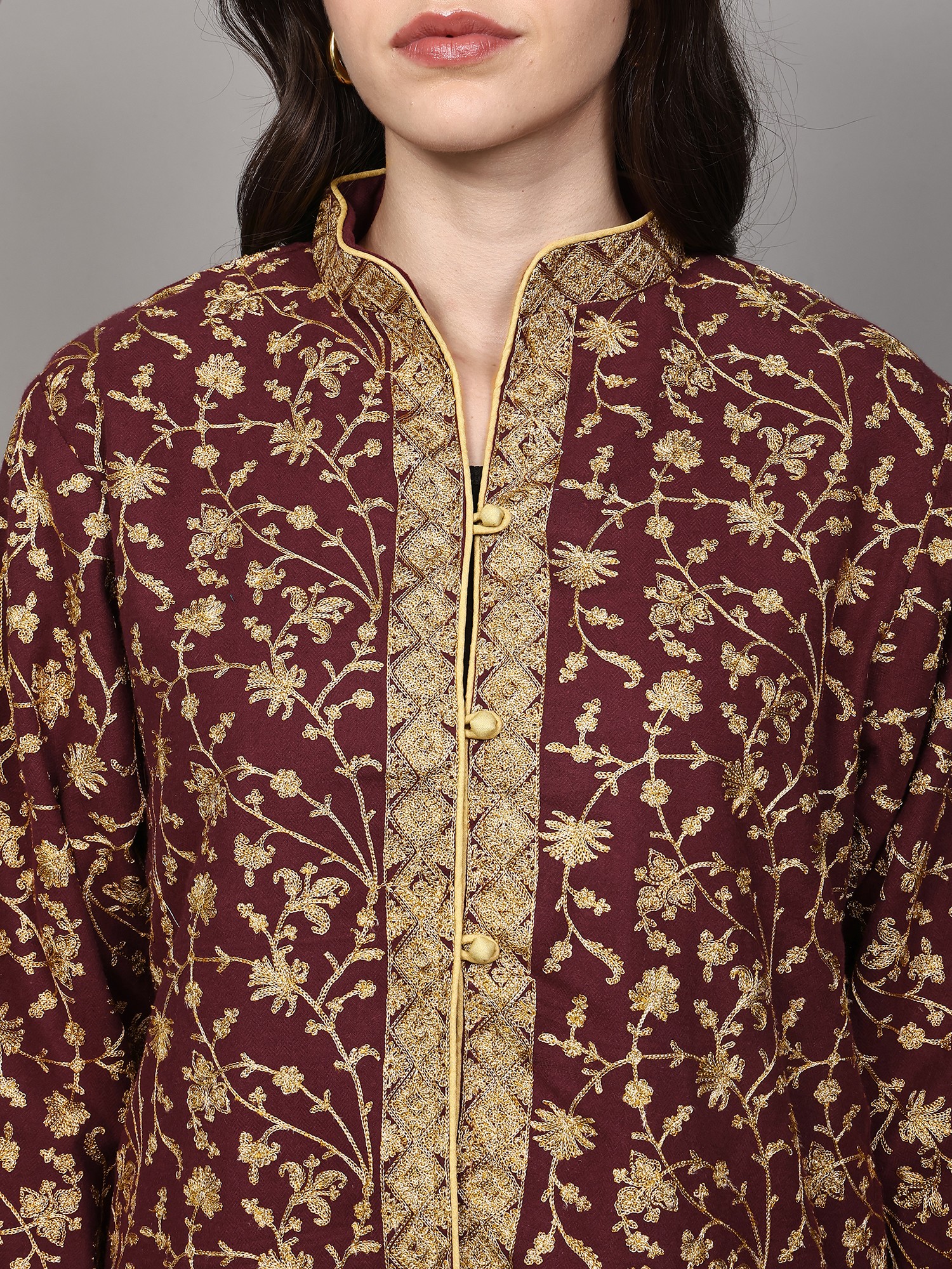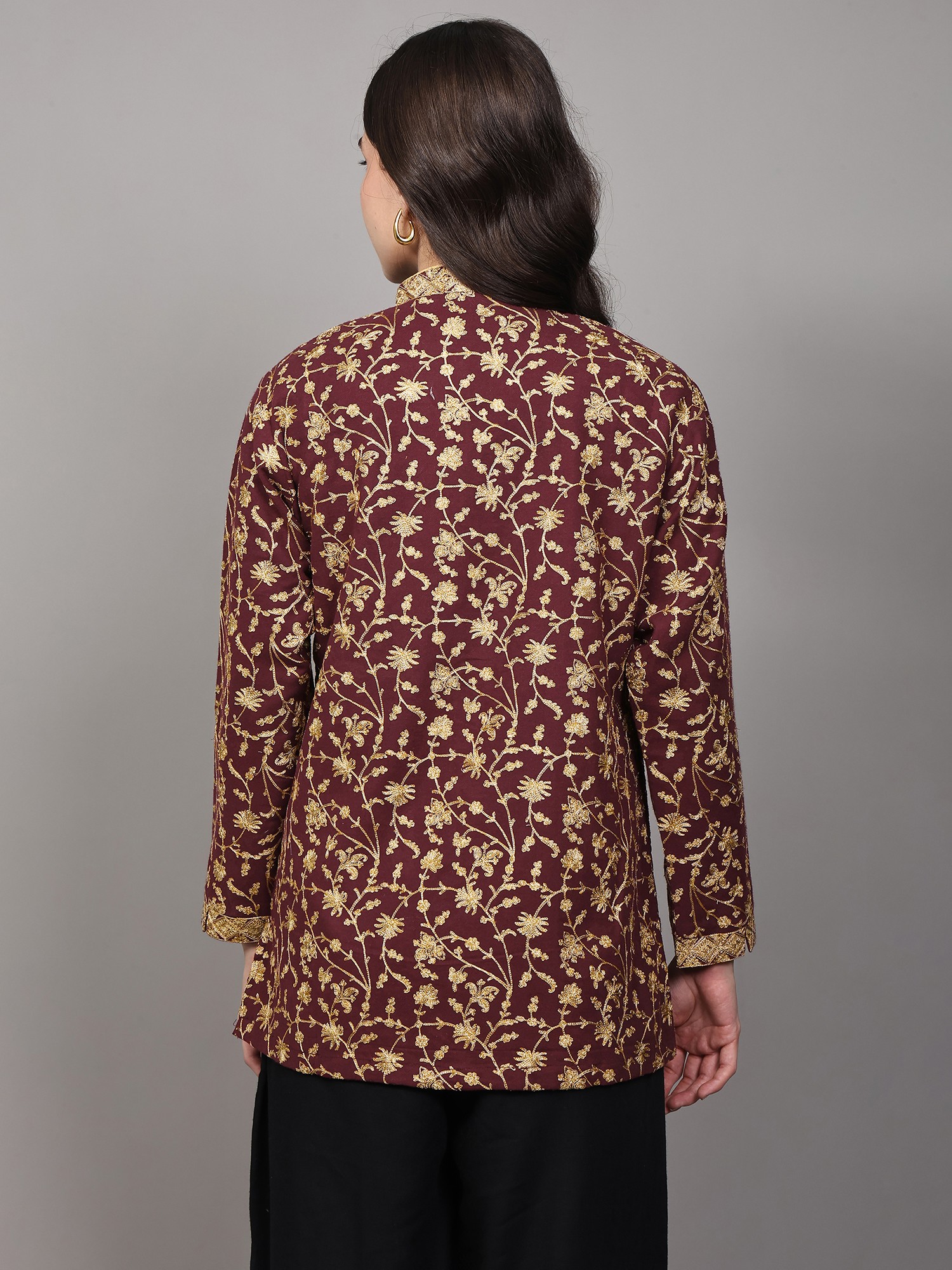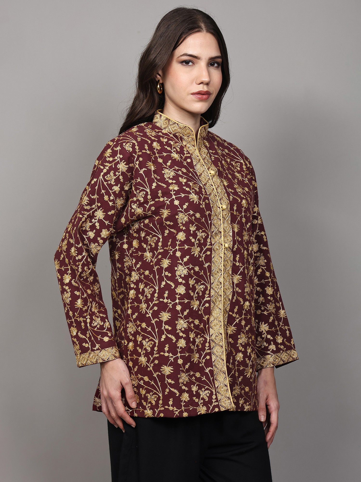 Brazilian-Sand Pure Silk Short Jacket from Kashmir with Floral Vine Aari Embroidery by Hand