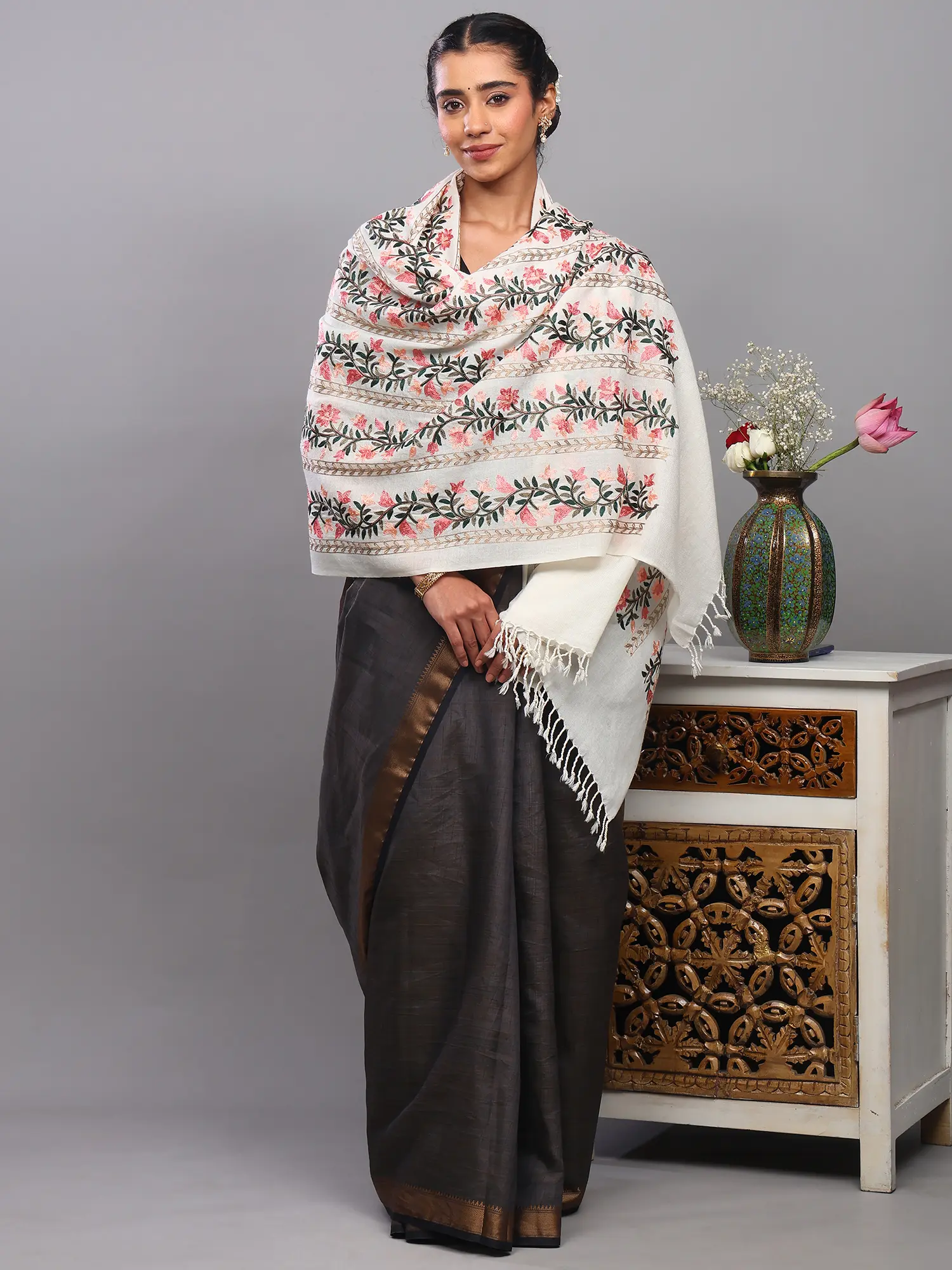 The generous dimensions of this stole offer remarkable versatility in styling. Drape it elegantly over your shoulders with a traditional Indian saree or a contemporary kurta set for a touch of refined sophistication. It can also be wrapped stylishly with western wear, such as a chic coat or a cashmere sweater, adding a bohemian yet luxurious flair to your ensemble. The fringed hem provides a classic finishing touch, adding subtle movement and charm. Whether you are attending a festive gathering, a formal event, or simply seeking to elevate your everyday style, this wool stole is a statement piece that exudes timeless elegance and cultural pride. It’s more than just an accessory; it's a story woven in thread, carrying with it the warmth and artistry of its origin.