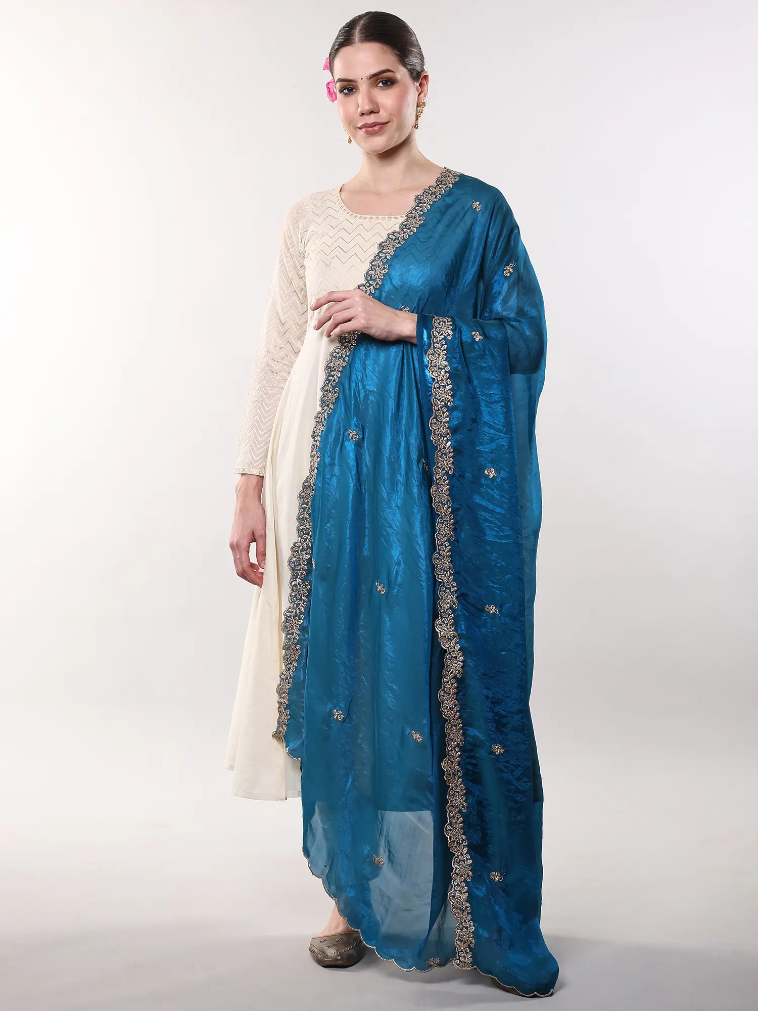 This style of adorned textile has a rich heritage, deeply rooted in cultural celebrations and royal courts. Dupattas, serving as elegant veils or decorative stoles, have long been an integral part of traditional attire, symbolizing grace and refinement. The Zari embroidery technique, using fine metallic threads, has been a hallmark of luxury for centuries, particularly associated with auspicious occasions and significant ceremonies. Owning this piece connects you to this enduring legacy of craftsmanship and aesthetic appreciation.
