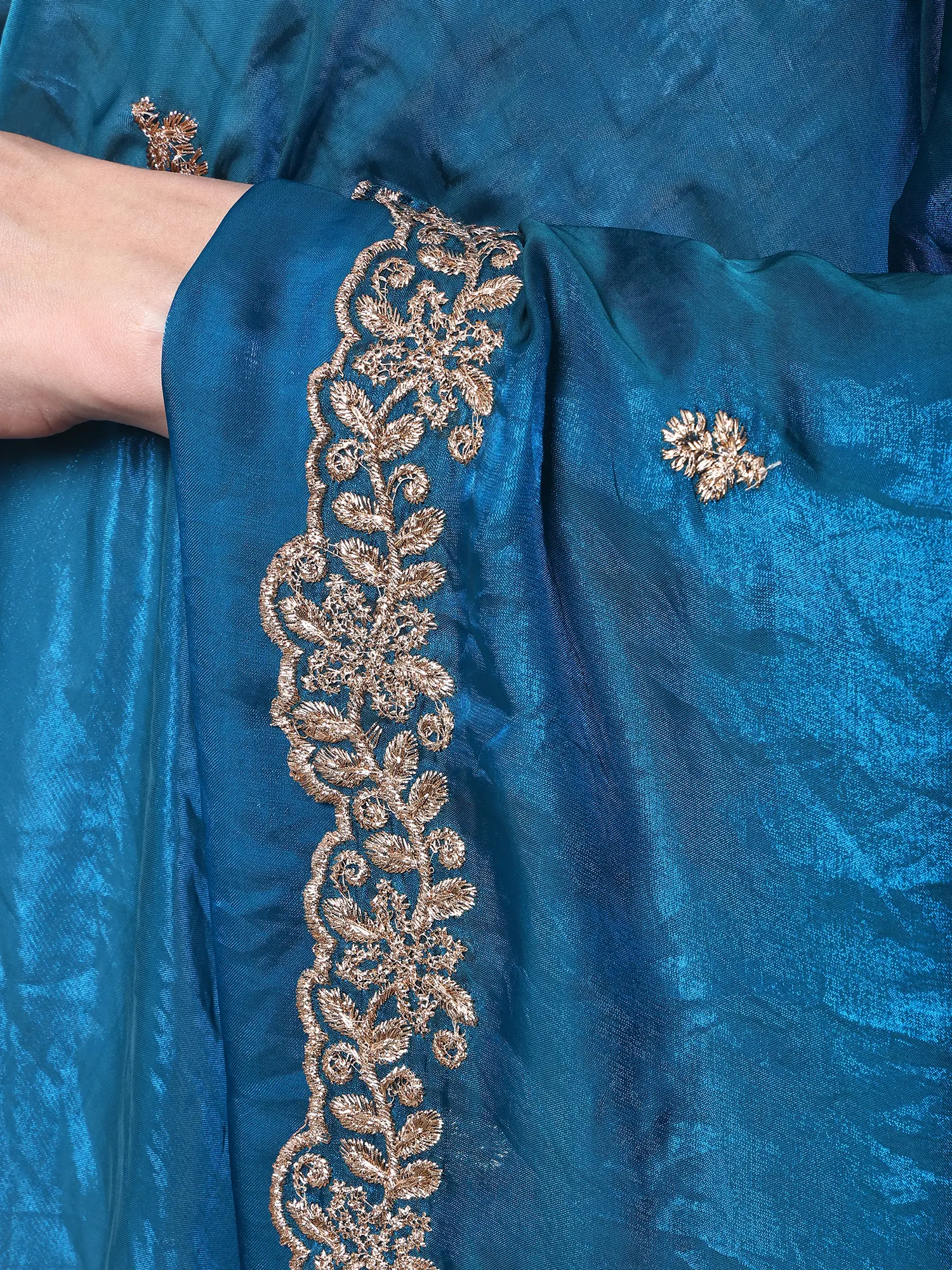 The rich, lustrous surface of the satin silk provides a magnificent canvas for the detailed embellishments. You'll appreciate the way the fabric drapes, offering both fluidity and a captivating shimmer. Adorning the edges, a scalloped border, itself intricately embroidered, frames the piece with a delicate artistry. Scattered floral motifs, brought to life with Zari threads and subtle beads, add a touch of enchanting detail across the expansive length, measuring 96 inches, and generous width of 39 inches.
