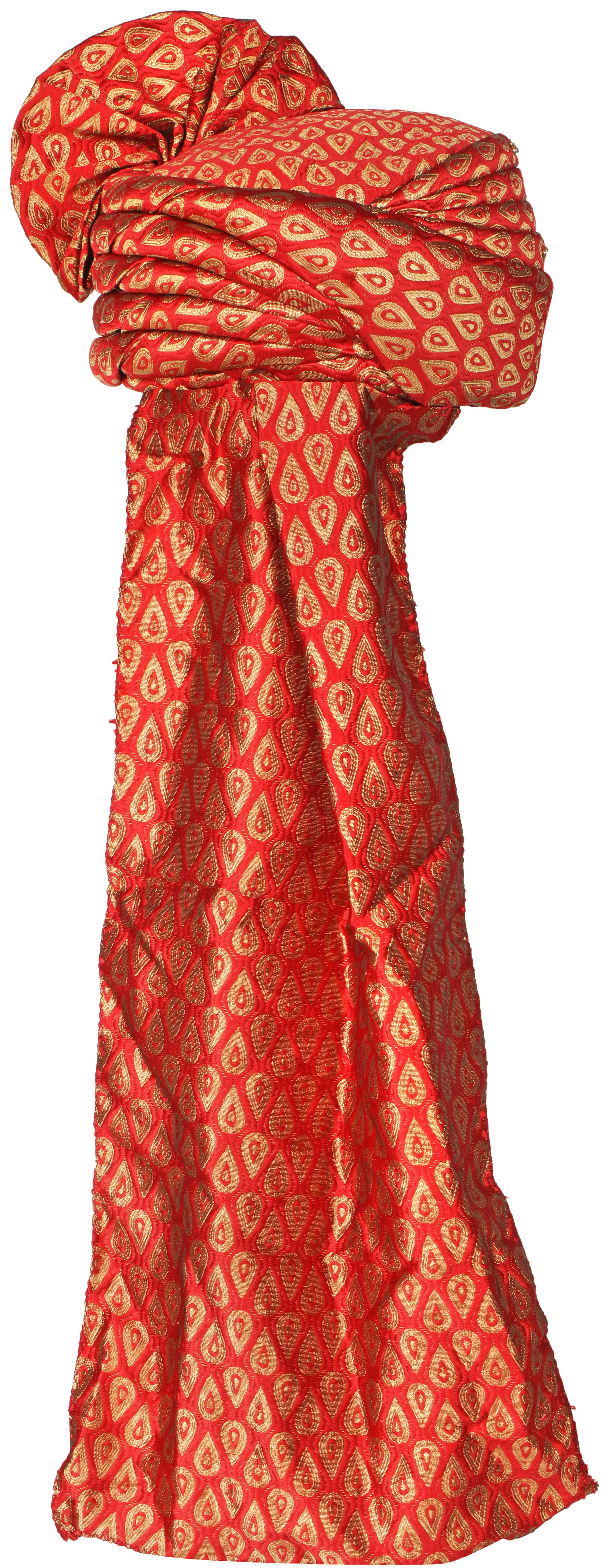 Elevate your wedding ensemble or ceremonial attire with the unmatched splendor of this meticulously crafted red pagdi. Designed for the discerning groom or for significant cultural celebrations, this turban is a testament to timeless tradition and luxurious craftsmanship. The vibrant red hue, interwoven with opulent gold zari threads, creates a rich tapestry of intricate patterns that capture the essence of regal elegance. Each swirl and curve of the fabric is a celebration of heritage, designed to make a statement of pride and distinction.