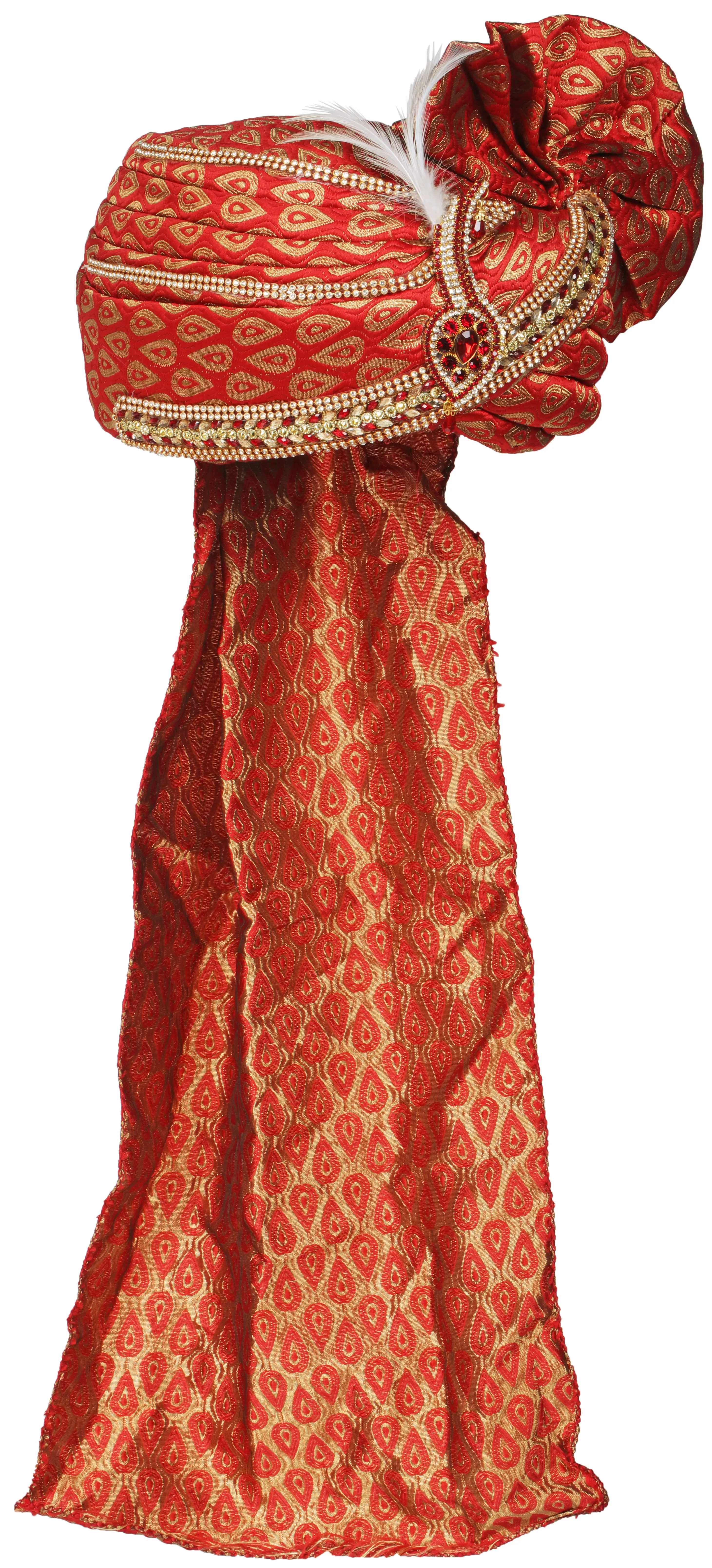 No royal headwear is complete without a distinguished adornment, and this pagdi boasts a truly remarkable one. A magnificent kalgi, meticulously embellished with a dazzling array of crystals and pearls, is the focal point of the turban. The rich reds and golds of the kalgi echo the vibrant colors of the pagdi itself, creating a harmonious and striking visual. Nestled elegantly within the kalgi, a pristine white feather adds a touch of grace and sophistication, symbolizing purity and honor. This intricate embellishment is not merely an accessory; it is a declaration of the wearer's importance and the significance of the occasion.