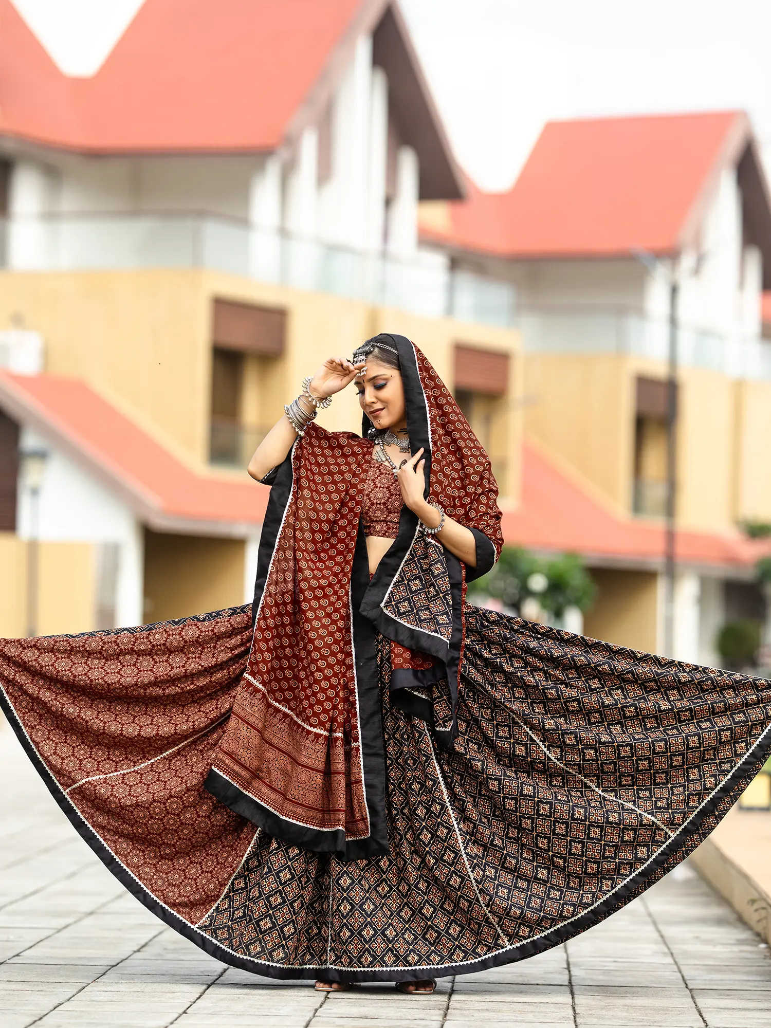 Adding to the allure of this traditional wear is the subtle yet impactful embroidery work. Delicate threads have been skillfully used to enhance the beauty of the prints, providing a touch of traditional elegance without being overpowering. The black borders, accented with a delicate white lace trim, frame the prints beautifully, adding a refined finish to both the lehenga and the sleeves of the choli. This attention to detail ensures that every element of the outfit contributes to its overall charm.