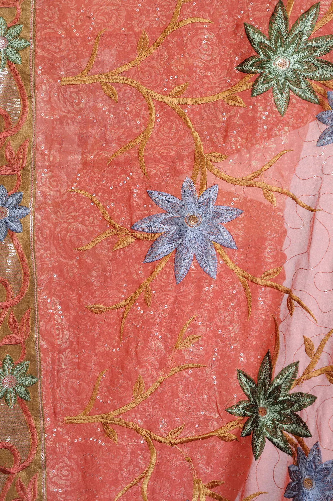 Enhance your allure with the Redwood Shimmering Saree, a symphony of elegance and charm. Large embroidered flowers adorn the fabric, their intricate beauty adding depth to each fold. The thick border frames the drape with a touch of opulence, enhancing its allure. As you embrace the Saree's luxurious texture and the grace of its design, you become a walking masterpiece of floral elegance. Let every step be a dance of petals, a celebration of beauty woven into every thread. With the Redwood Saree, your presence becomes a canvas of enchantment, capturing hearts with its timeless appeal.