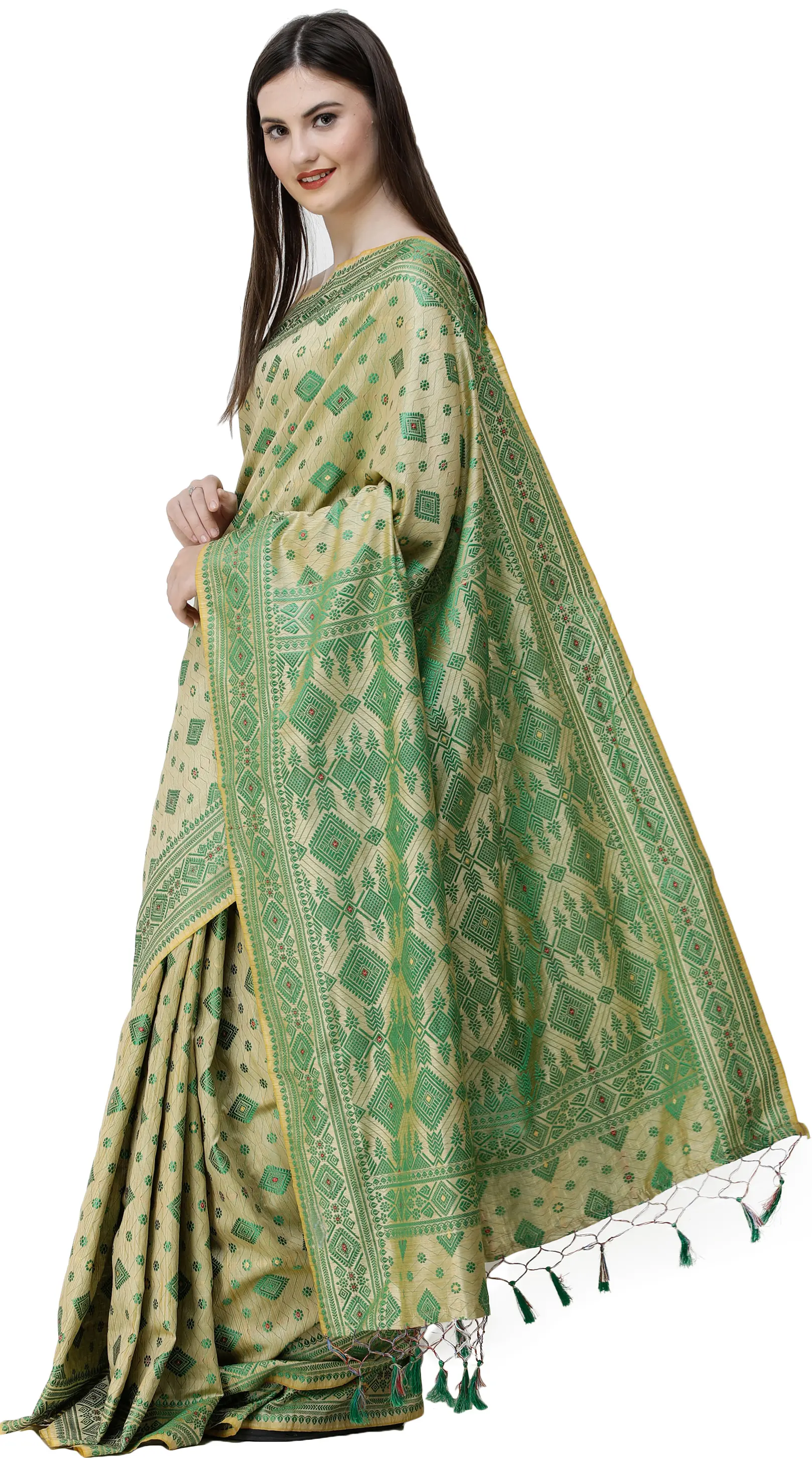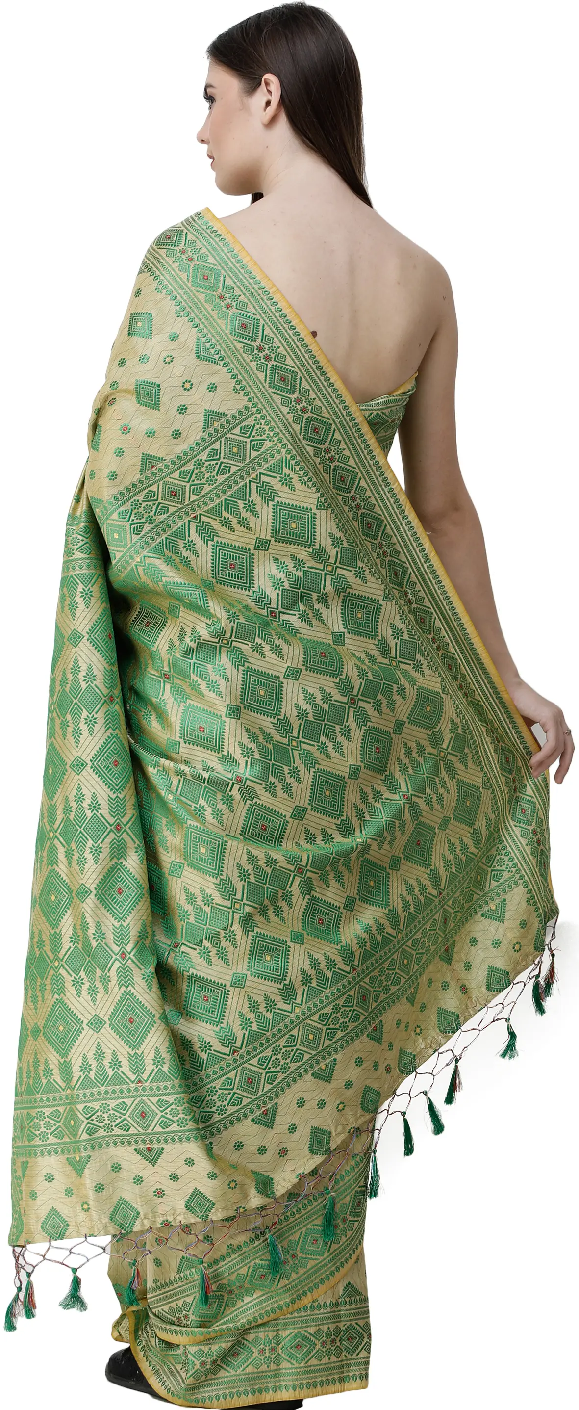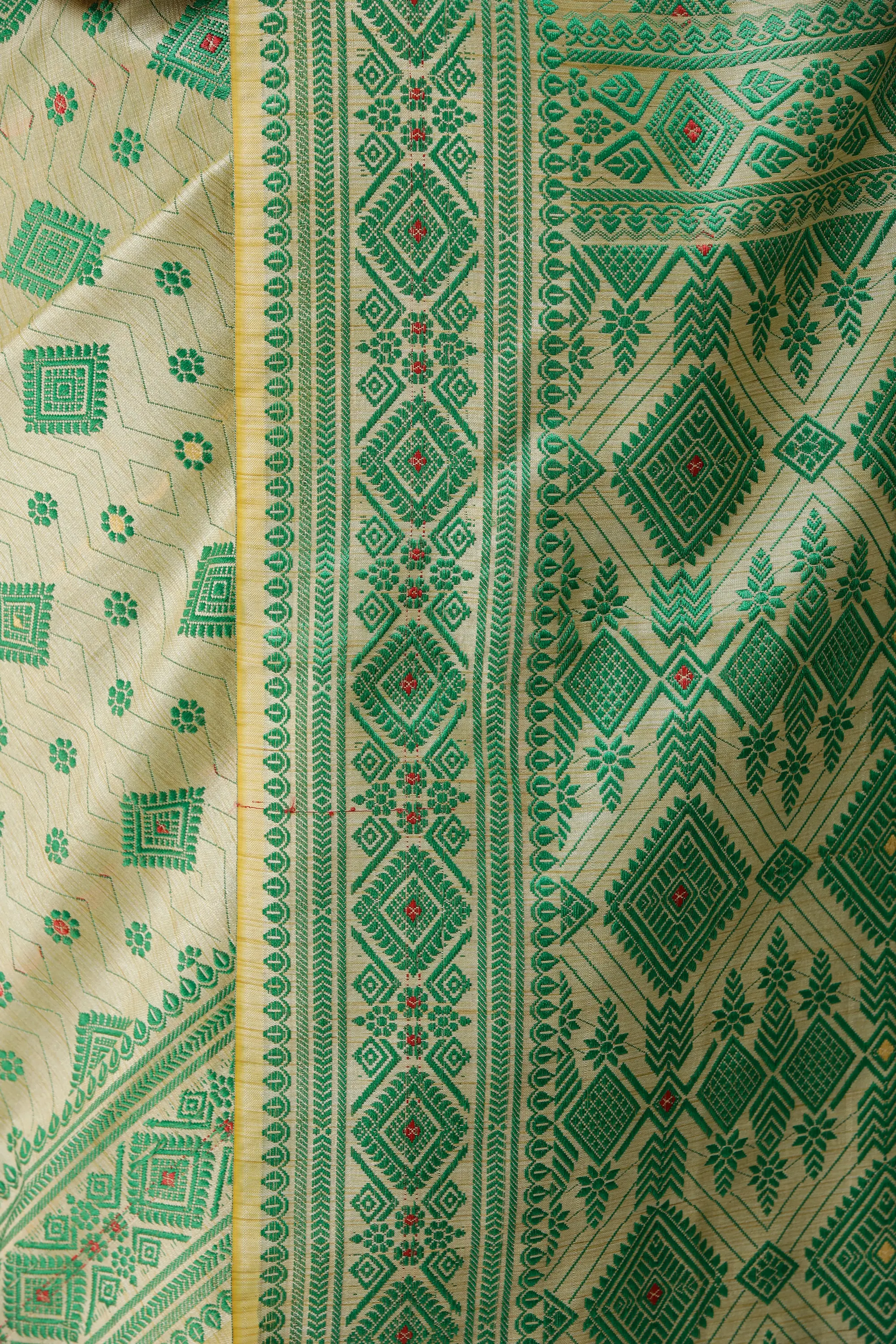 Reed-Yellow and Green Sari from Assam with Woven Motifs