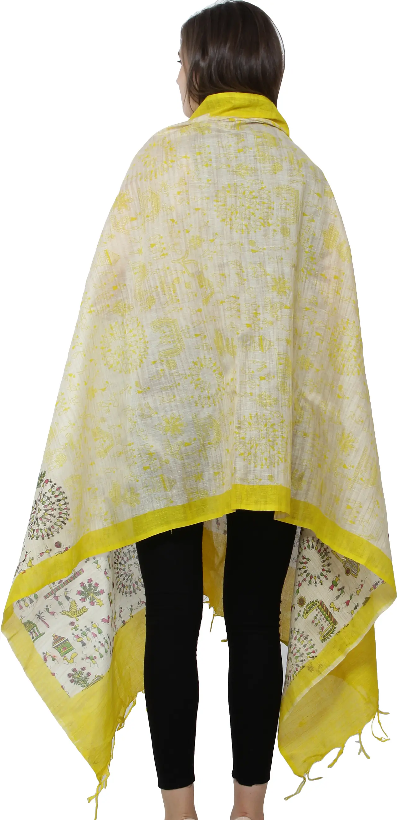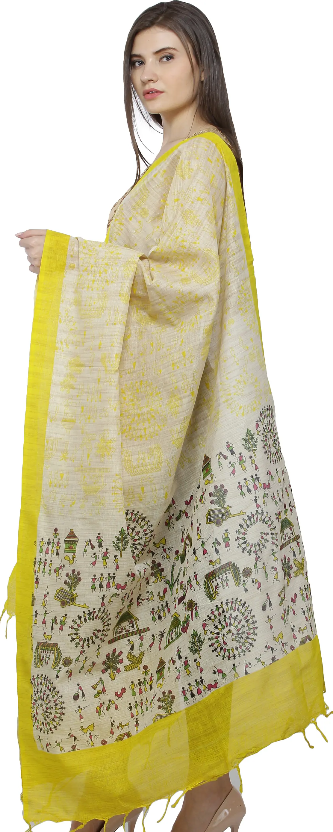 Beige-colored Warli Fabric with Block-Printed Chakra of Life
