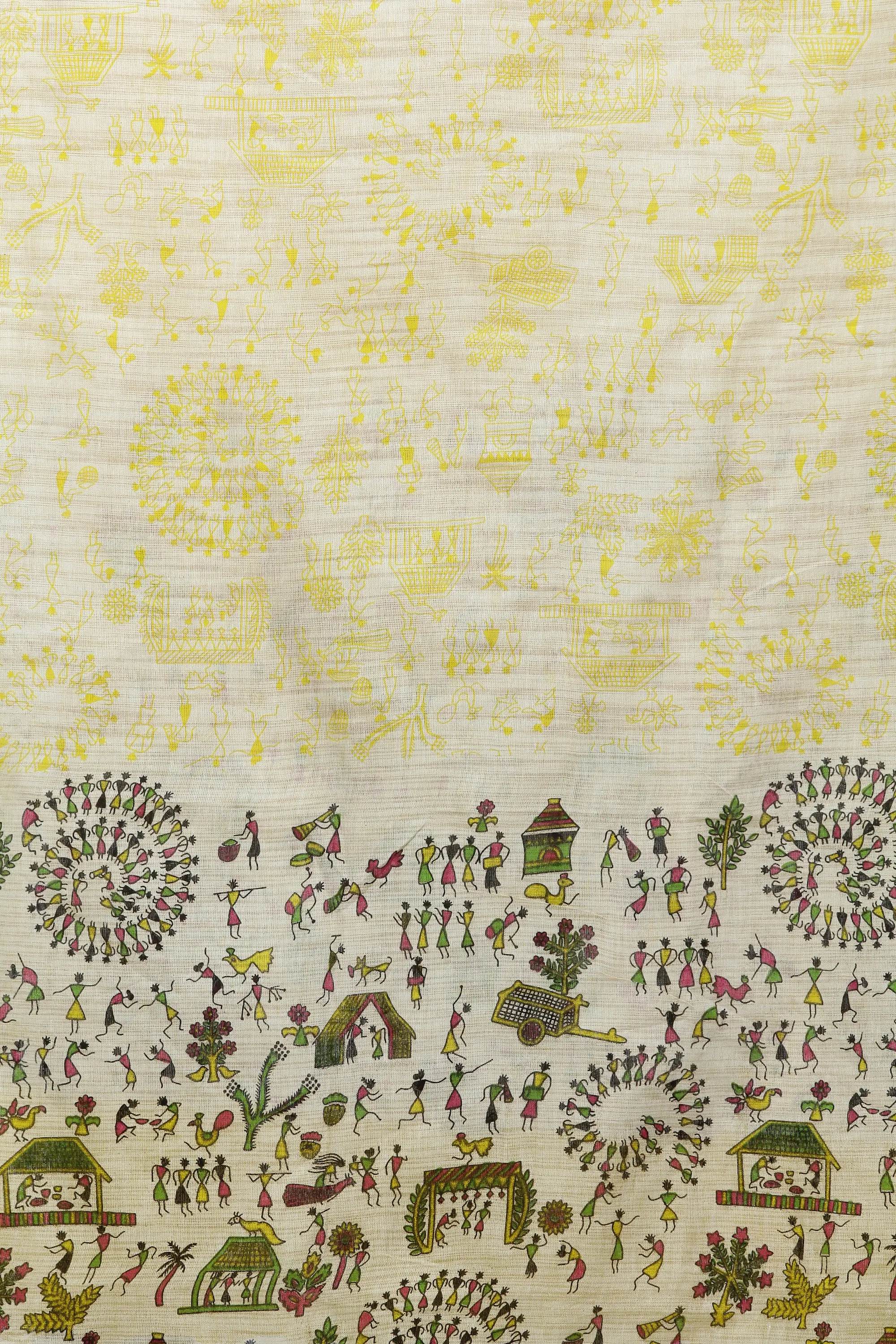 Kalamkari Saree from Telangana with Printed Warli Folk Art Motifs and Peacock-Elephant on Anchal