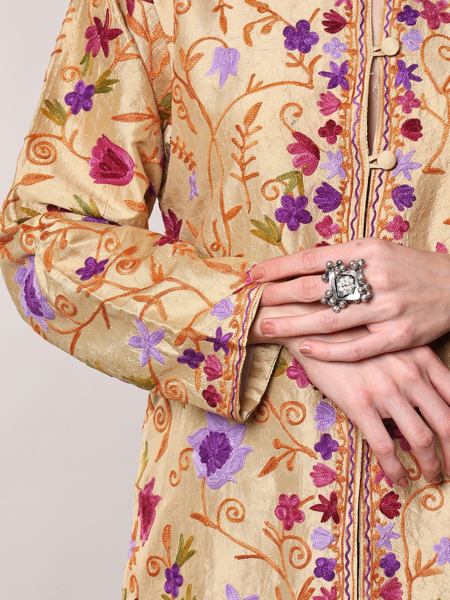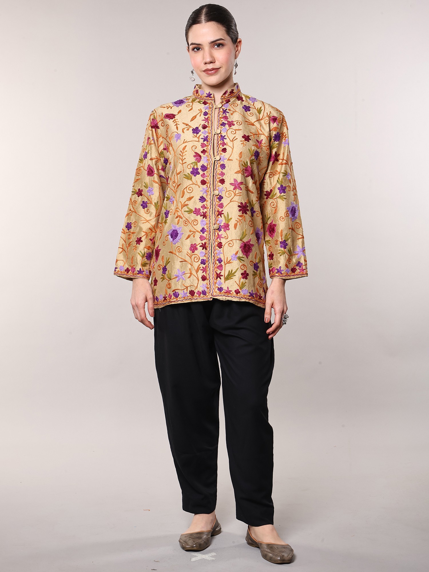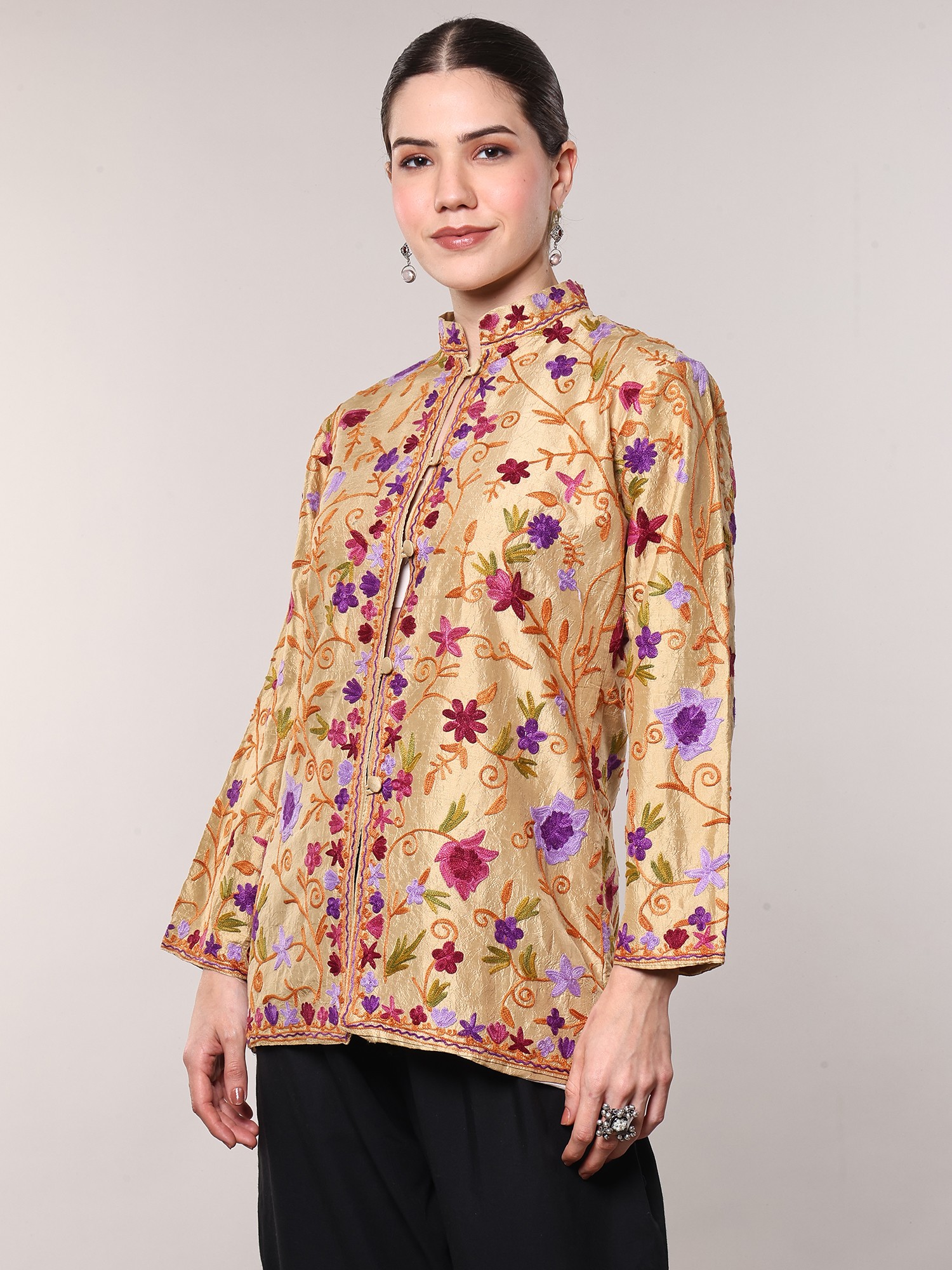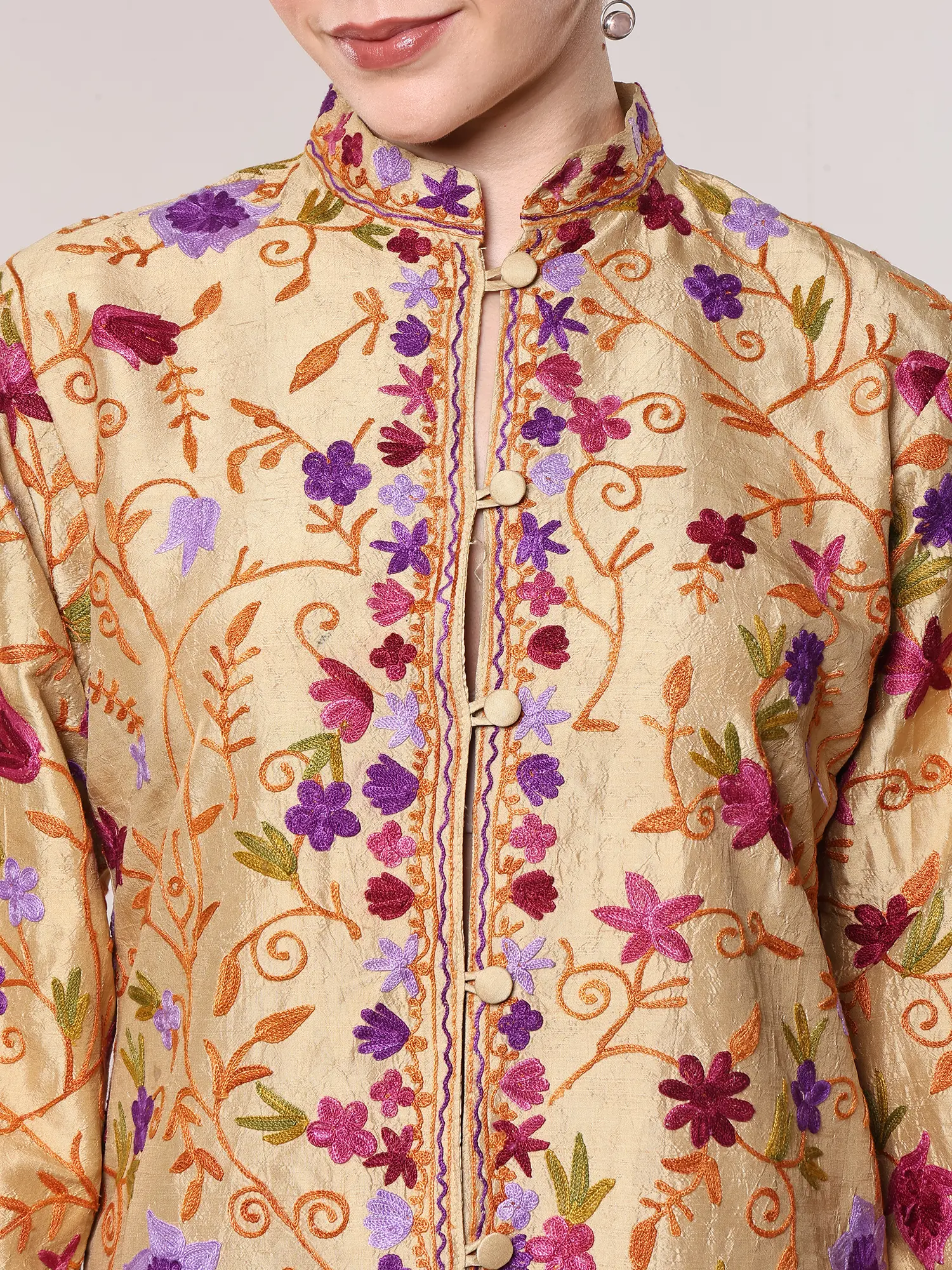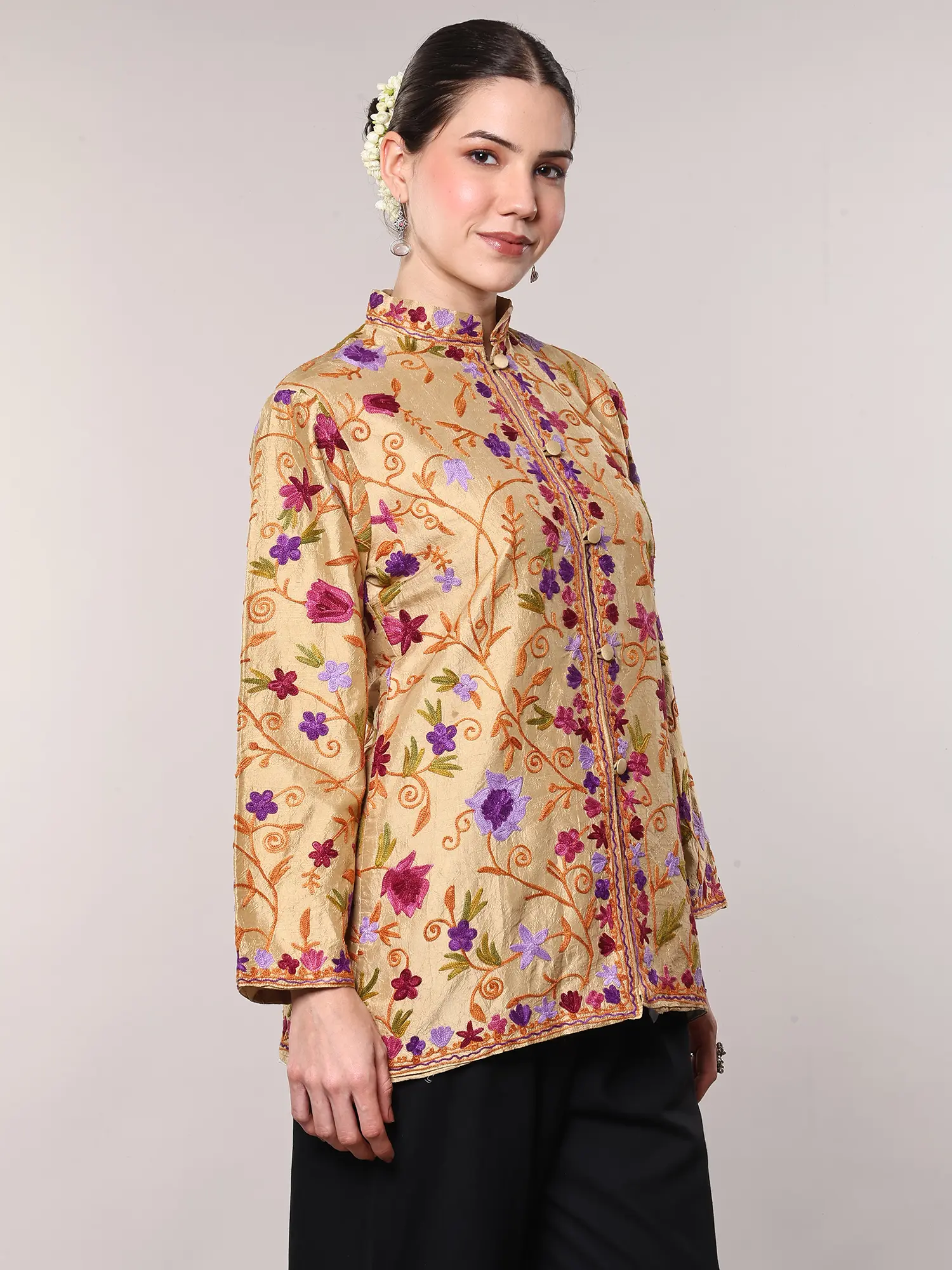 Step into a world of refined elegance with this exquisite short jacket, a testament to traditional Kashmiri craftsmanship and luxurious pure silk. The warm, reed-yellow hue of the silk provides a radiant canvas for an intricate tapestry of Aari embroidery. Delicate floral vines, rendered in vibrant shades of purple, pink, and green, weave their way across the fabric, creating a mesmerizing visual dance. Each stitch is a testament to the artisan's skill, bringing to life a garden of blossoms that bloom with every movement.