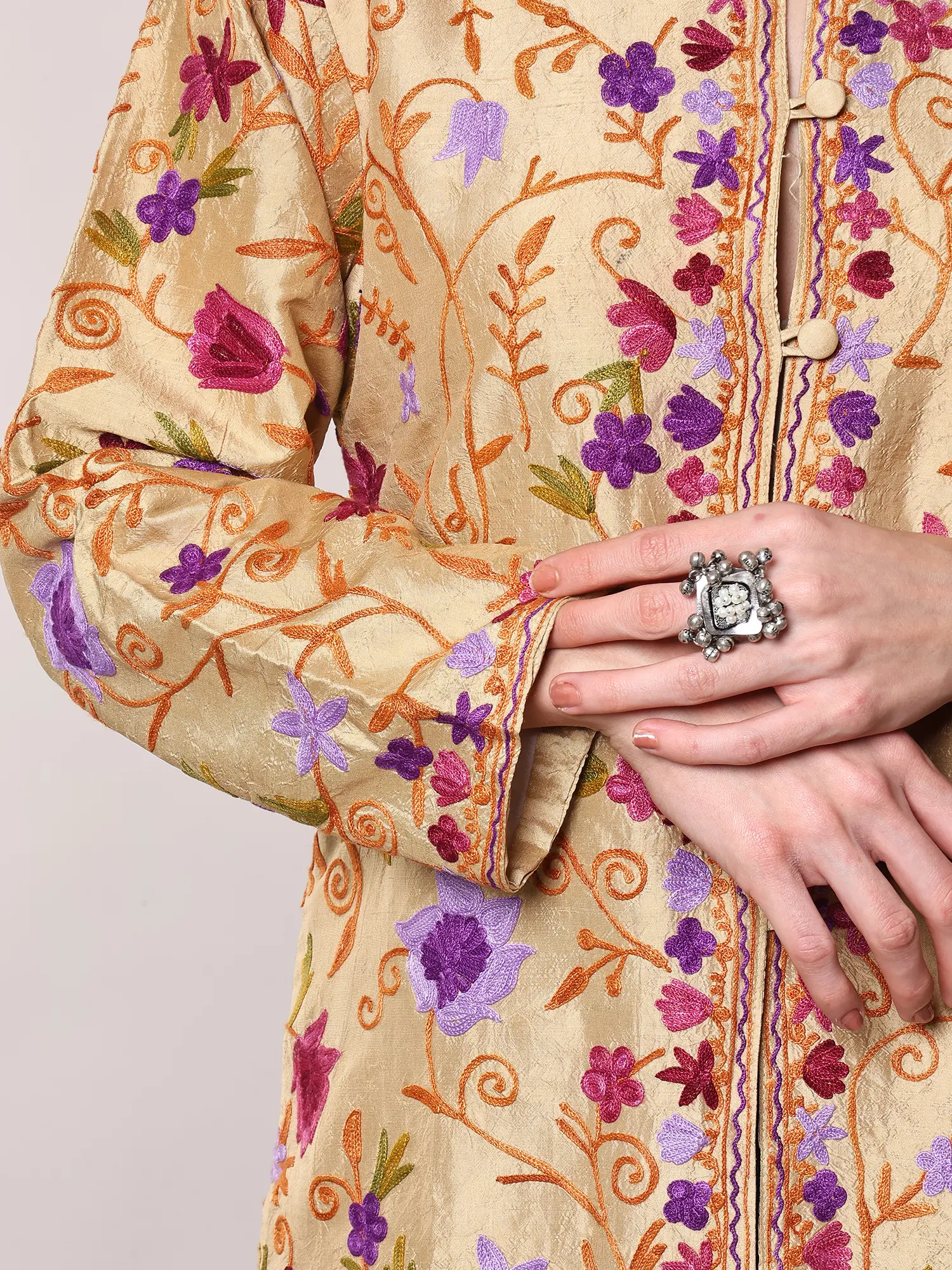 Brazilian-Sand Pure Silk Short Jacket from Kashmir with Floral Vine Aari Embroidery by Hand
