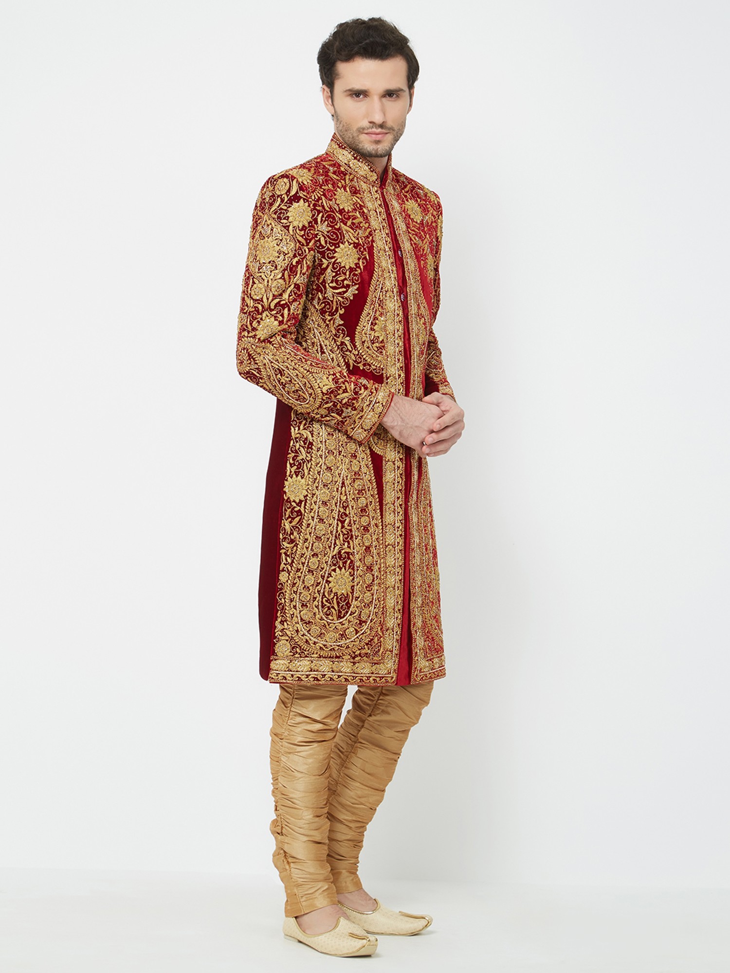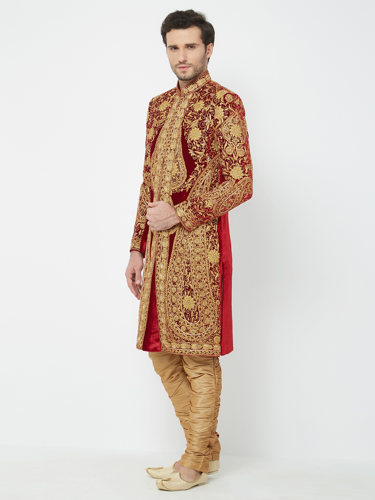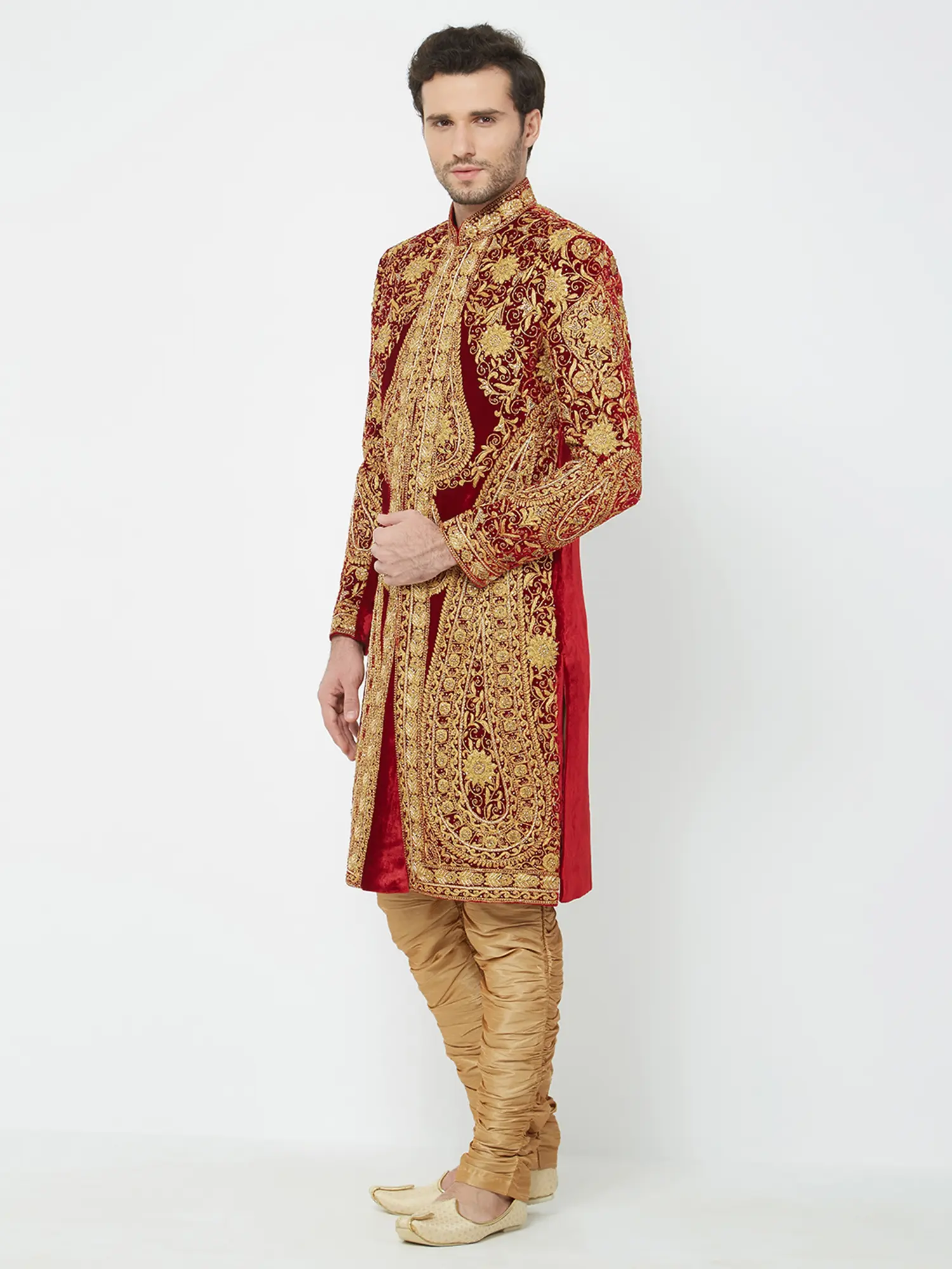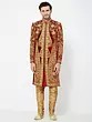 Features a rich red art silk sherwani adorned with opulent gold embroidery.