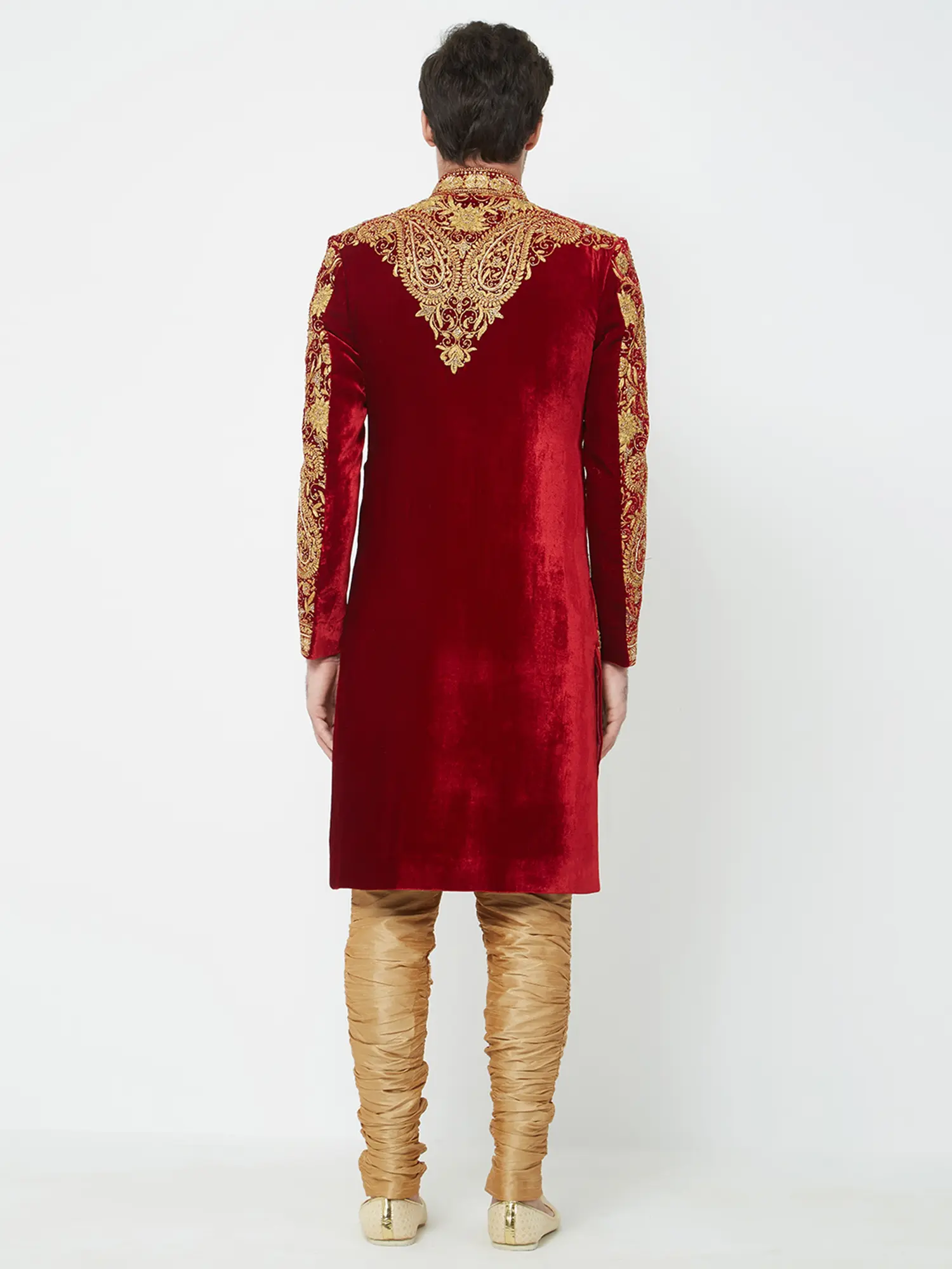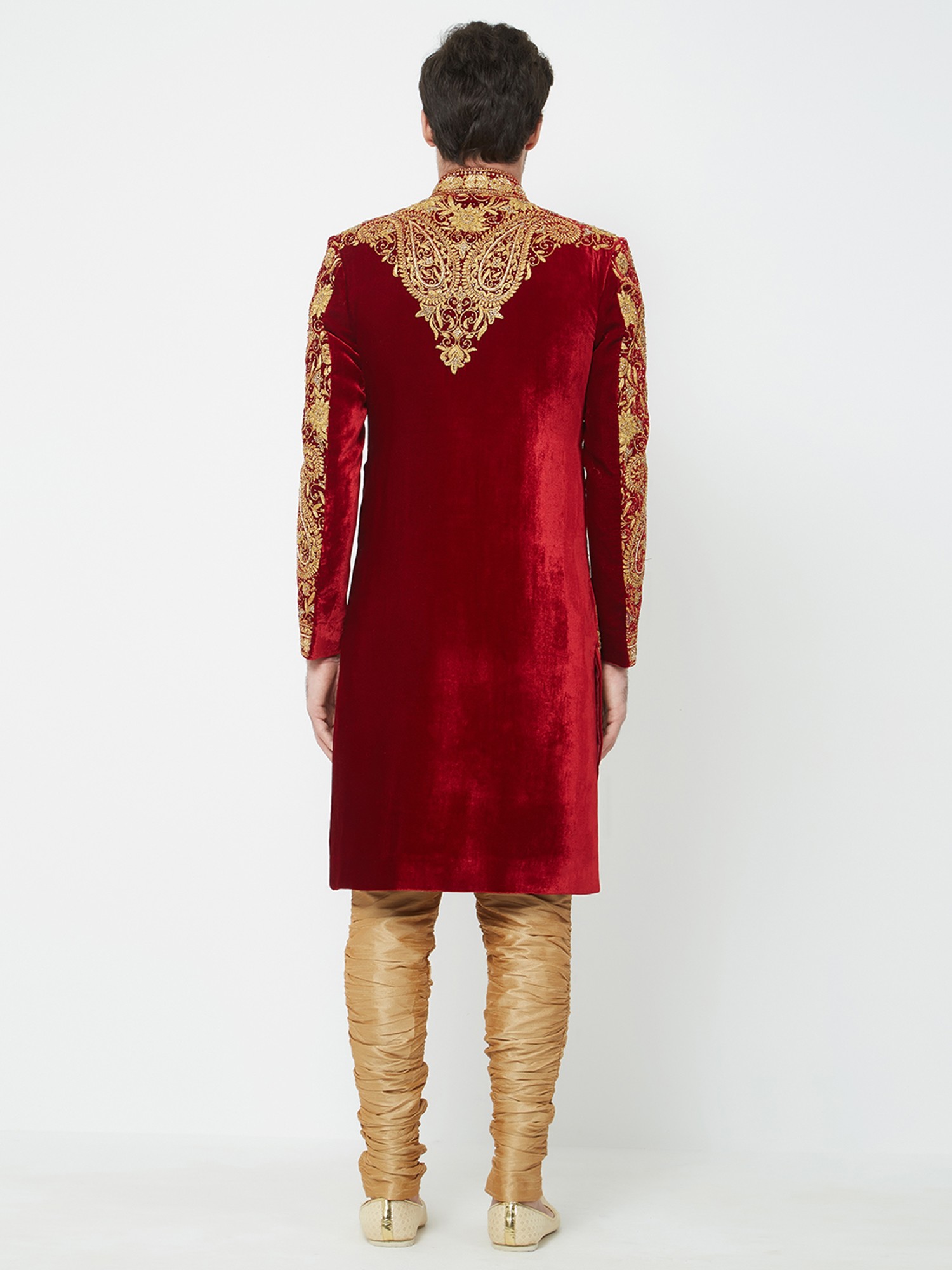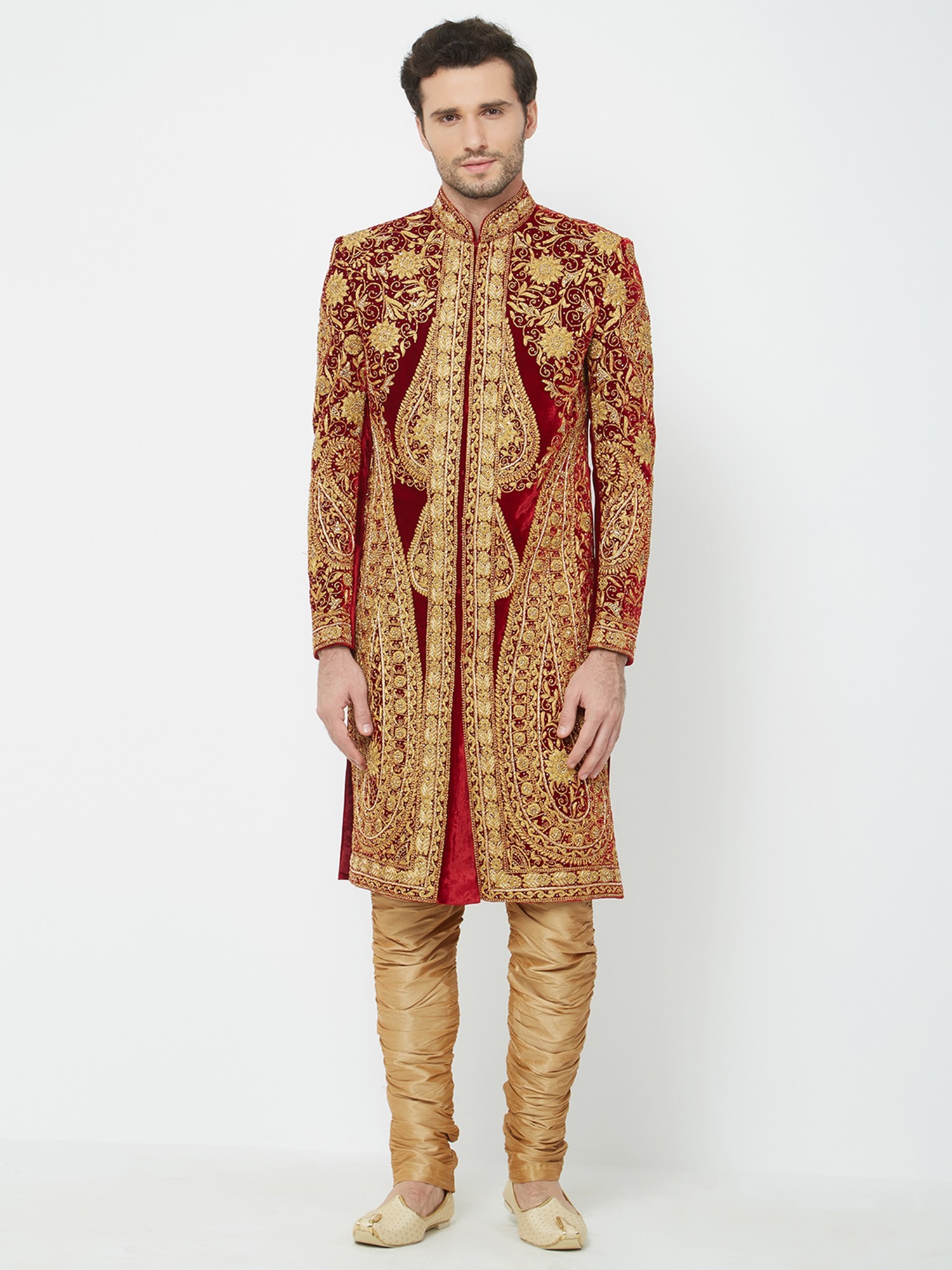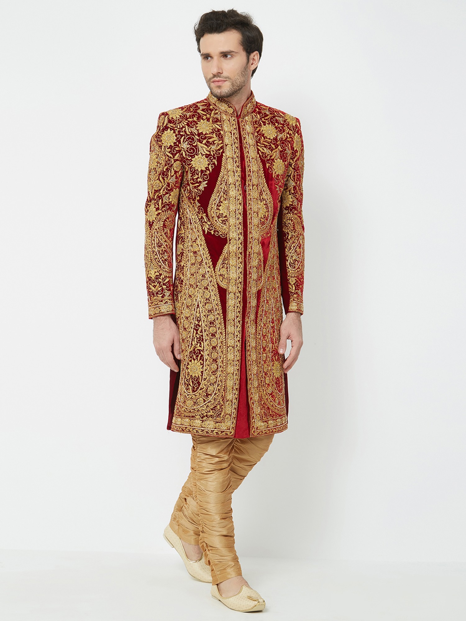 Features a rich red art silk sherwani adorned with opulent gold embroidery.