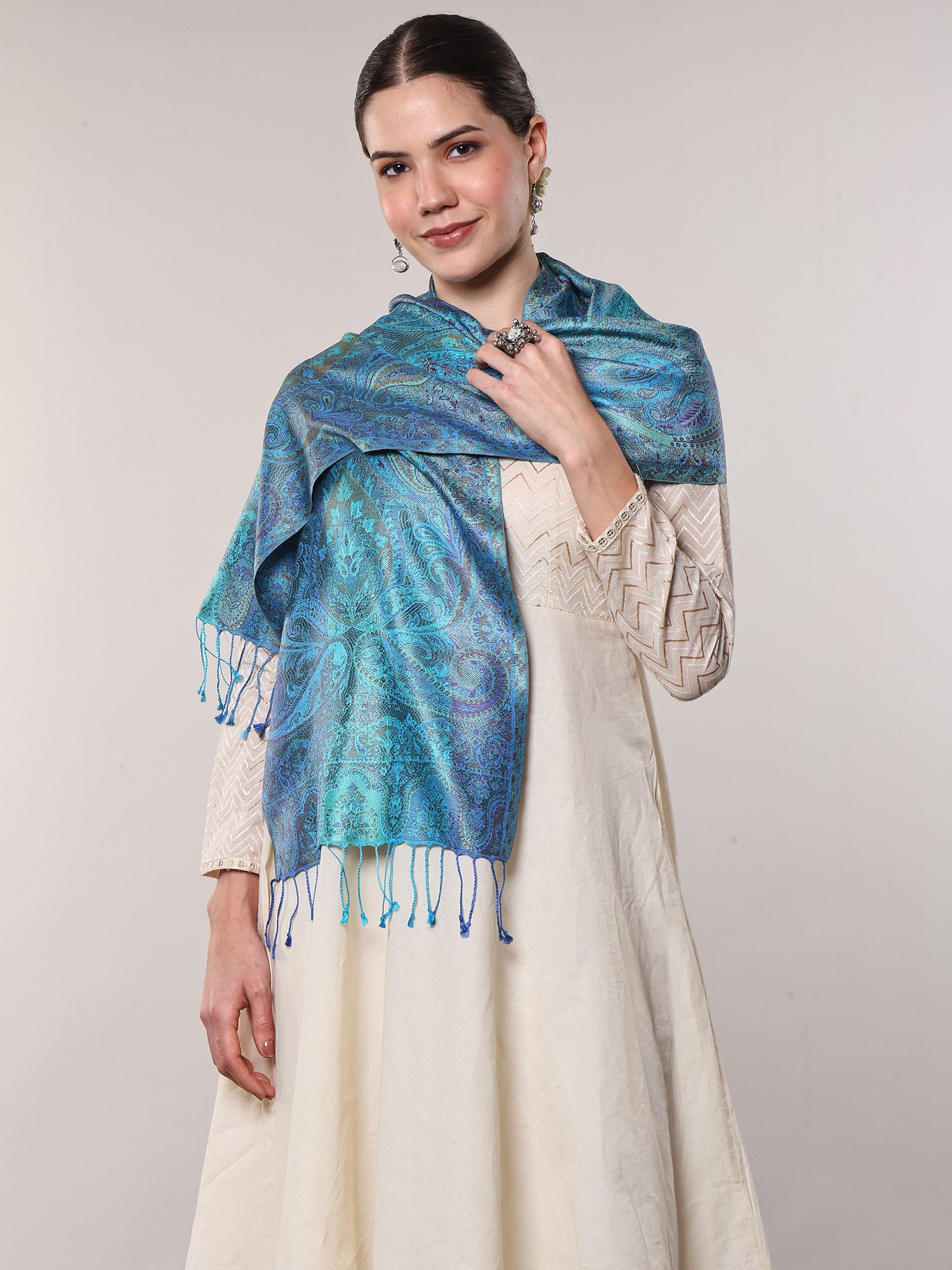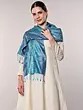 The Jamawar technique, a hallmark of Mughal-inspired textiles, is showcased with stunning precision. Each thread is meticulously woven to create a richly detailed tapestry that feels as opulent as it looks. The vibrant hues of turquoise, sapphire, and emerald blend seamlessly, evoking the depth and shimmer of the ocean or a lush forest canopy. This scarf is not merely an accessory; it's a wearable piece of art, a testament to centuries of skill and tradition. The pure silk fabric lends a weightless drape and a subtle sheen that catches the light beautifully, enhancing the intricate patterns and ensuring a comfortable, elegant feel against the skin.