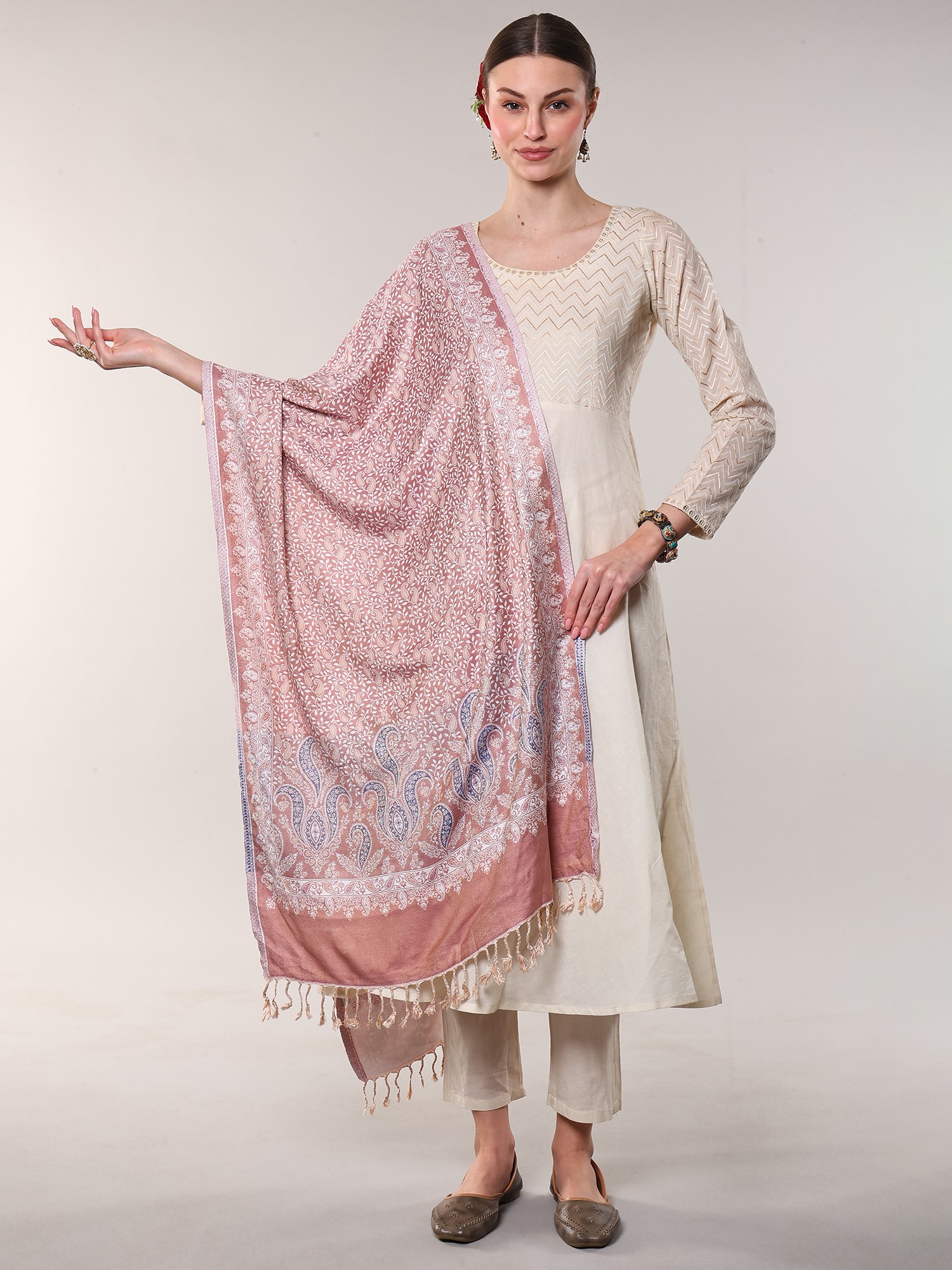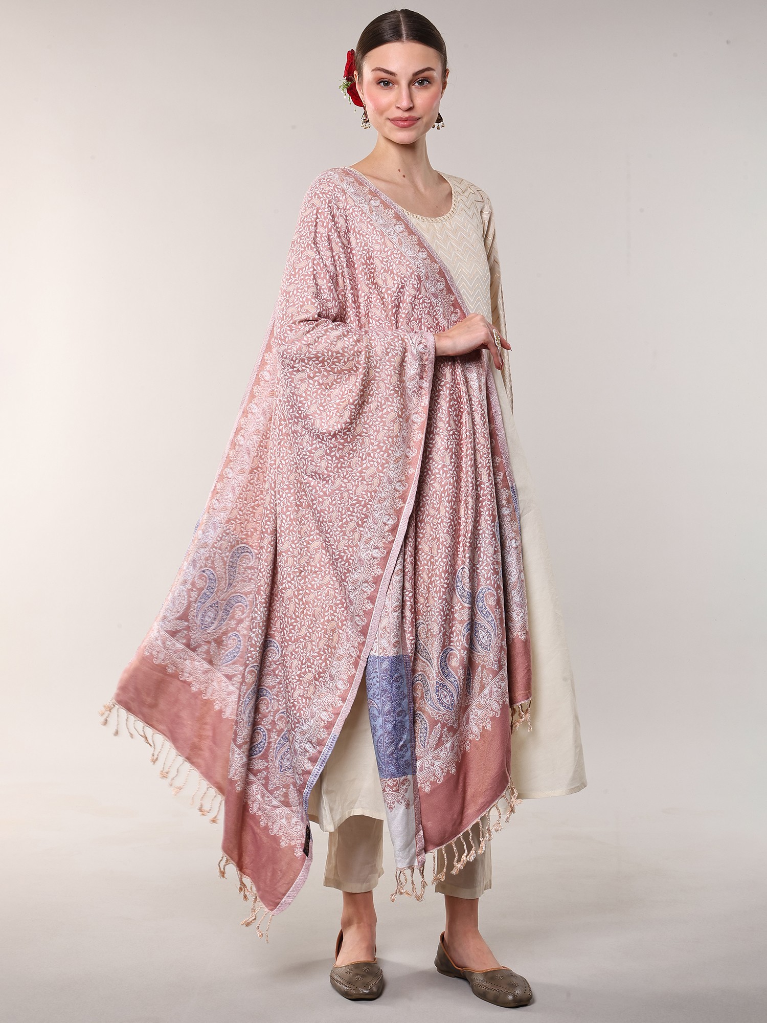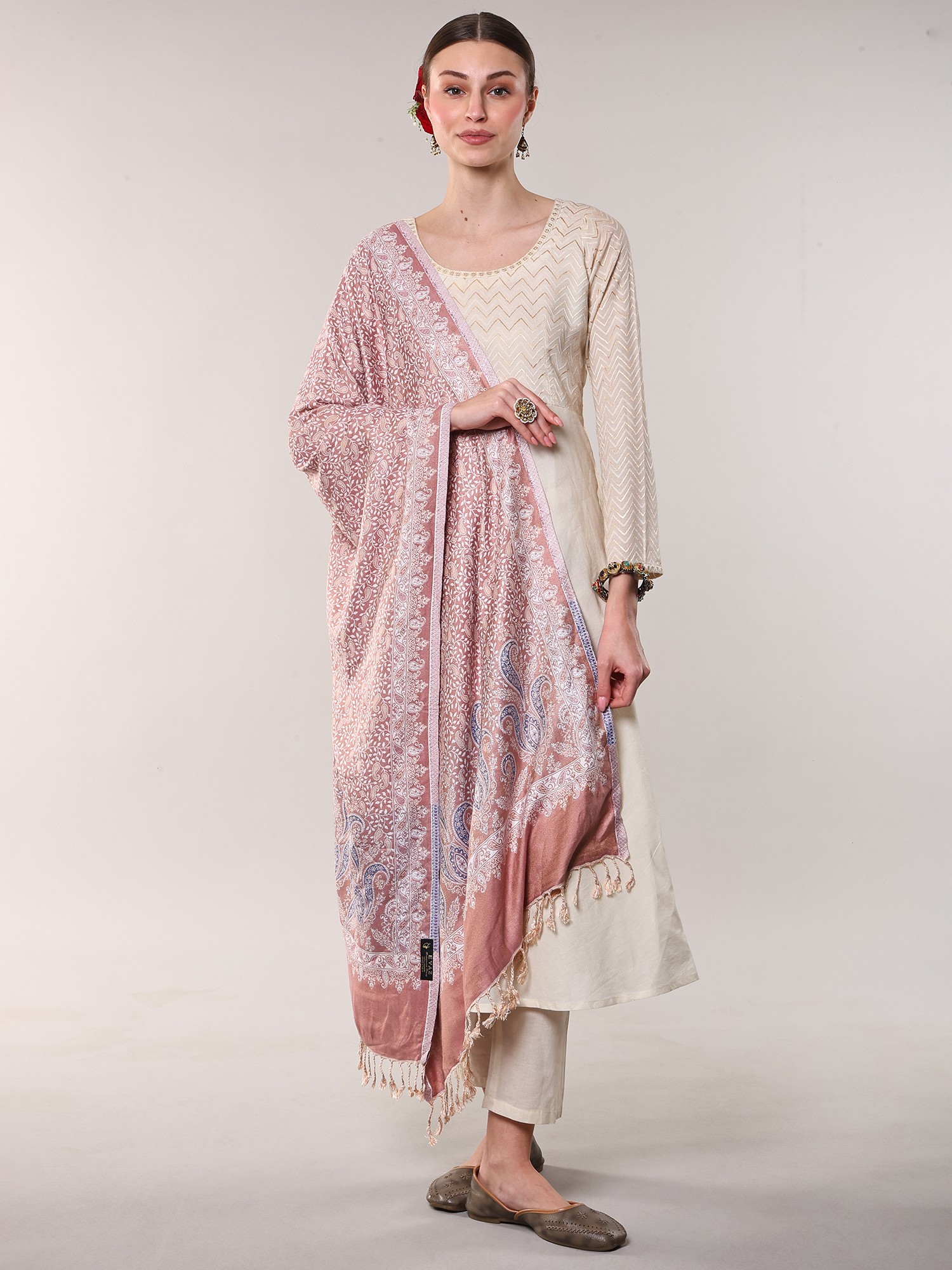 Experience the unparalleled versatility of this reversible stole. One side features a delicate, light mint green paisley jaal on an off-white base, exuding a sense of effortless sophistication. The reverse side reveals a stunning palette of muted mauve and mint paisley patterns on a cream background, offering a subtler yet equally enchanting aesthetic. The choice is yours; effortlessly adapt your style to the occasion. This reversible feature makes it the perfect companion for various outfits and moods, ensuring you're always impeccably styled.
