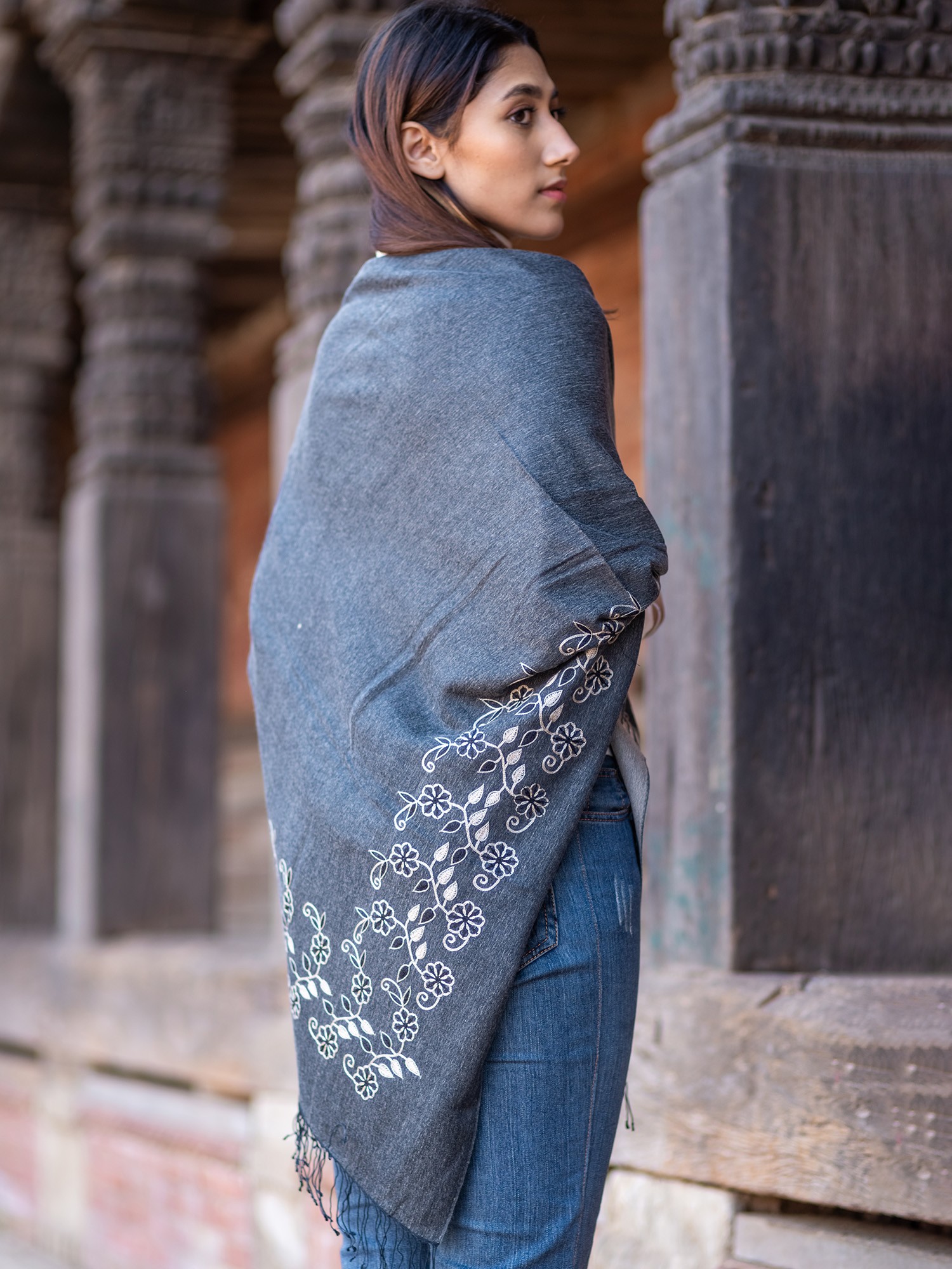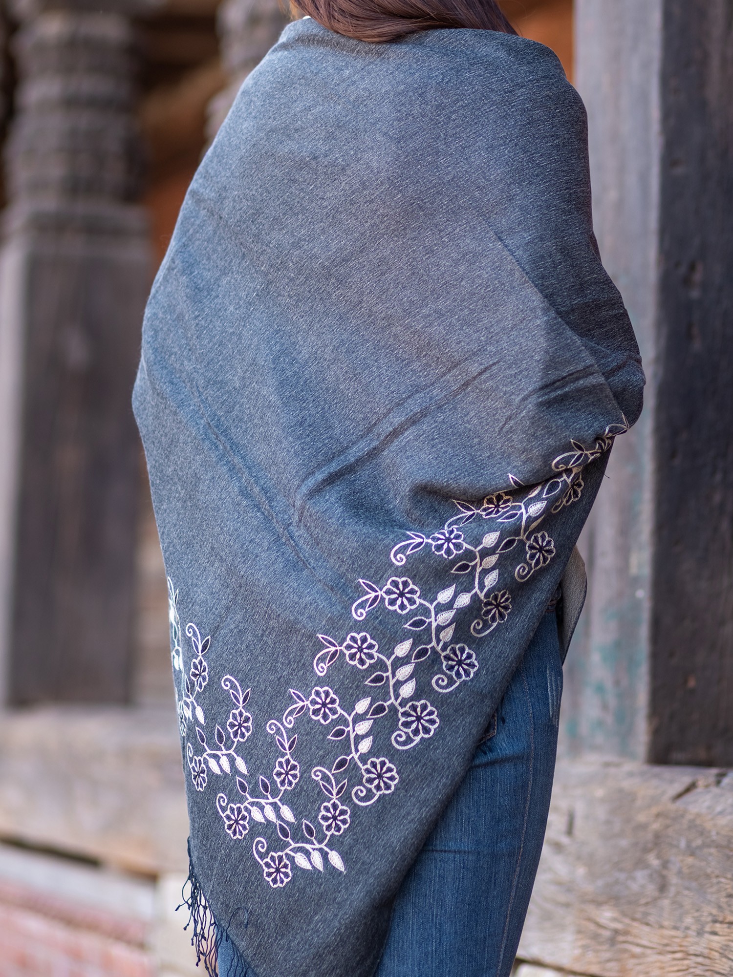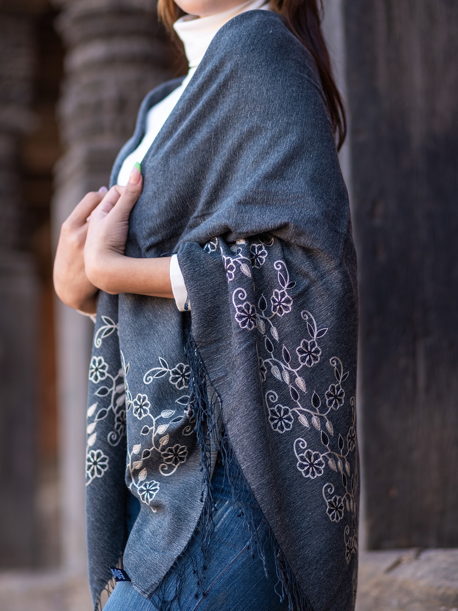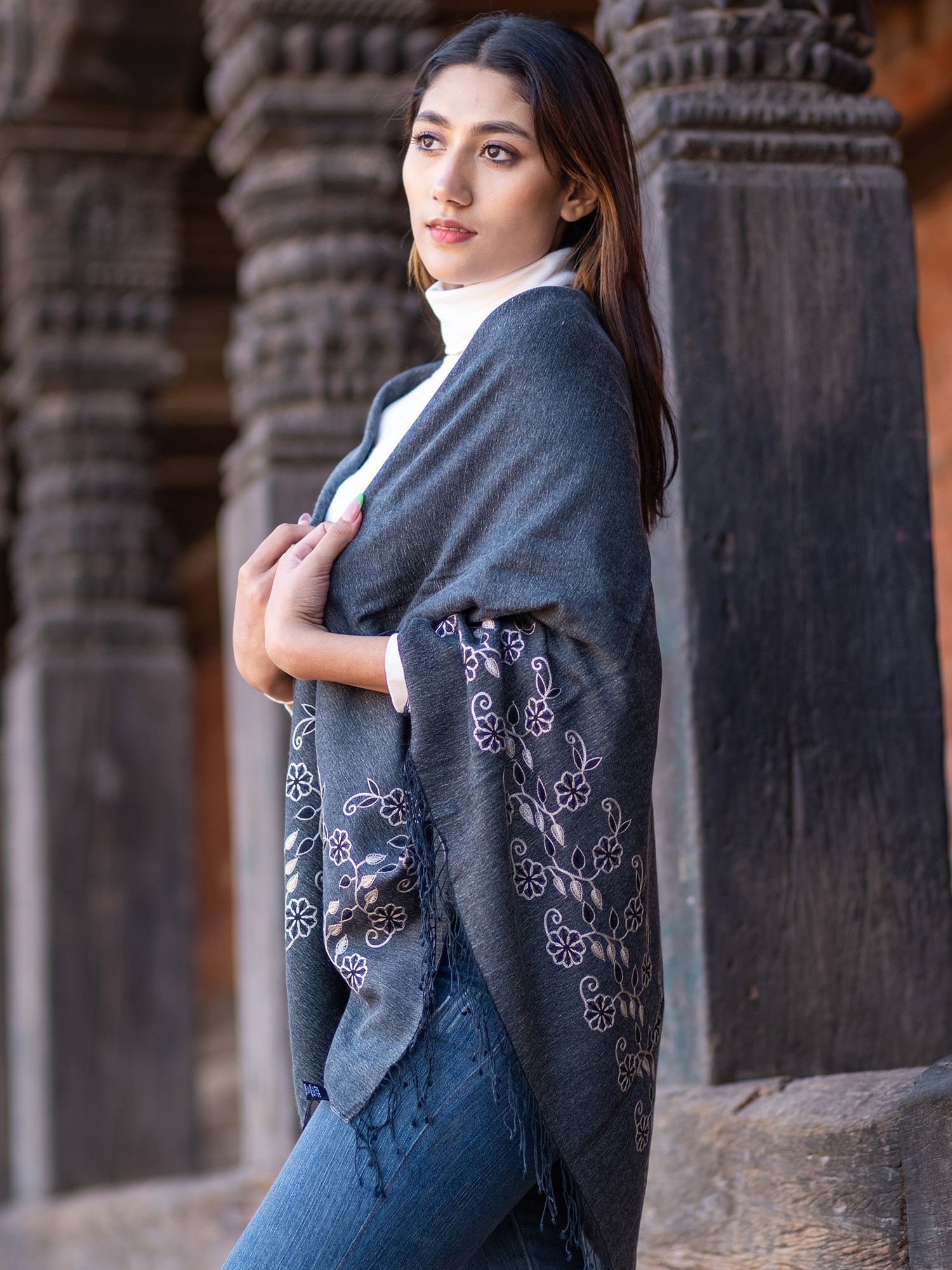 Prepare to be entranced by the allure of Nepal’s exquisite craftsmanship and the timeless elegance of a reversible pashmina silk extra-wide shawl adorned with intricate floral embroidery. The floral embroidery, painstakingly hand-embroidered into the fabric, is a testament to the region’s artisanal excellence. These shawls are a radiant fusion of traditional artistry and contemporary sophistication, promising to be the centerpiece of the wardrobe.