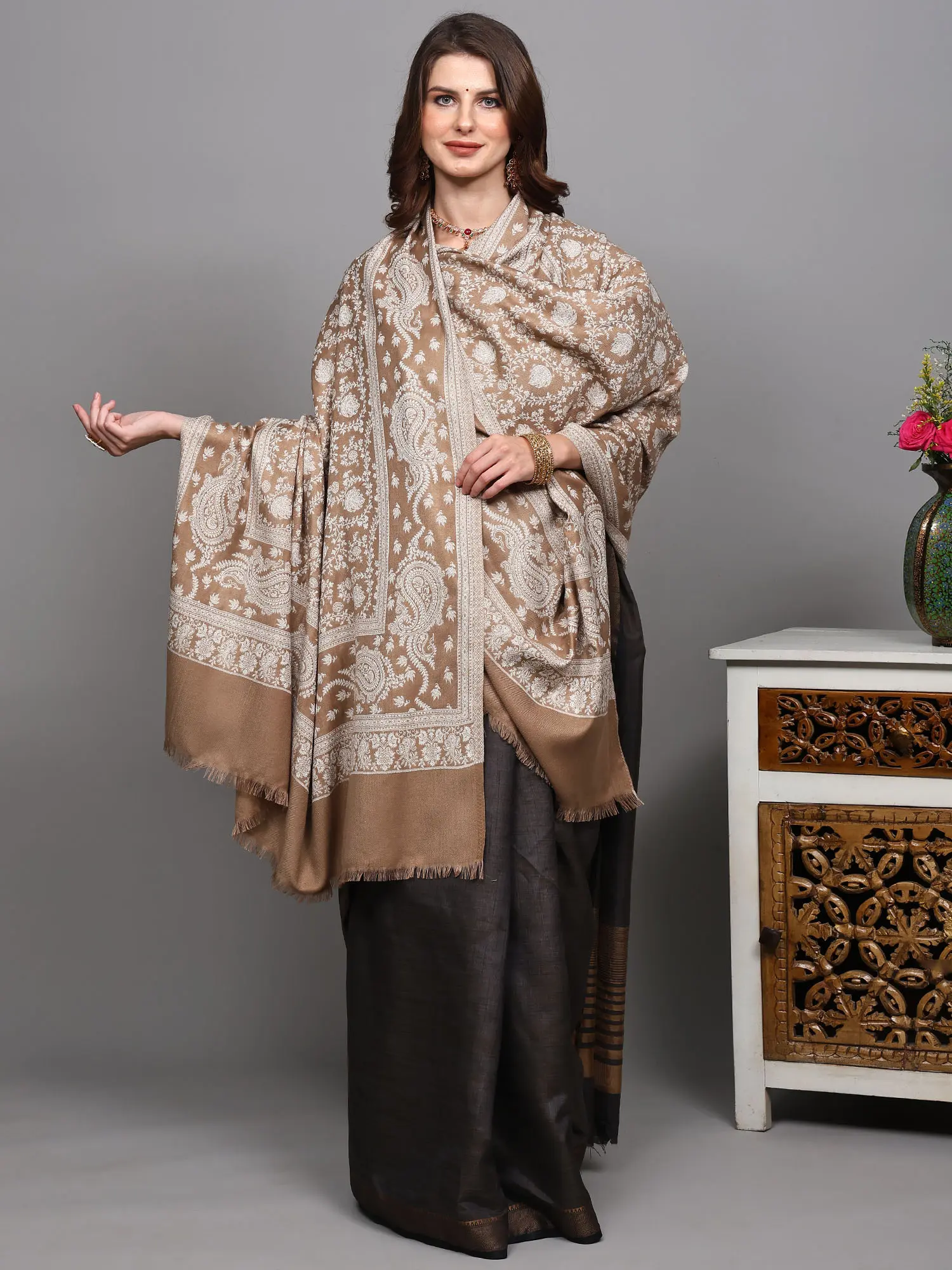 The true allure of this shawl lies in its breathtakingly detailed craftsmanship. The entire surface is adorned with an intricate woven floral jaal, a delicate network of interconnected blossoms and leaves that creates a sense of depth and natural beauty. This is beautifully complemented by a striking border featuring the iconic paisley motif, a timeless symbol of fertility and eternal life, adding a touch of regal splendor. The reversible nature of the shawl means you can enjoy this stunning design from either side, offering two distinct yet equally captivating looks. One side showcases the vibrant ochre hue, a warm and inviting shade that exudes joy and optimism, while the reverse side offers a subtle, sophisticated contrast, allowing you to adapt the shawl to your mood and outfit.